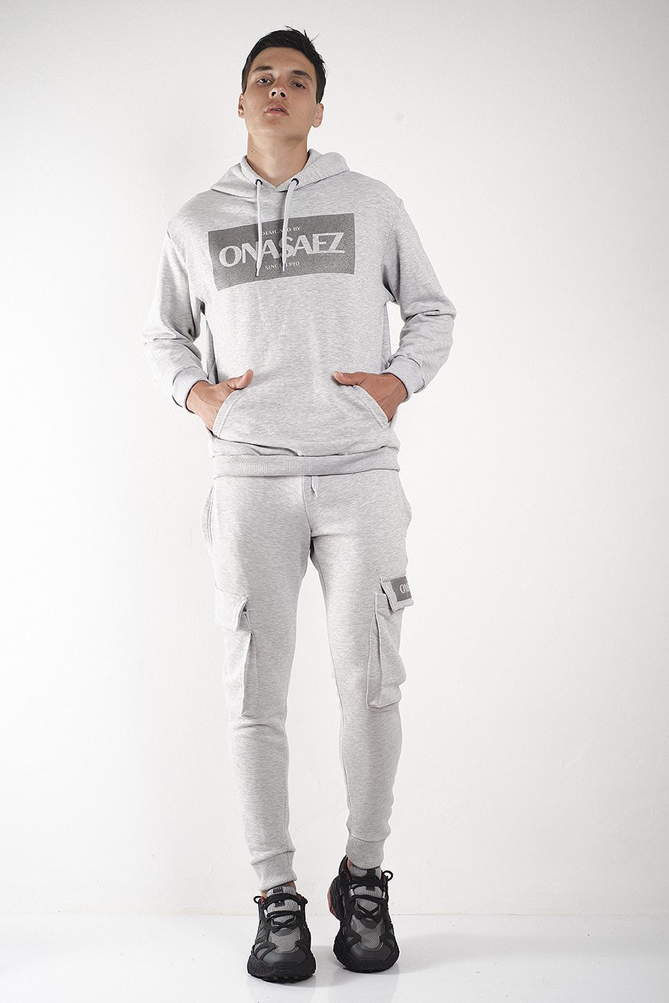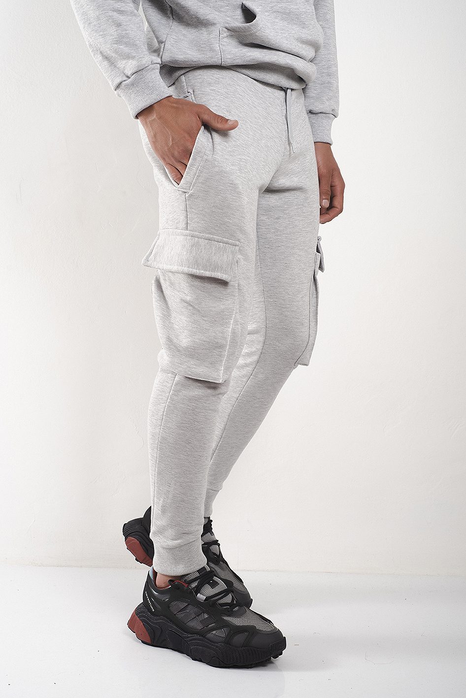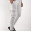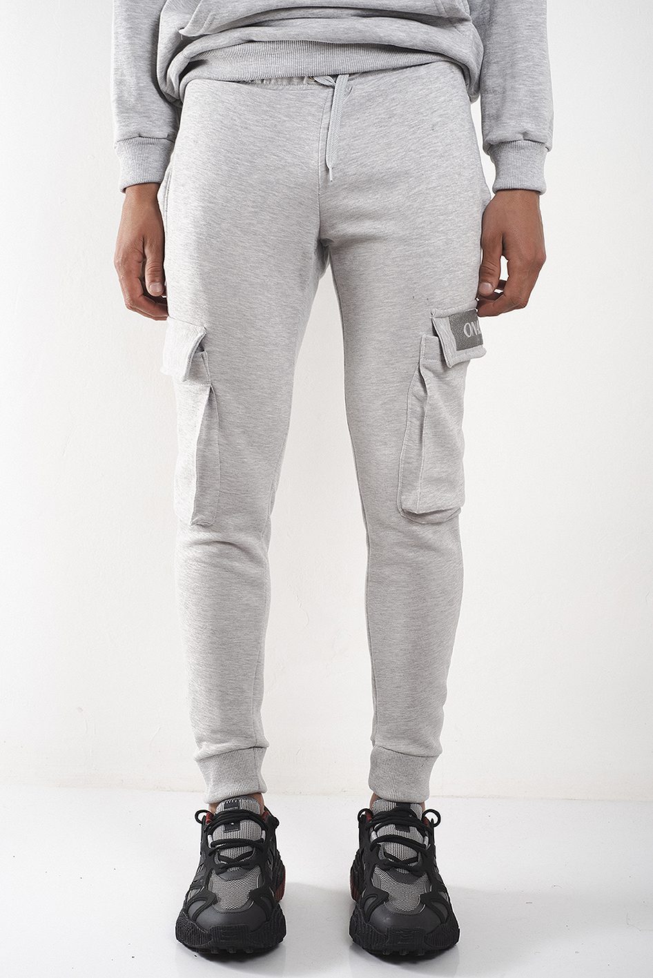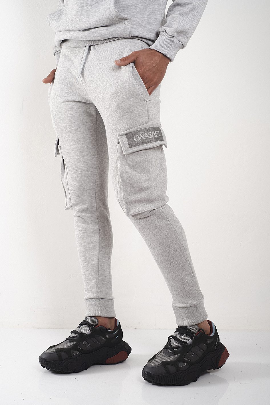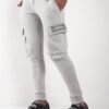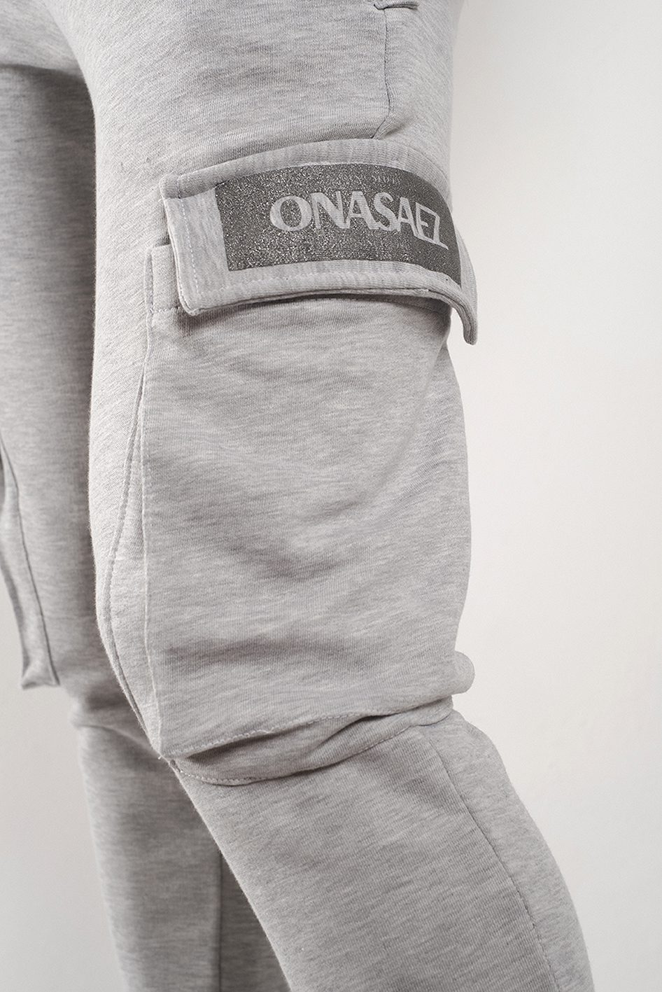 Bolsillo tipo cargo en los laterales con estampa metalizada a tono de logo de marca.