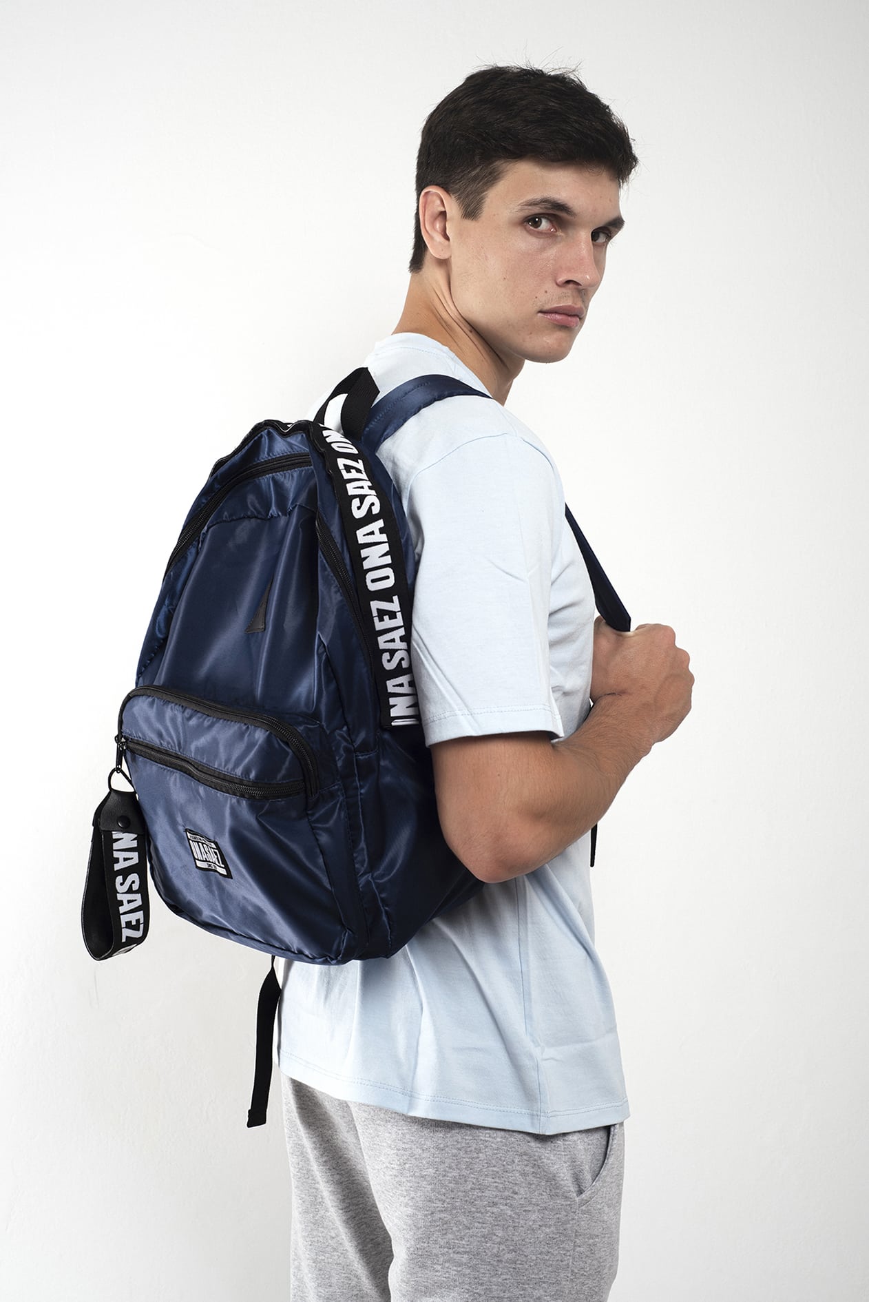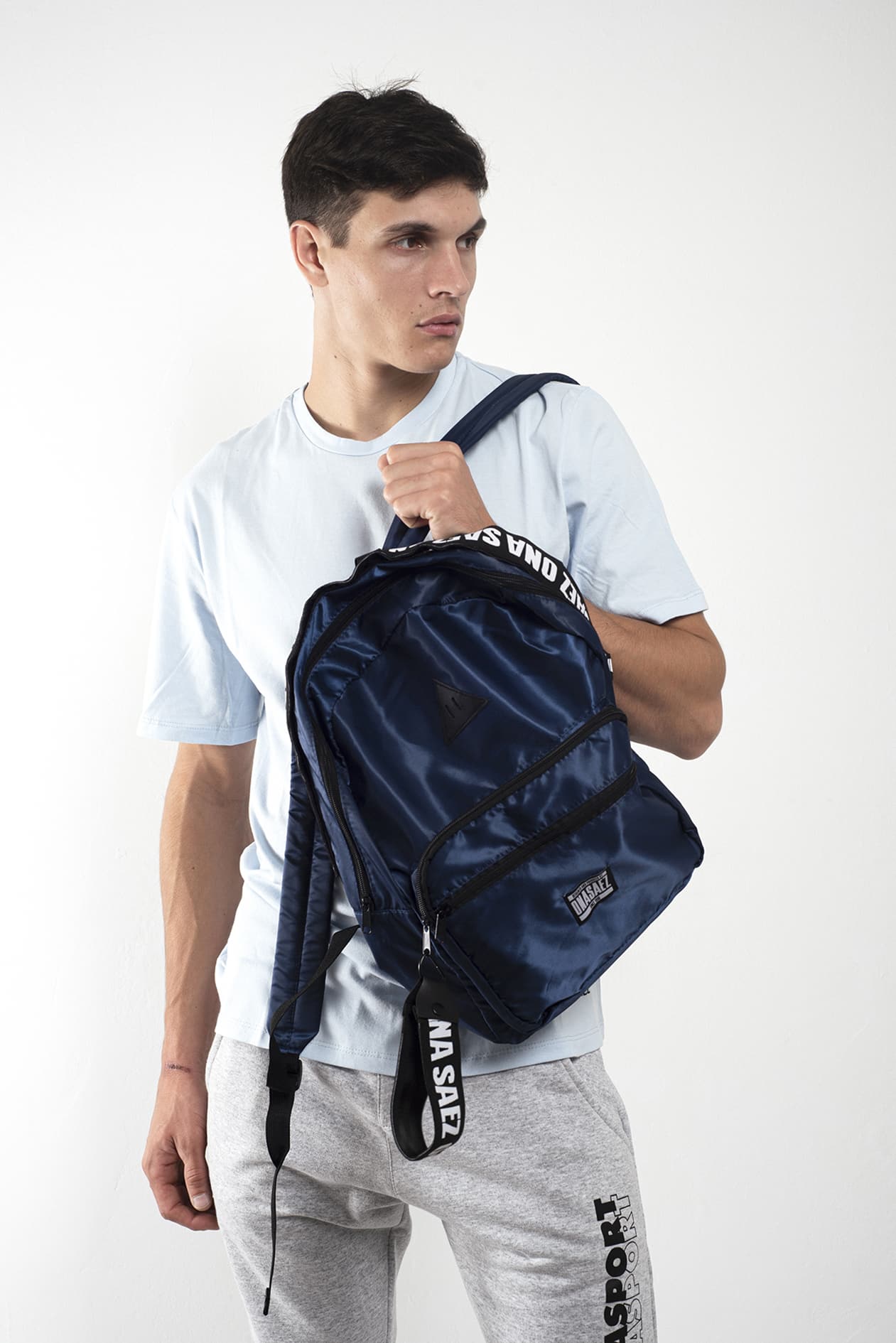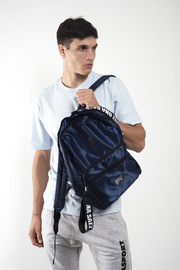 Bolsillo frontal con cierre, manija en la parte superior y tiras ajustables para los hombros.