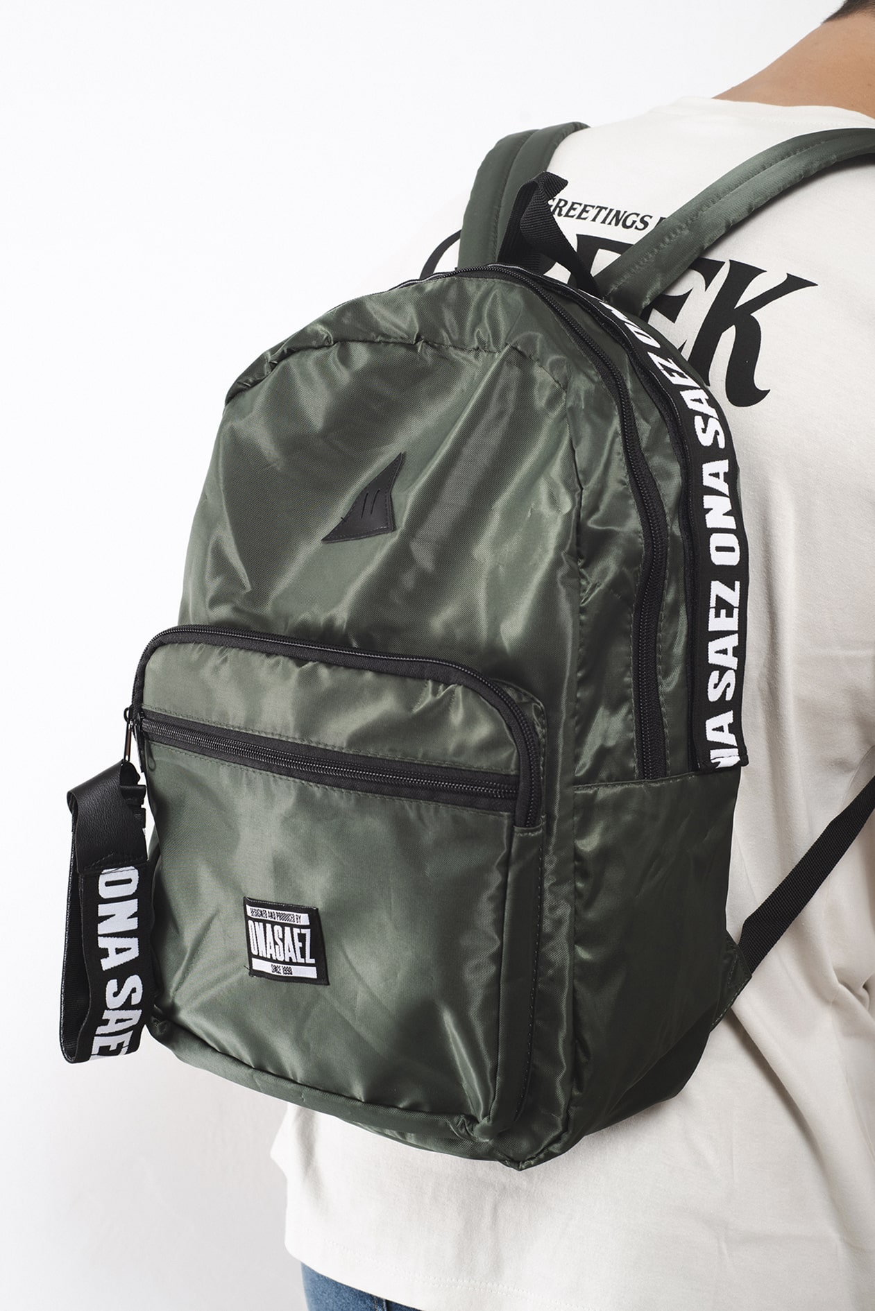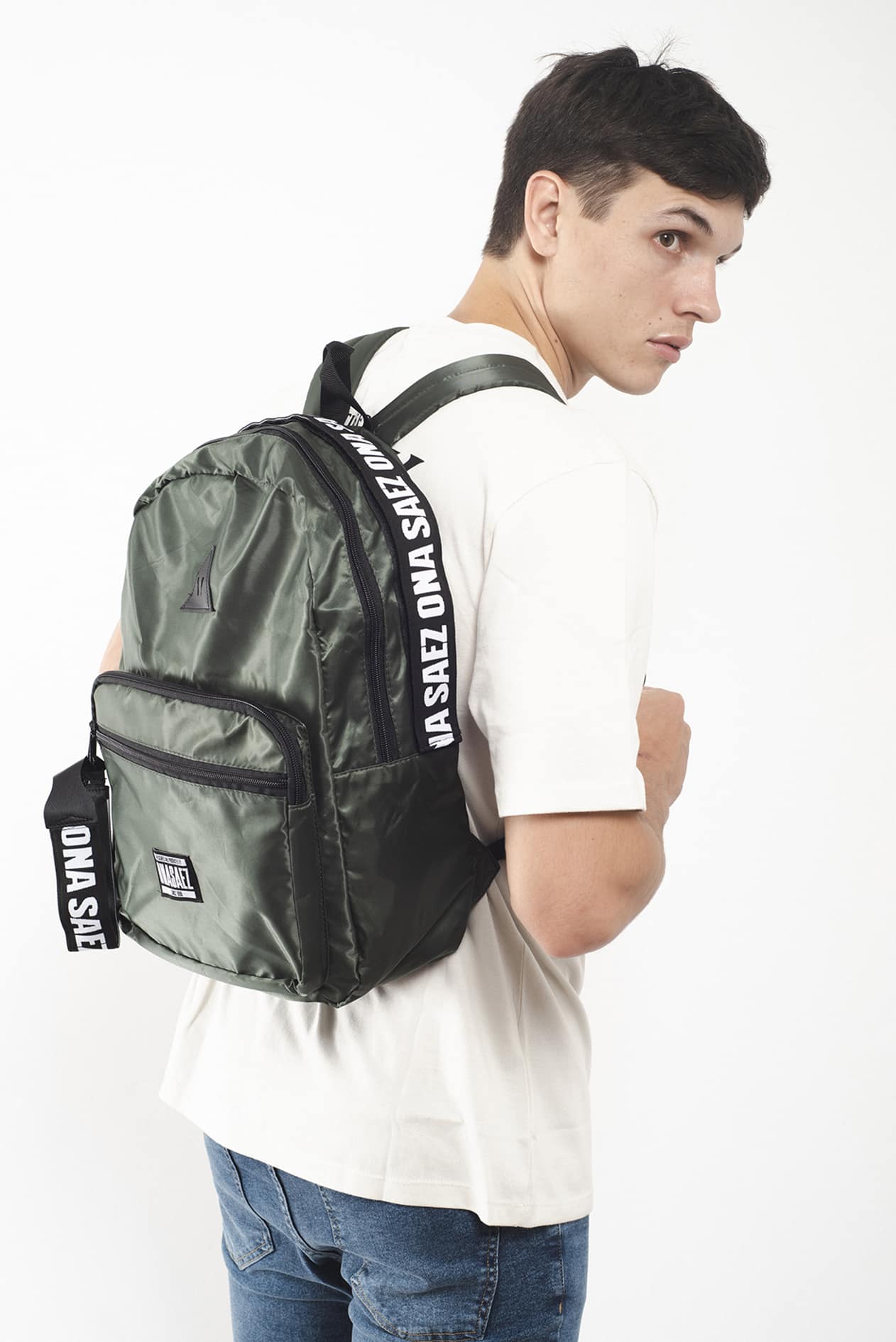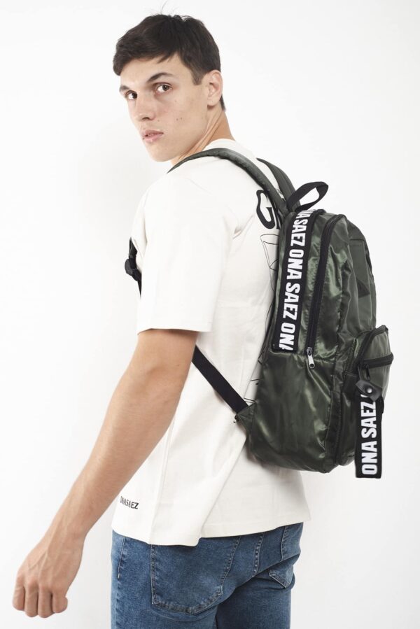 Bolsillo frontal con cierre, manija en la parte superior y tiras ajustables para los hombros.