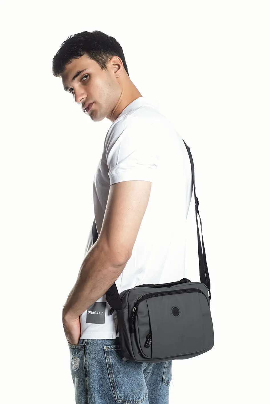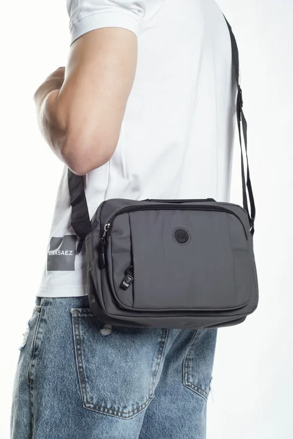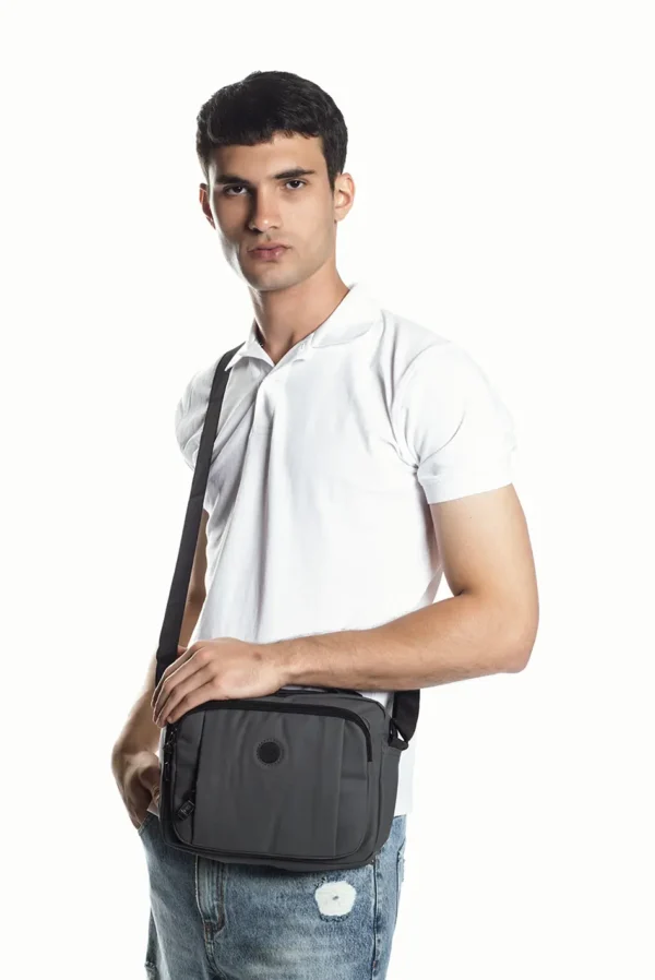 Bolso mediano confeccionado en poliéster engomado 100%, color gris.