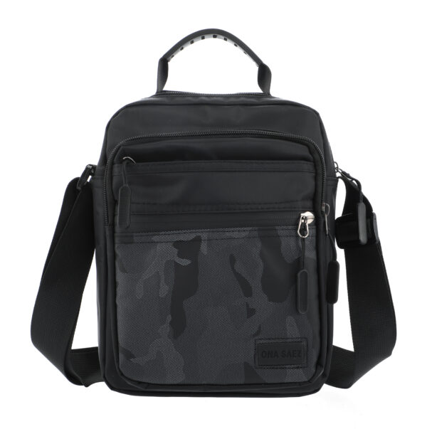 Bolso mediano confeccionado en poliéster 100%, color negro con diseño camuflado.