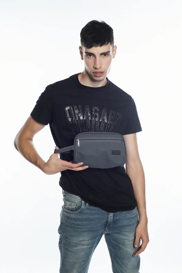 Neceser confeccionado en P.U con acabado engomado color gris, que le proporciona una resistencia excepcional y un acabado elegante.