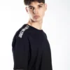 Detalle de cinta de marca bordada a contra tono a lo largo de los hombros.