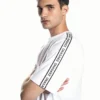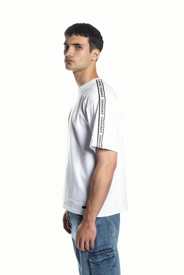 Detalle de cinta de marca bordada a contra tono a lo largo del hombro y la manga.