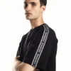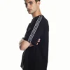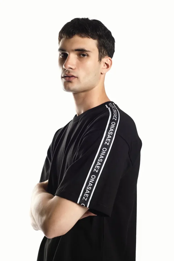 Detalle de cinta de marca bordada a contra tono a lo largo del hombro y la manga.
