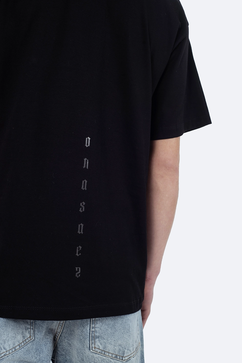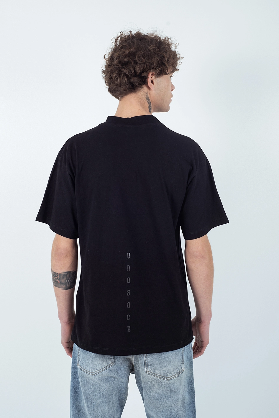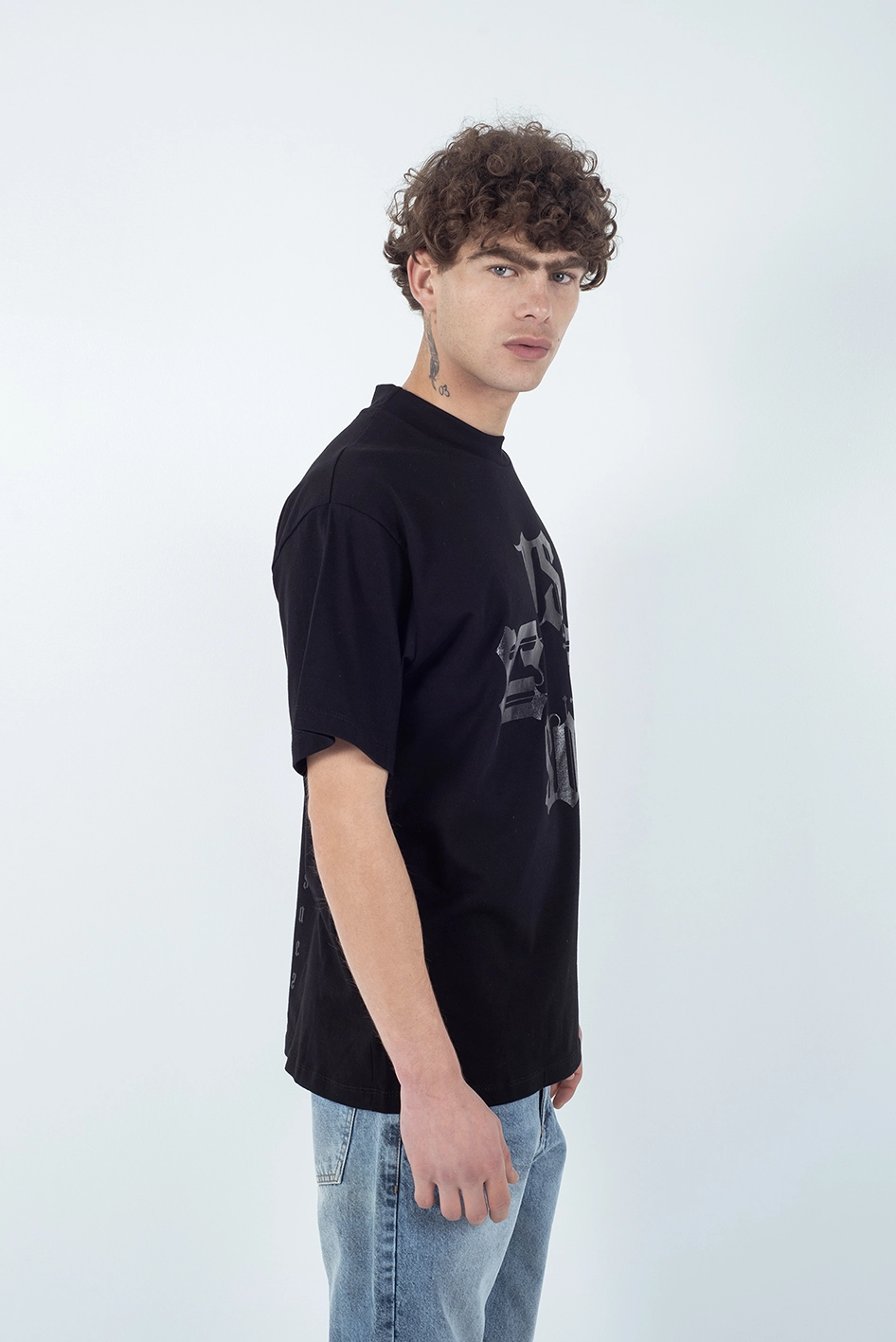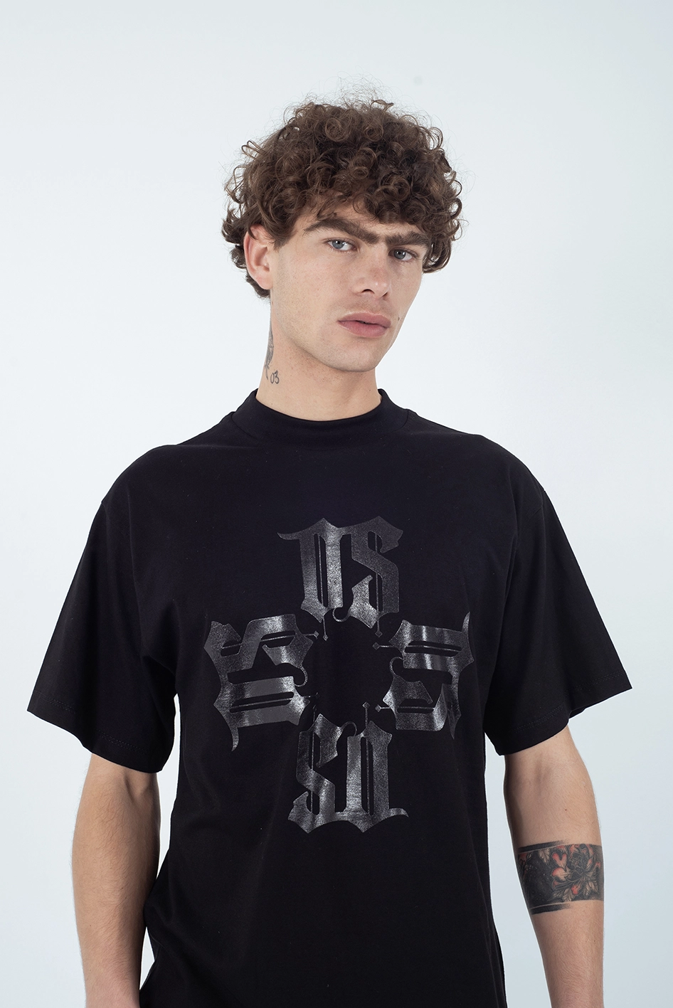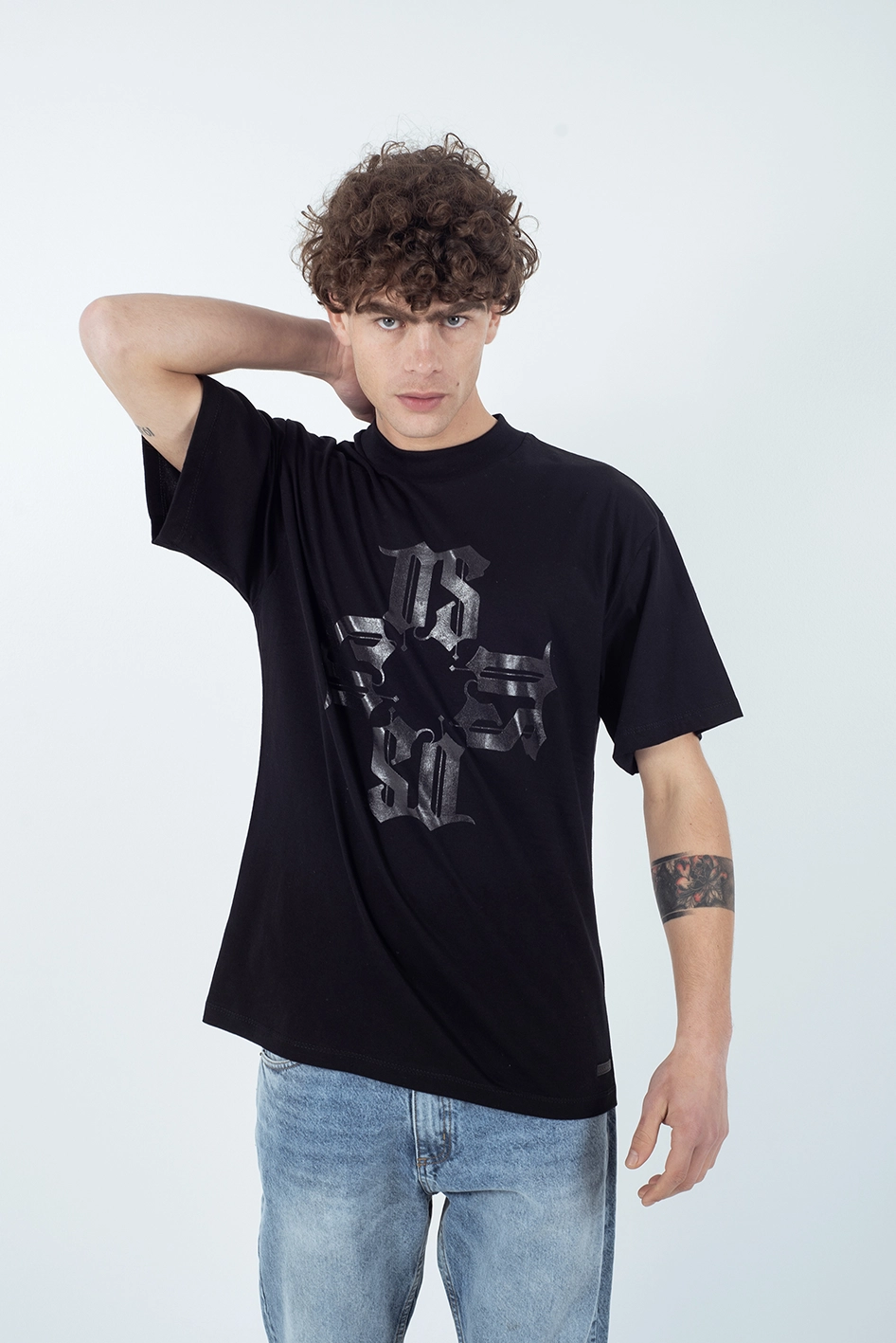 Remera regular fit confeccionada en 100% algodón, con cuello redondo y mangas cortas. Presenta un estampado frontal en tipografía gótica que forma una composición en cruz con las iniciales de la marca, junto a un estampado a tono en la espalda, que aportan un estilo urbano y contemporáneo.
