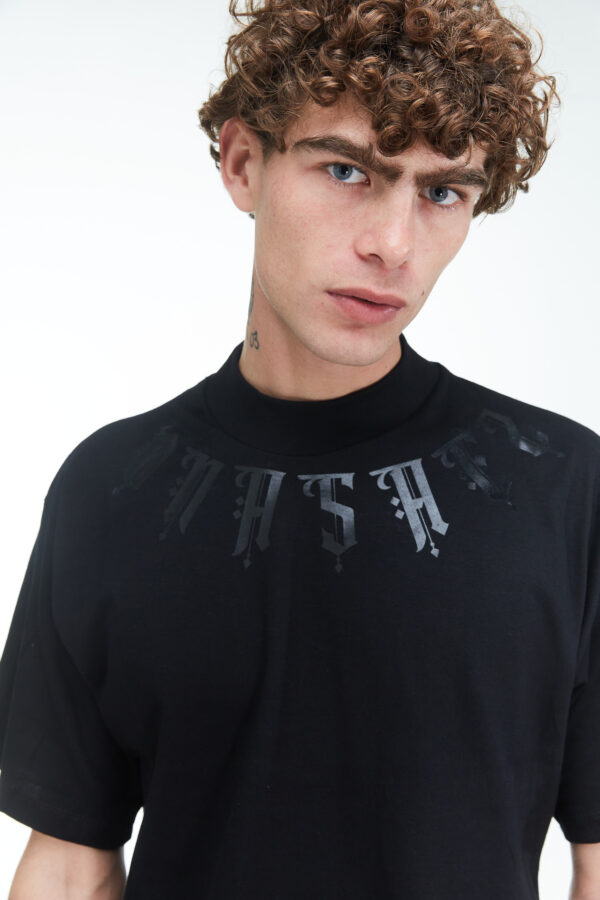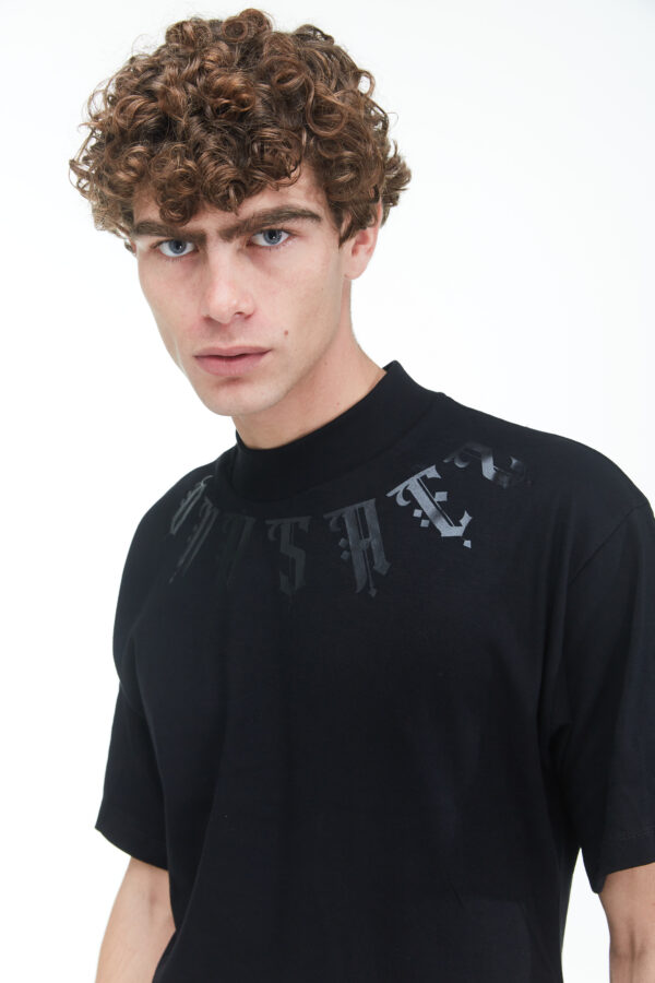 El diseño se caracteriza por un estampado a tono en la parte frontal superior, con tipografía góticade de logo de marca, añadiendo un toque moderno y distintivo sin romper con la estética minimalista.