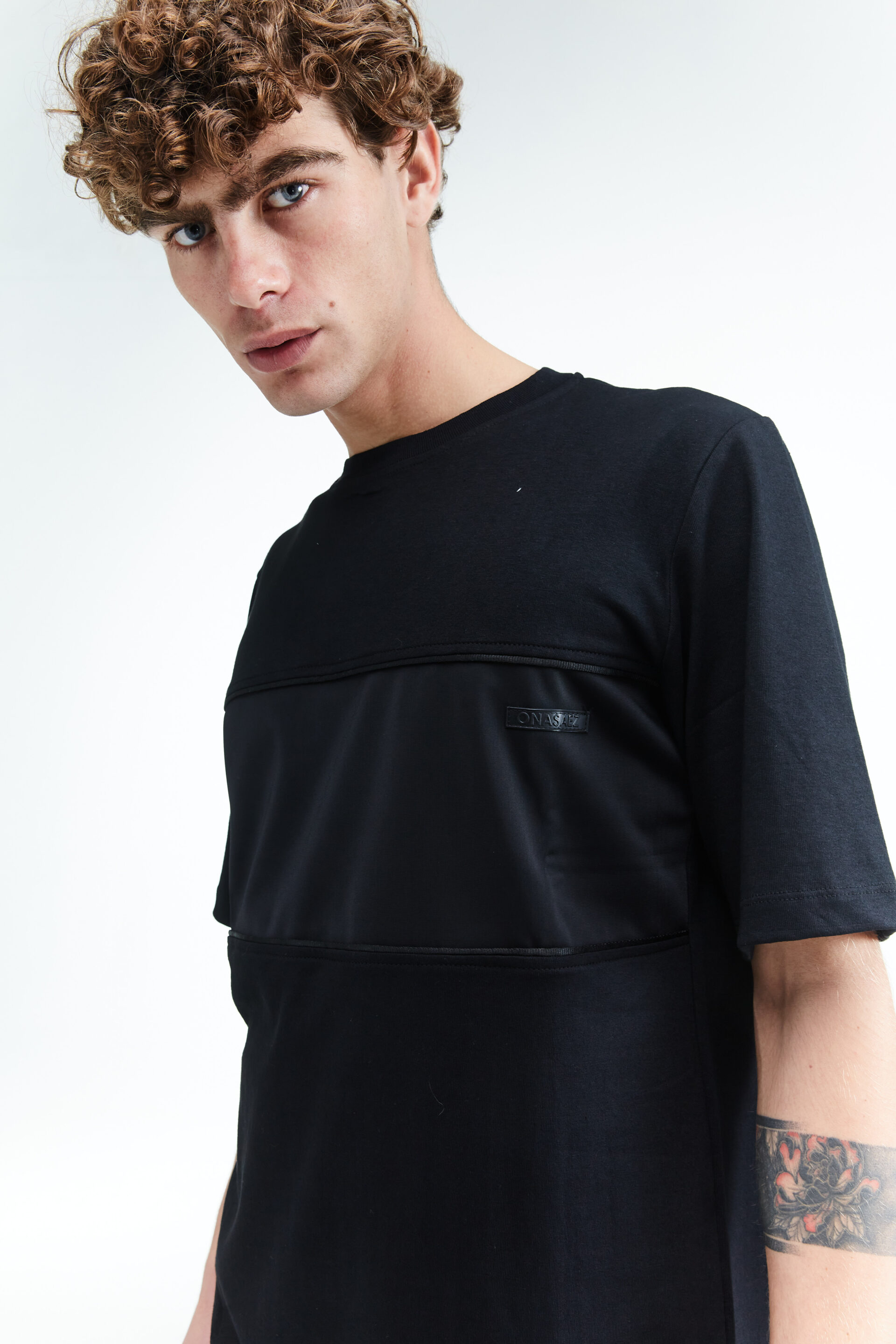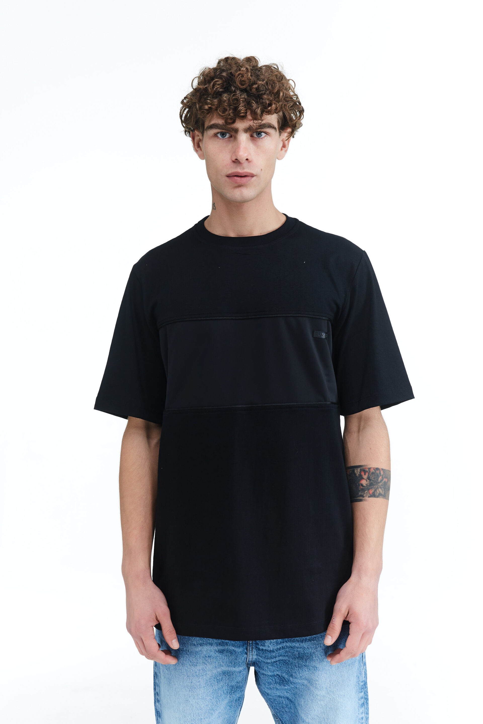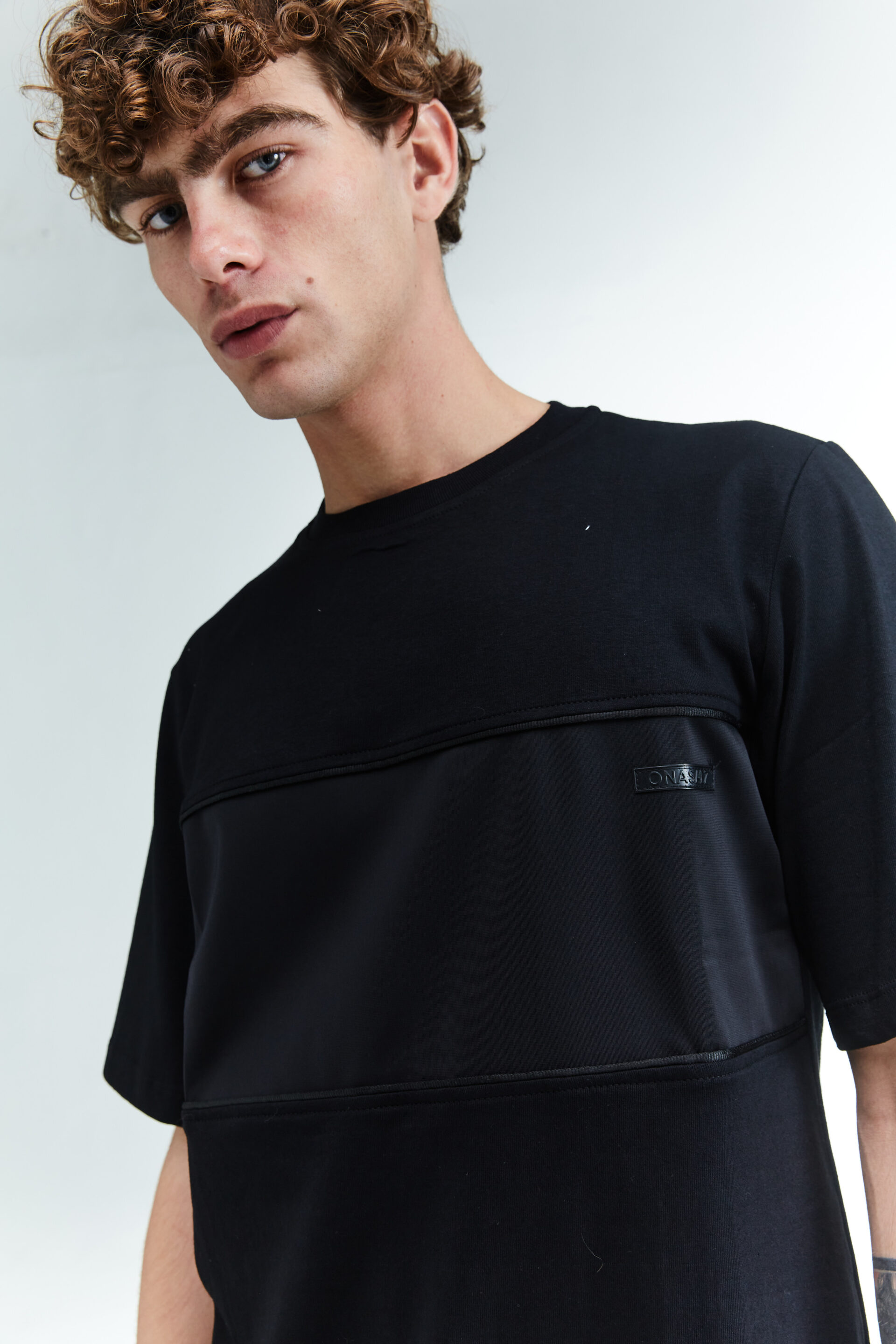 Confeccionada en algodón suave combinado con un panel frontal de textura técnica, esta remera se destaca por su diseño minimalista con detalles de confección que marcan la diferencia. El contraste de telas, junto con las costuras expuestas y el sutil logo en relieve, aportan un toque moderno y distintivo.