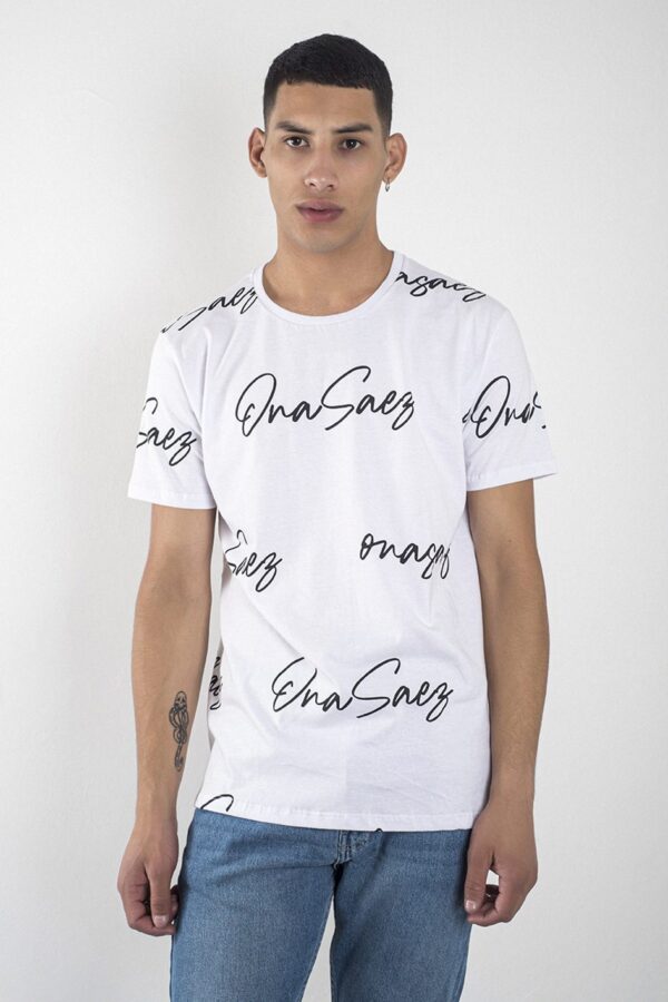 Full estampa a contratono (frente, espalda, mangas) con presencia de marca en letra cursiva.