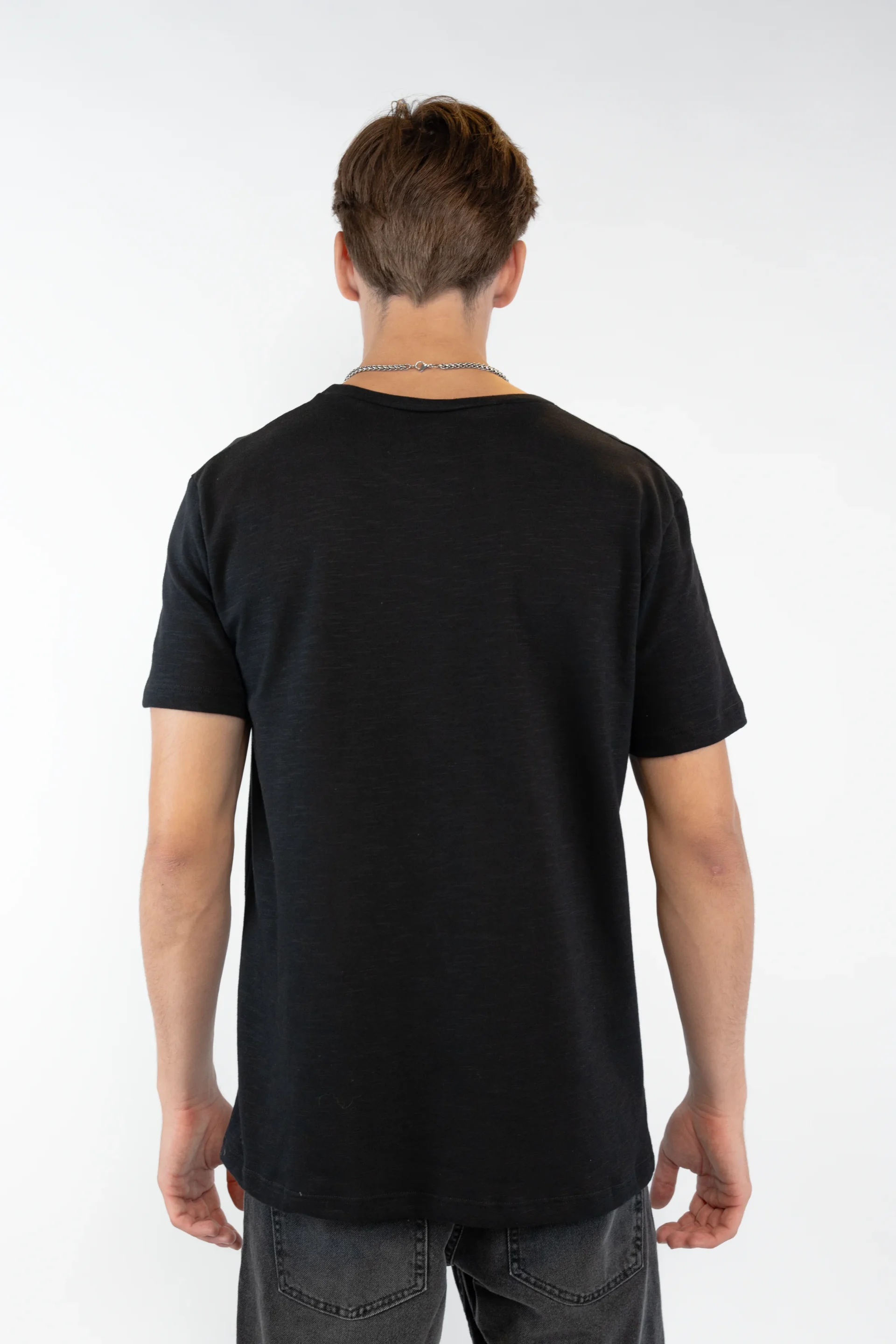 Remera corte slim, cuello redondo y manga corta, confeccionada en 100% algodón heavy con efecto flame, de un grosor alto, lo que significa que es lo suficientemente resistente como para ofrecer durabilidad, pero al mismo tiempo es suave al tacto.