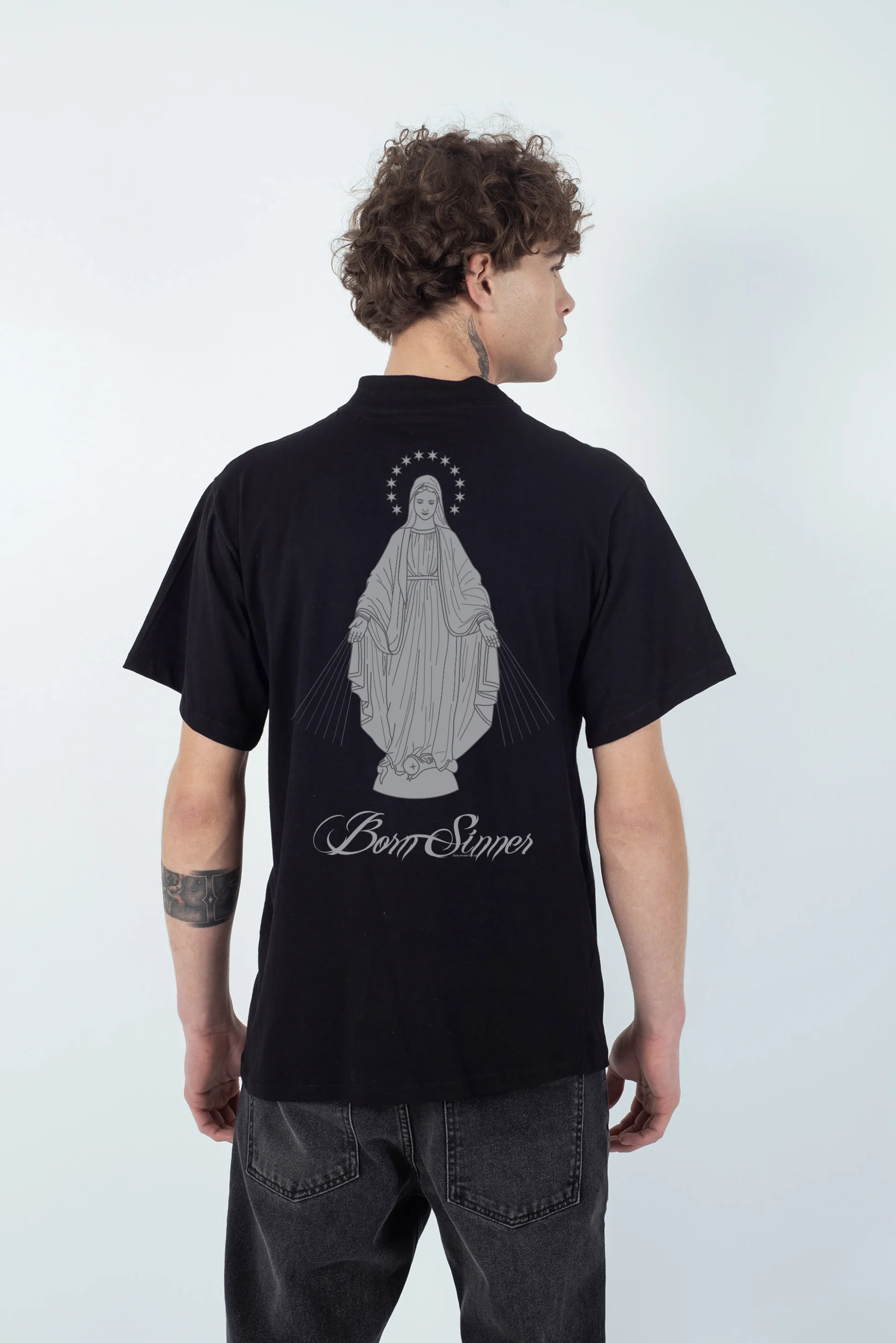Presenta un estampado “shimmer” con acabado brillante y efecto metalizado en el frente y una estampa con la imagen de una virgen en la espalda, logrando una estética urbana con mucha actitud.
