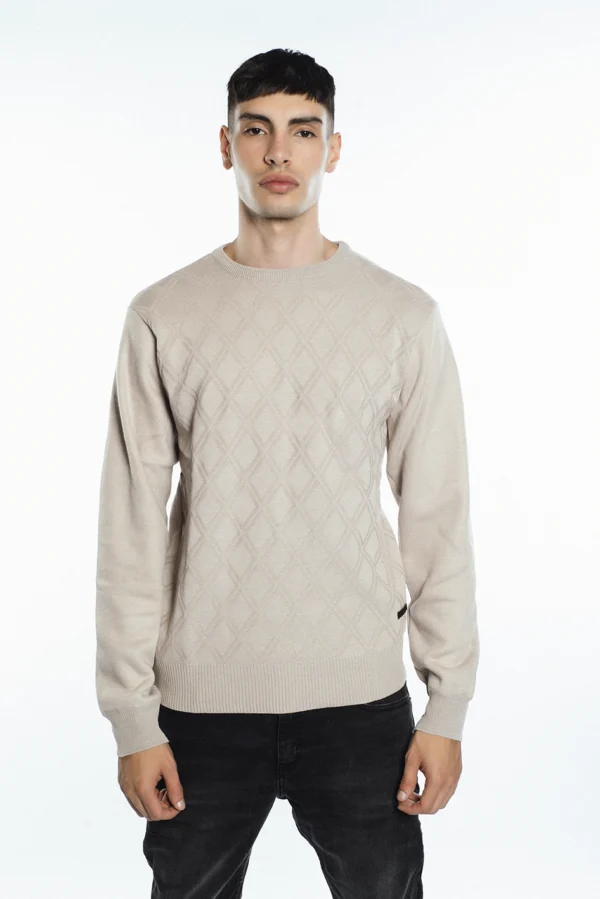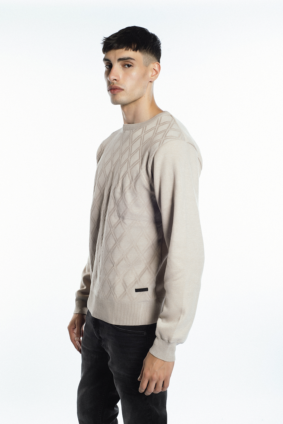 Este sweater de punto en color visón se destaca por su diseño sofisticado y atemporal. Con una sutil trama de rombos en relieve y su interior frizado aporta textura y elegancia a cualquier look. Su confección en tejido suave garantiza comodidad, mientras que el cuello redondo y los acabados en rib aseguran un ajuste impecable.
