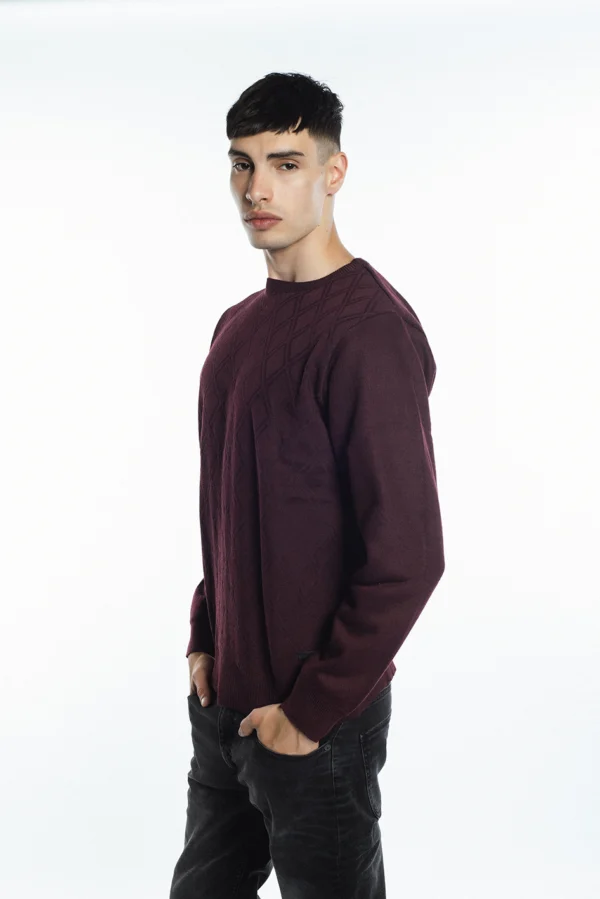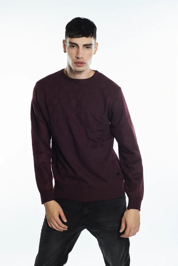 Este sweater de punto en color bordo se destaca por su diseño sofisticado y atemporal. Con una sutil trama de rombos en relieve y su interior frizado aporta textura y elegancia a cualquier look. Su confección en tejido suave garantiza comodidad, mientras que el cuello redondo y los acabados en rib aseguran un ajuste impecable.
