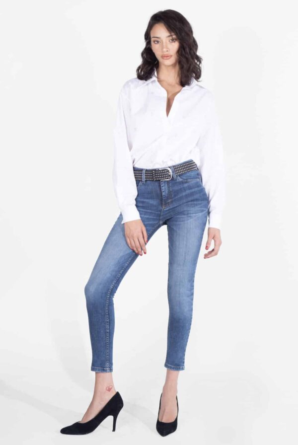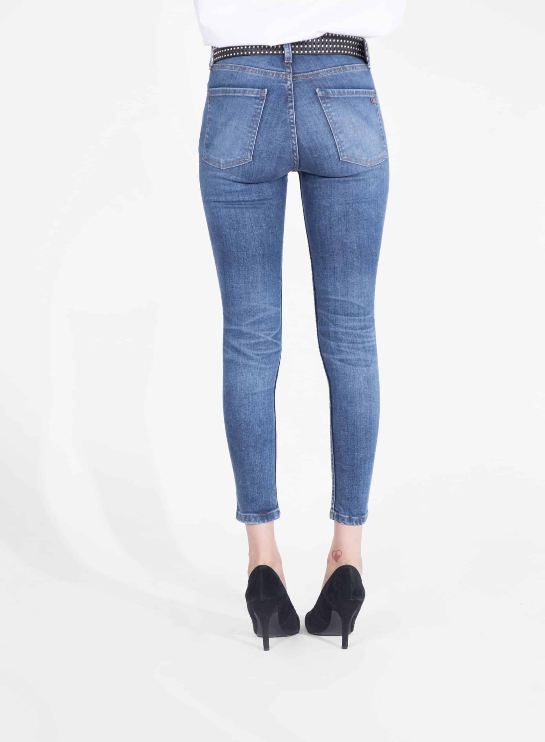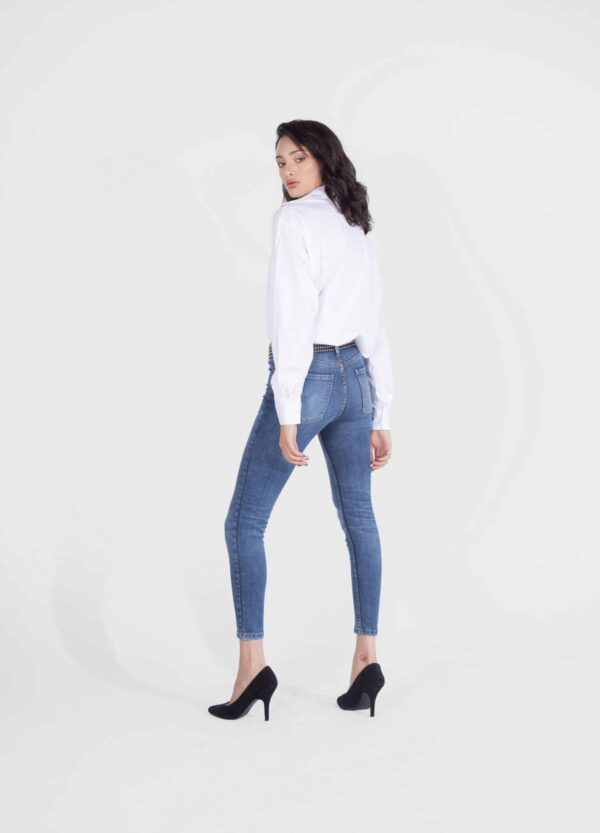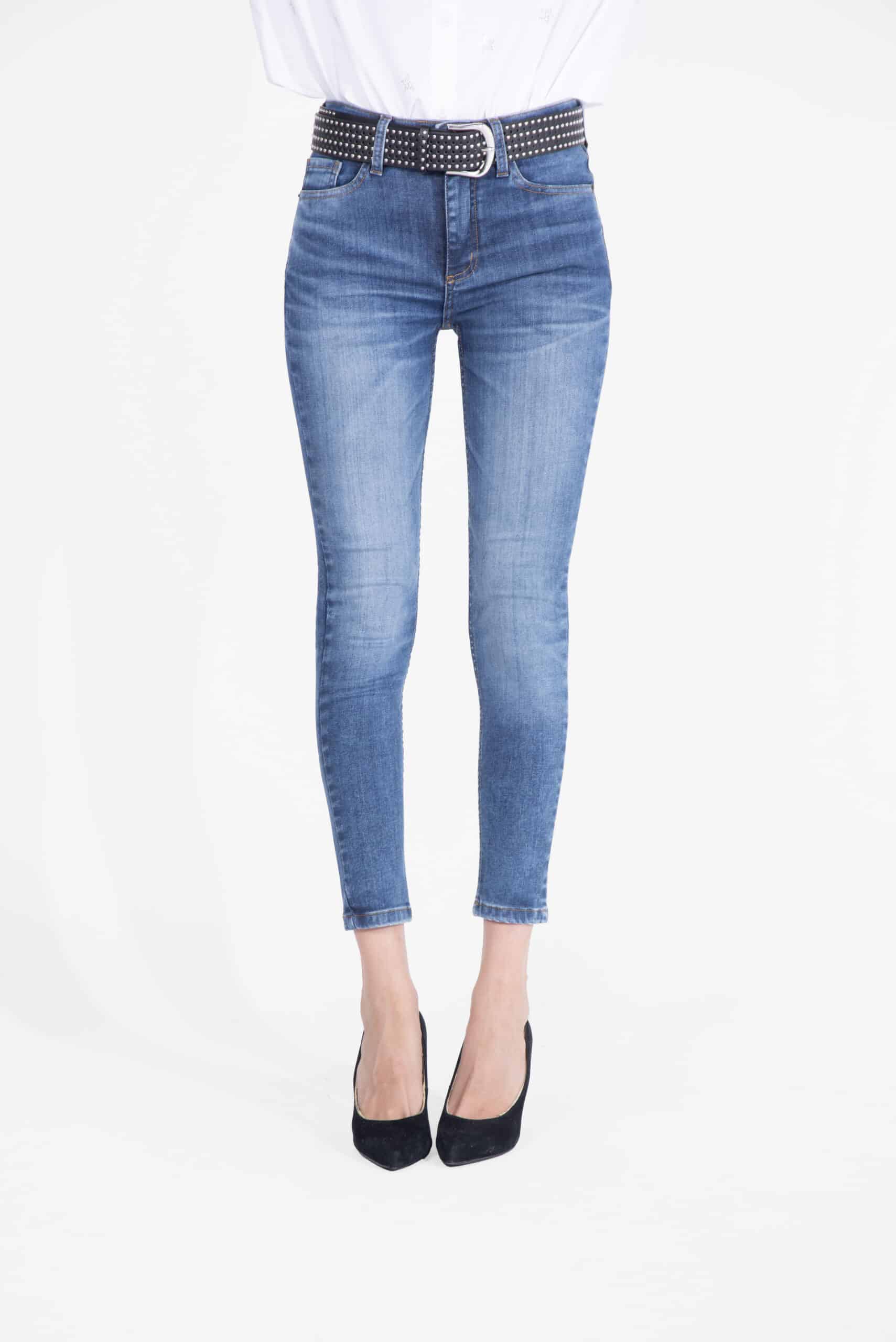 Jean skinny tiro medio, confeccionado en Denim de algodón elastizado (tejido stretch) 98% algodón, 2% elastano.