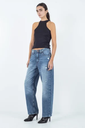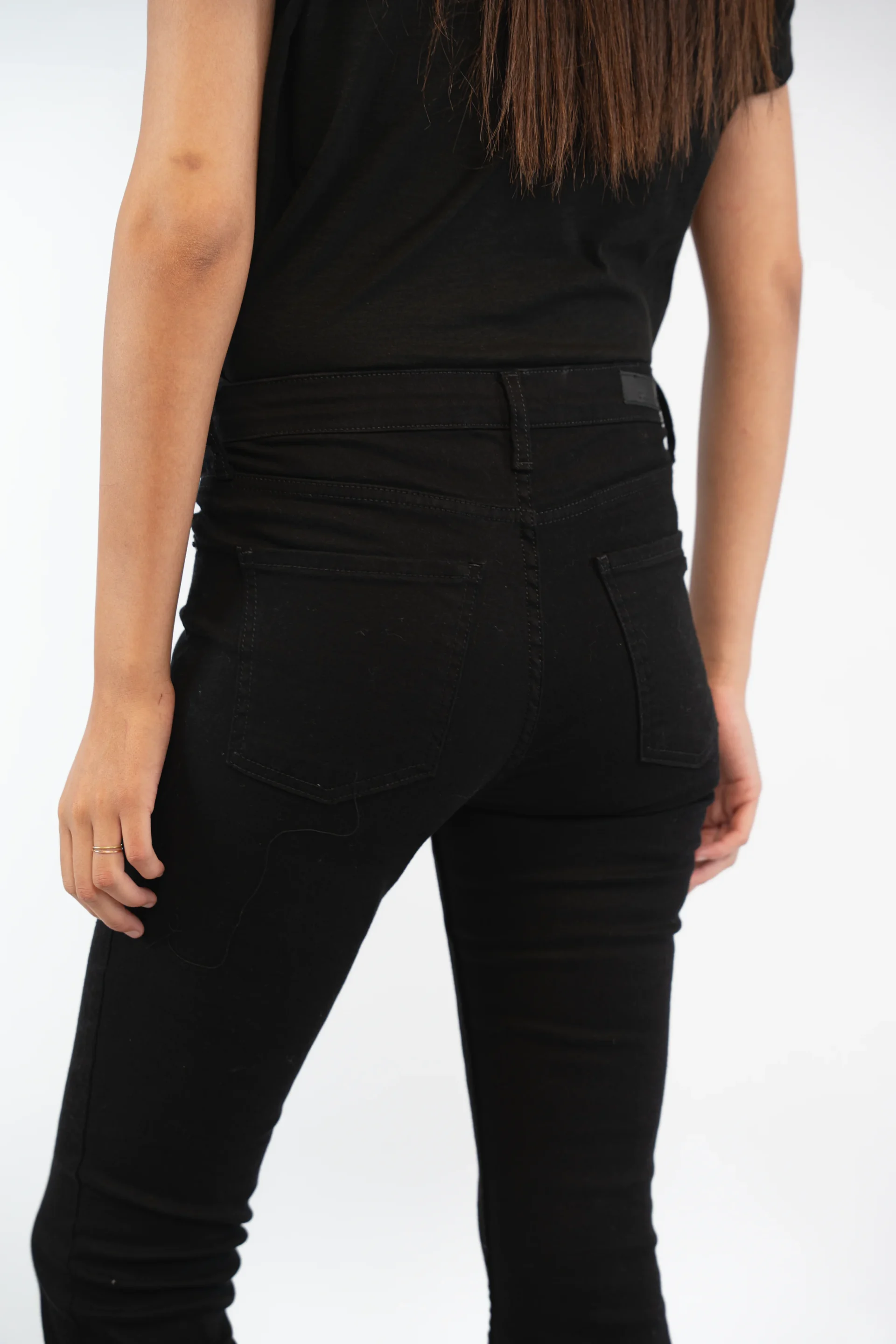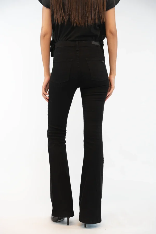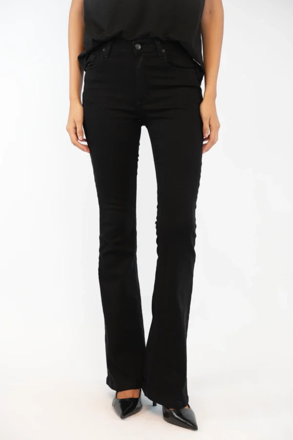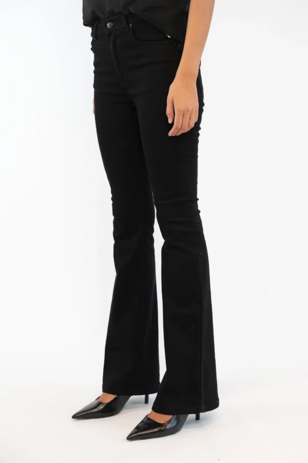 Jean tiro medio calce bootcut que estiliza la silueta, confeccionado en Denim de algodón elastizado color negro intenso (tejido super stretch) 98% algodón, 2% elastano.
