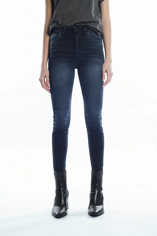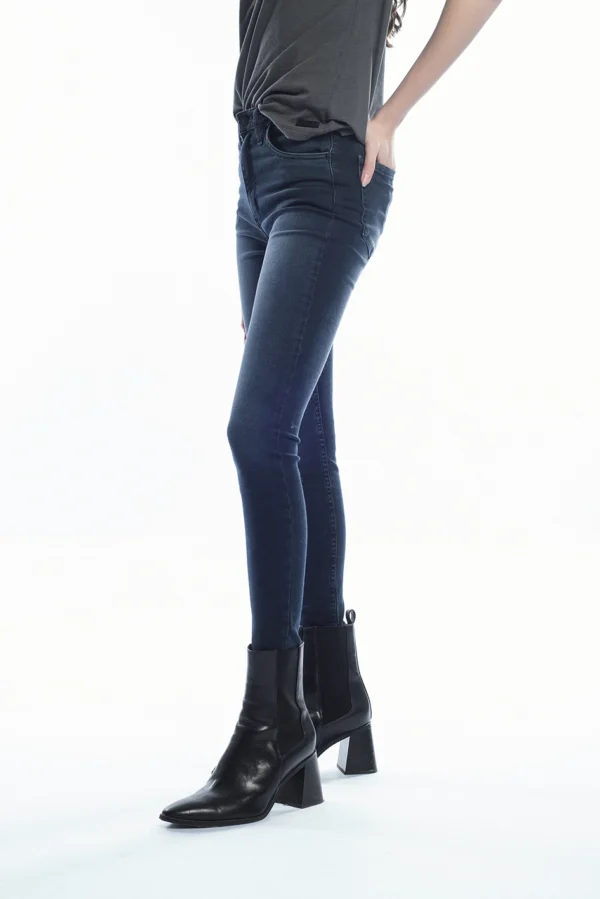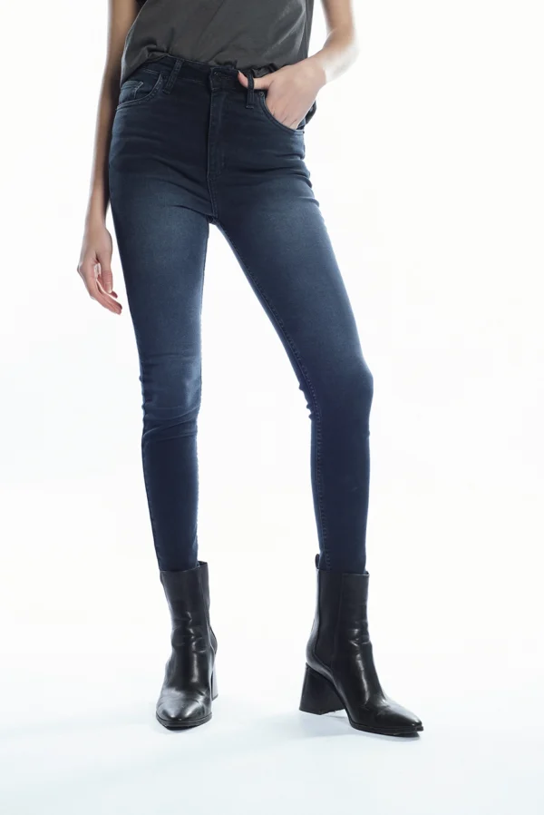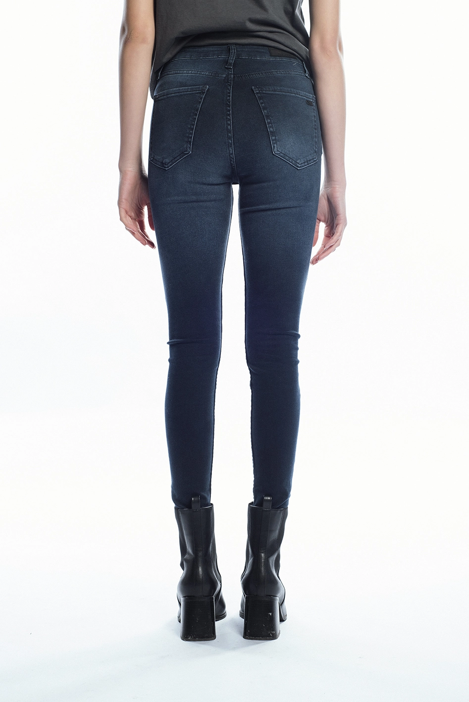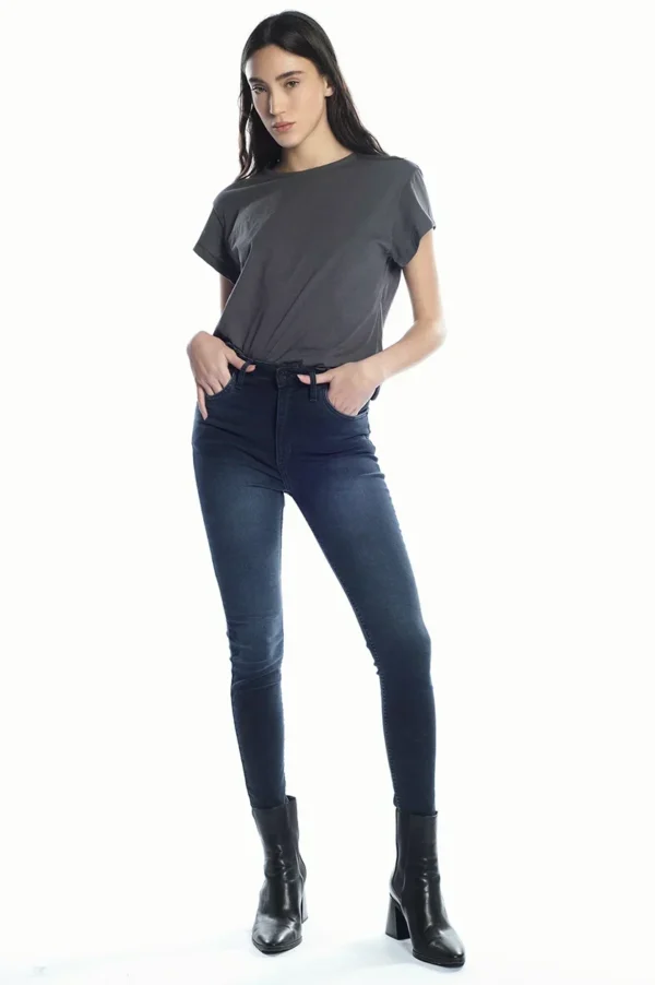 Jean de corte skinny y tiro alto, confeccionado en denim de algodón elastizado super stretch (98% algodón, 2% elastano), que se adapta al cuerpo realzando la silueta con total comodidad.
