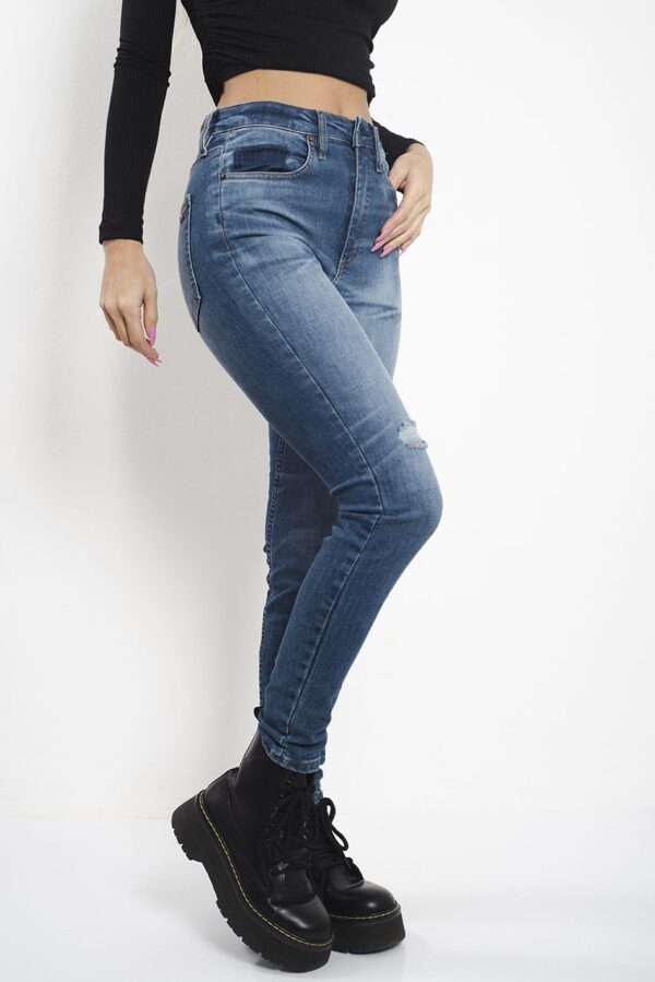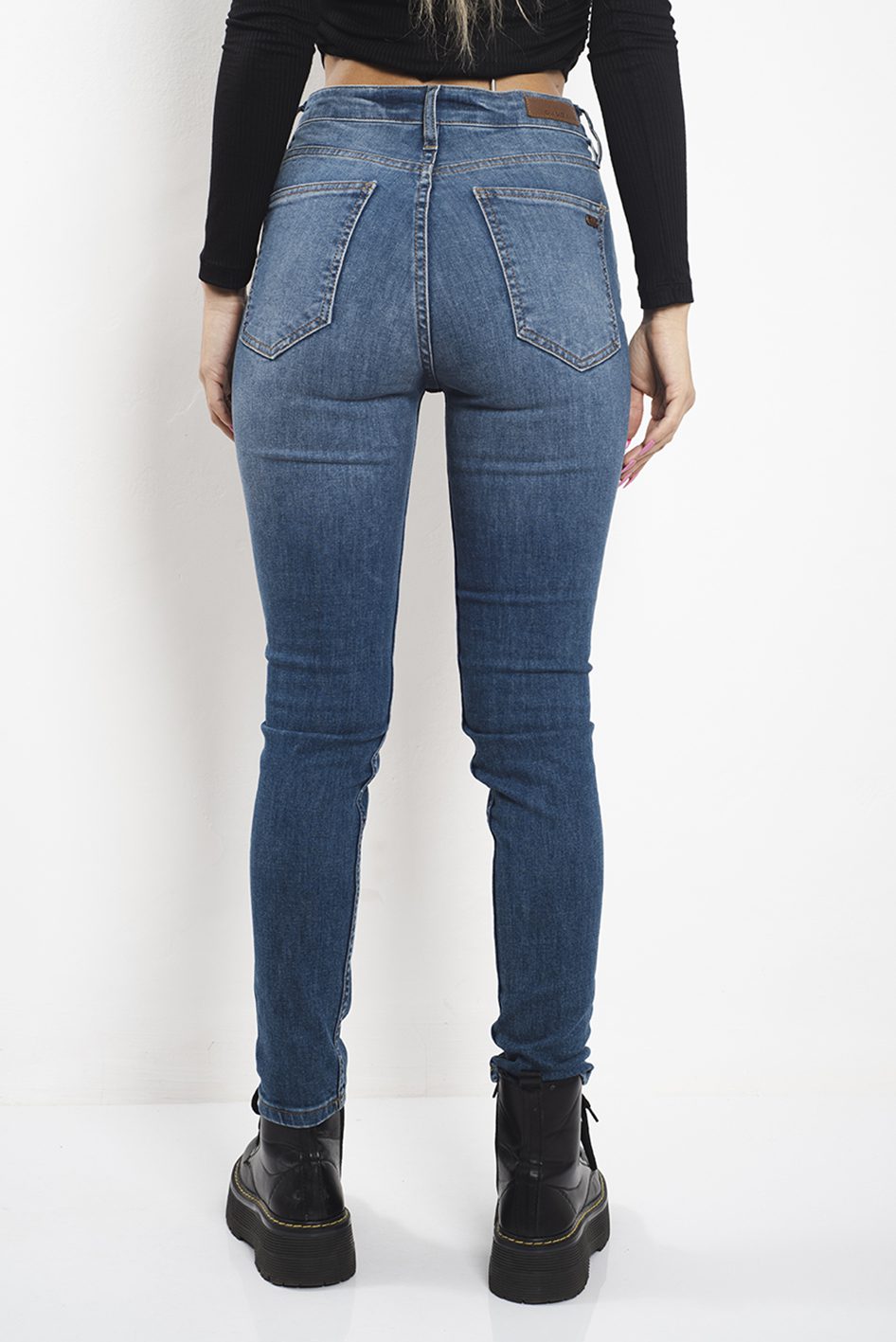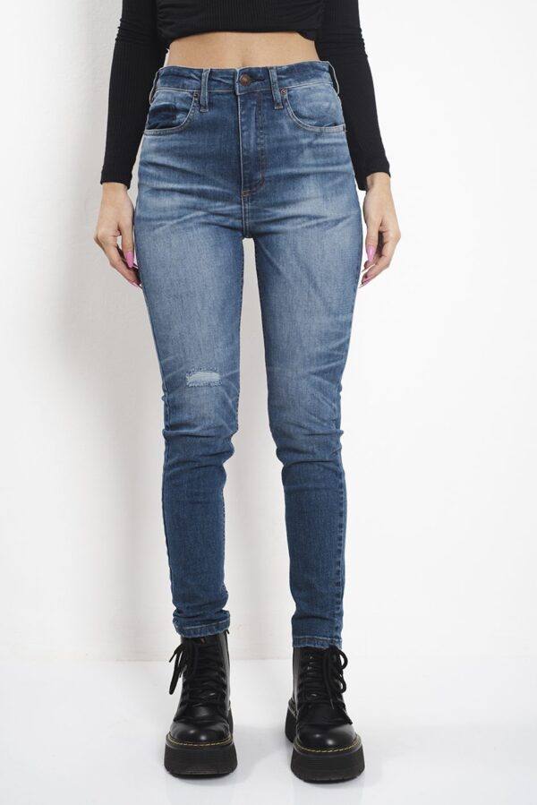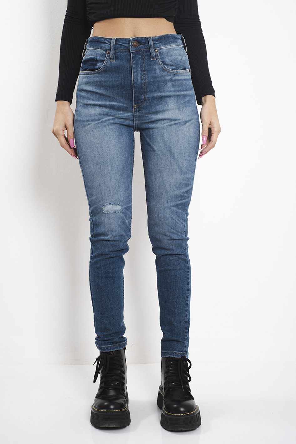 Jean super skinny tiro alto, con cinco bolsillos cierre frontal con cremallera y botón metálico de marca.