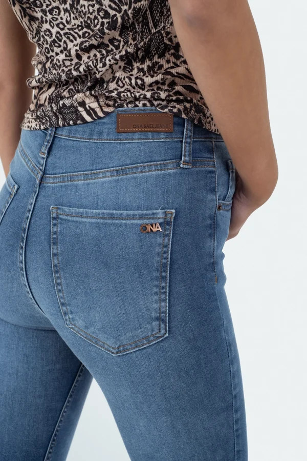 Presenta un lavado celeste intenso, con detalles de bigotes láser y localizado que aportan un efecto desgastado sutil y moderno. De largo tobillero, con terminaciones prolijas y bolsillos clásicos. Ideal para armar looks versátiles tanto de día como de noche.