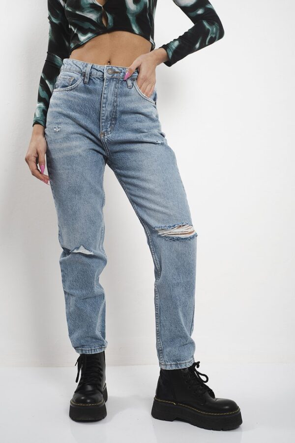 Jean Mom fit tiro alto, con cinco bolsillos cierre frontal con cremallera y botón metálico de marca.