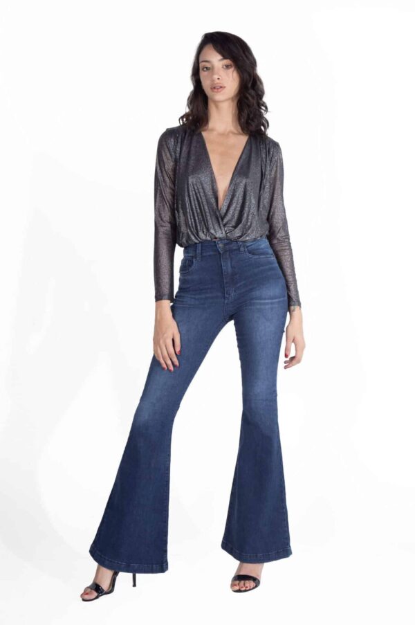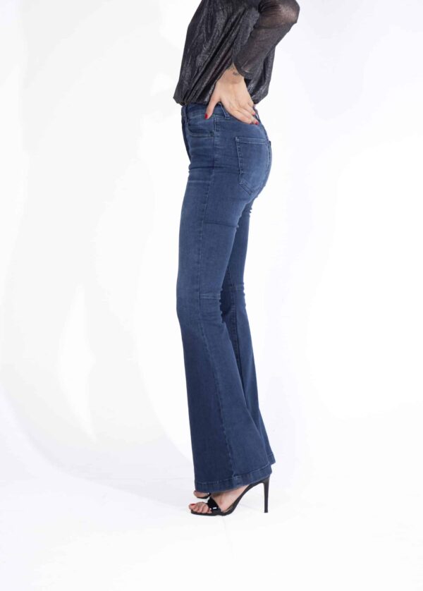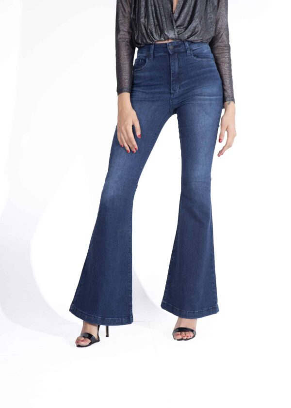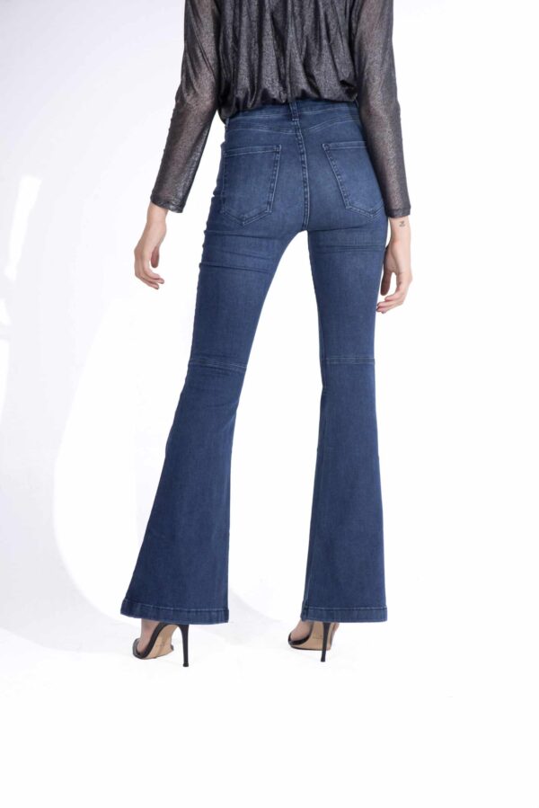 Lavado color índigo intenso con bigotes laser y localizado, calce flare con detalle de costura a contra tono detrás de la rodilla.