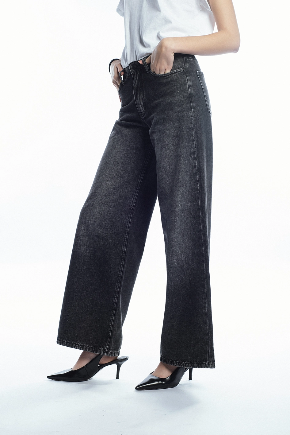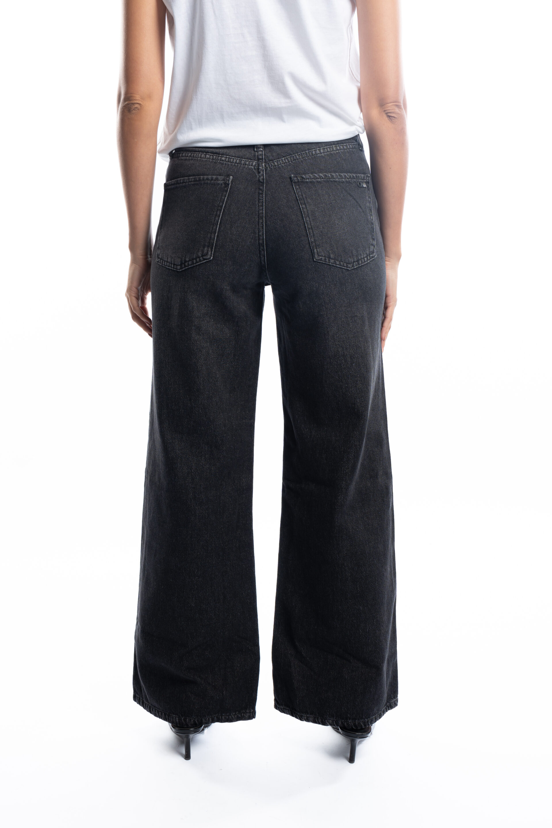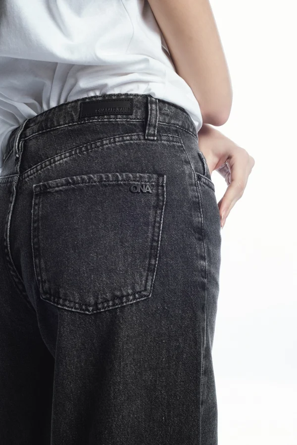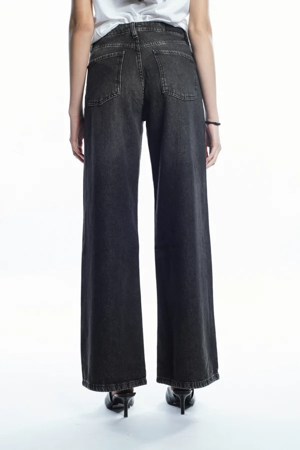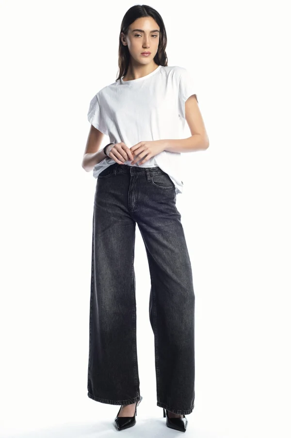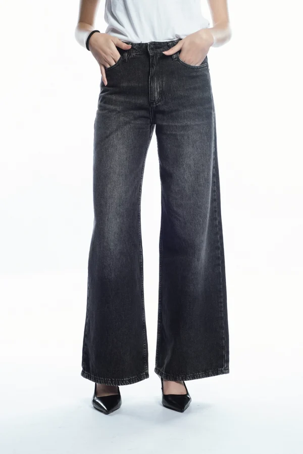 Jean tiro alto modelo wide leg, confeccionado en Denim rígido 100% algodón.