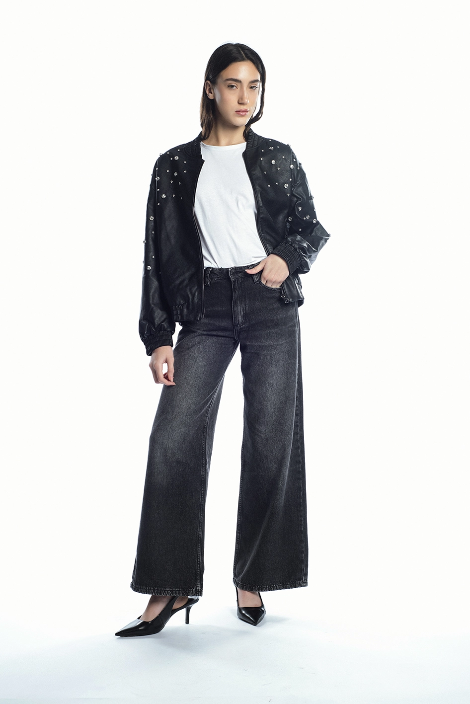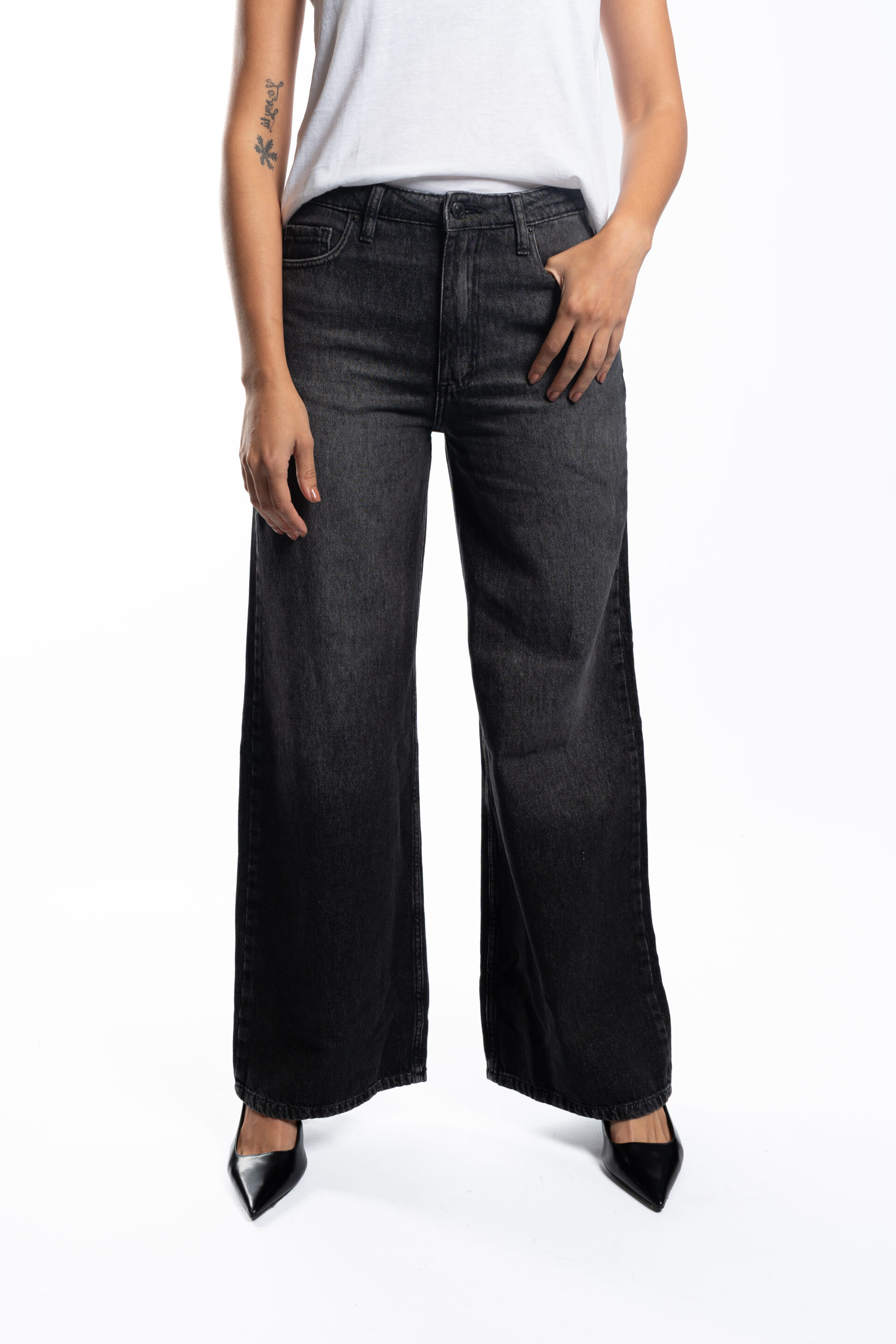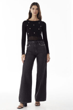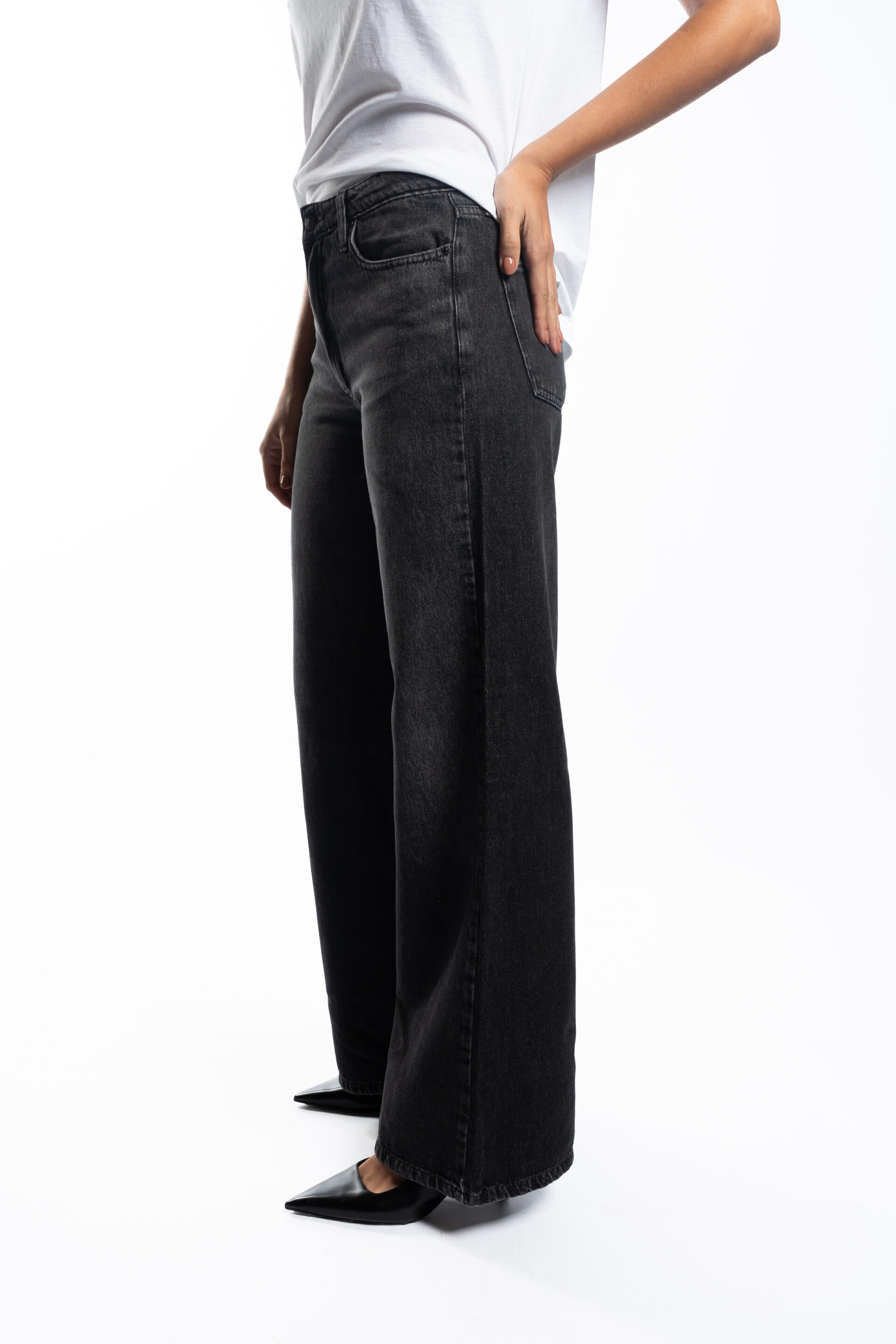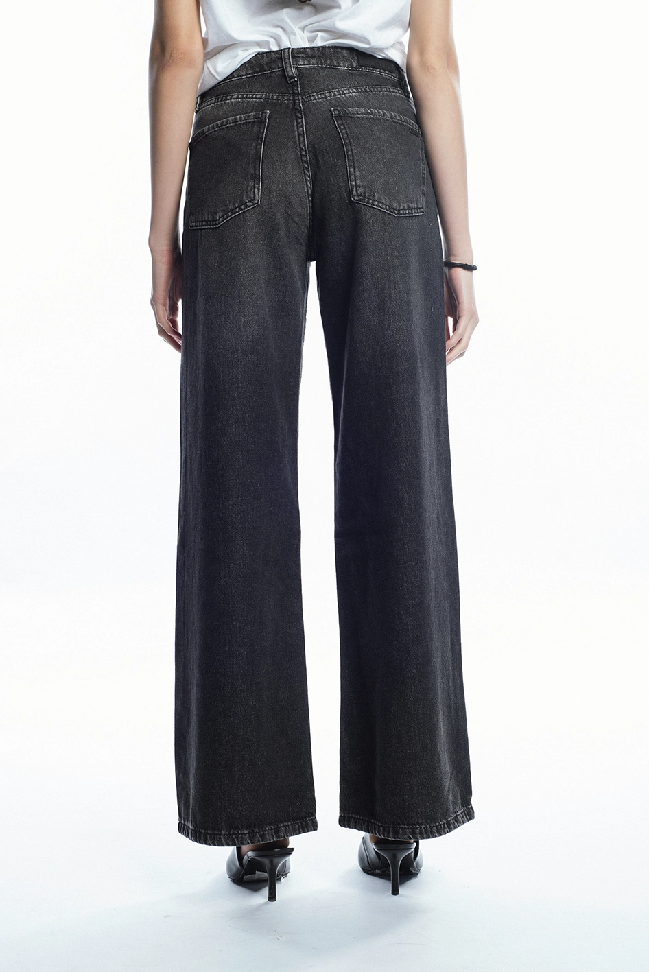Jean tiro alto modelo wide leg, confeccionado en Denim rígido 100% algodón.