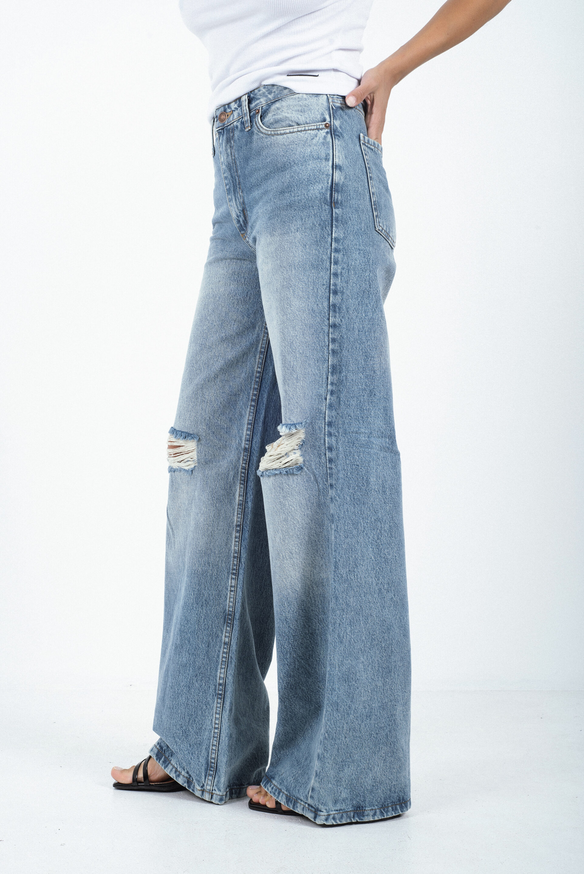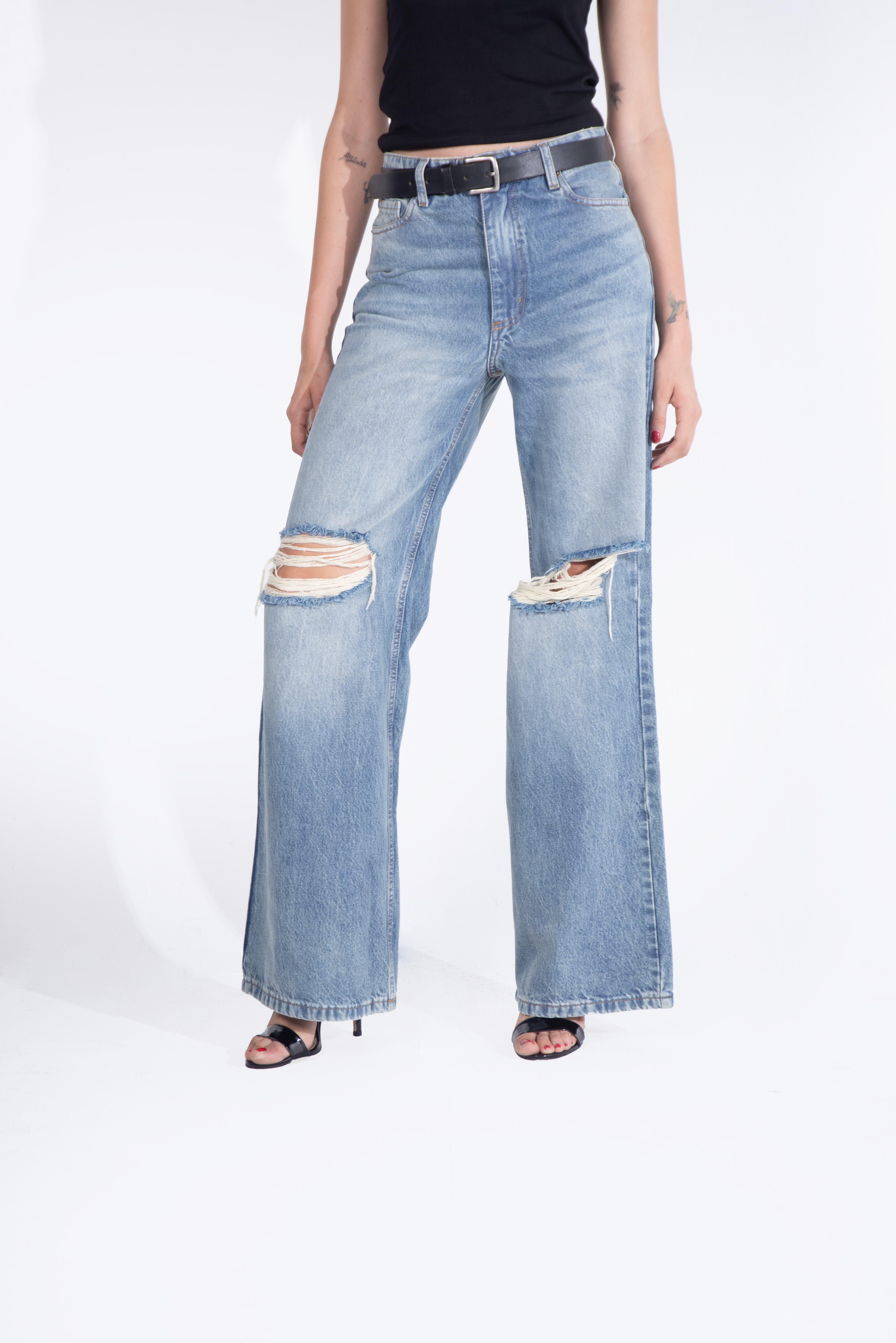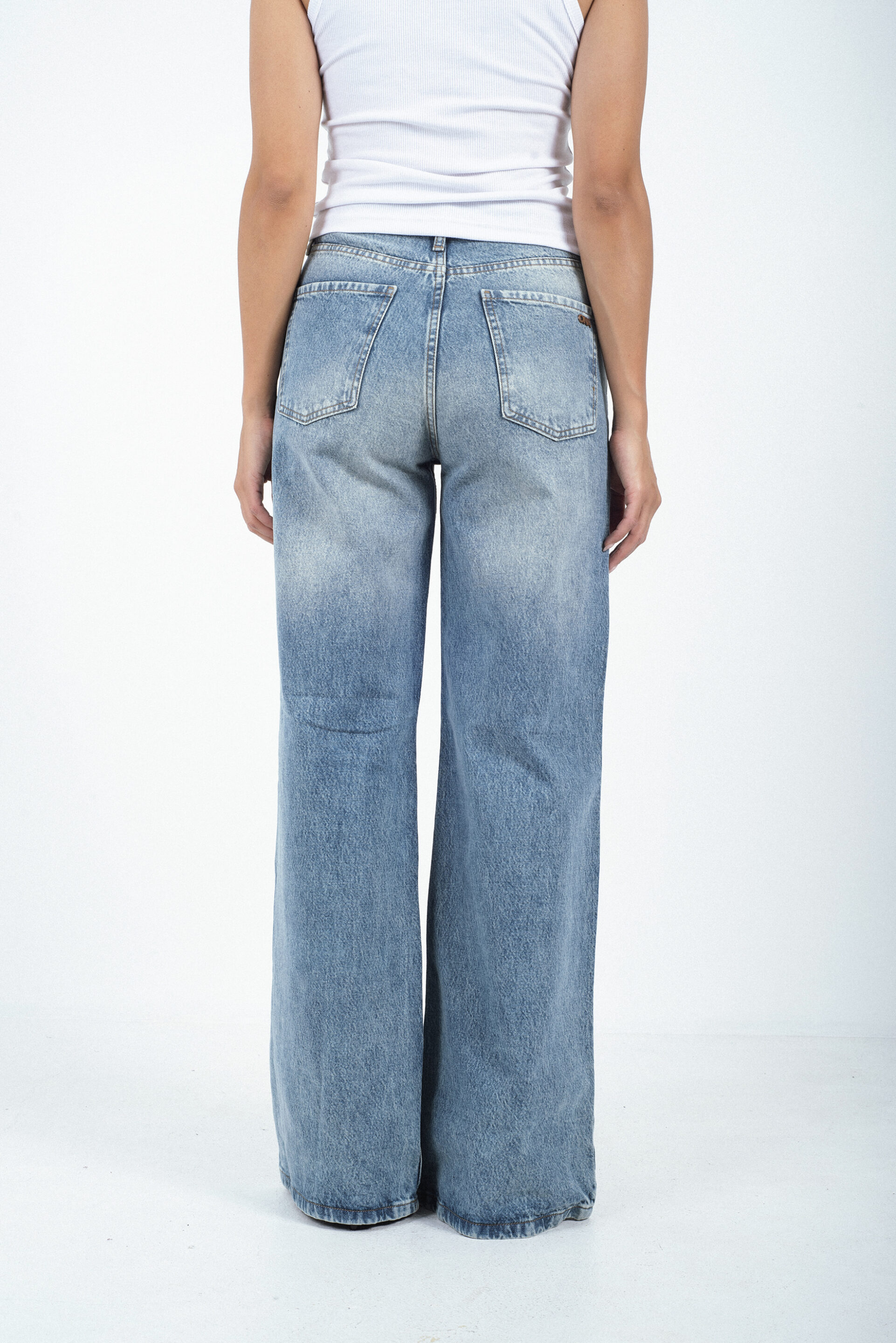 Jean tiro alto confeccionado en denim 100% algodón, de textura rígida y estructura clásica. Presenta calce wide leg, con piernas amplias desde la cadera que aportan comodidad y un estilo