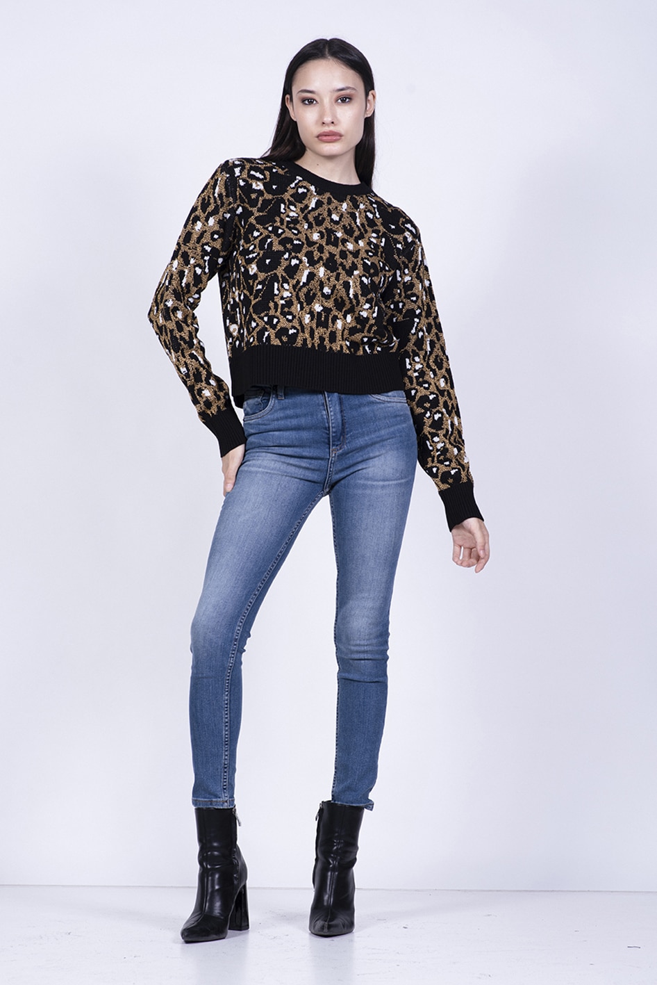 Con cinco bolsillos, cierre frontal con cremallera y botón metálico de marca.