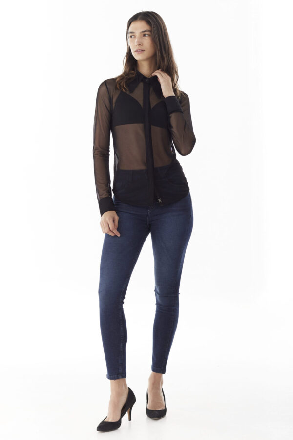 Cinco bolsillos cierre frontal con cremallera y botón metálico de marca.