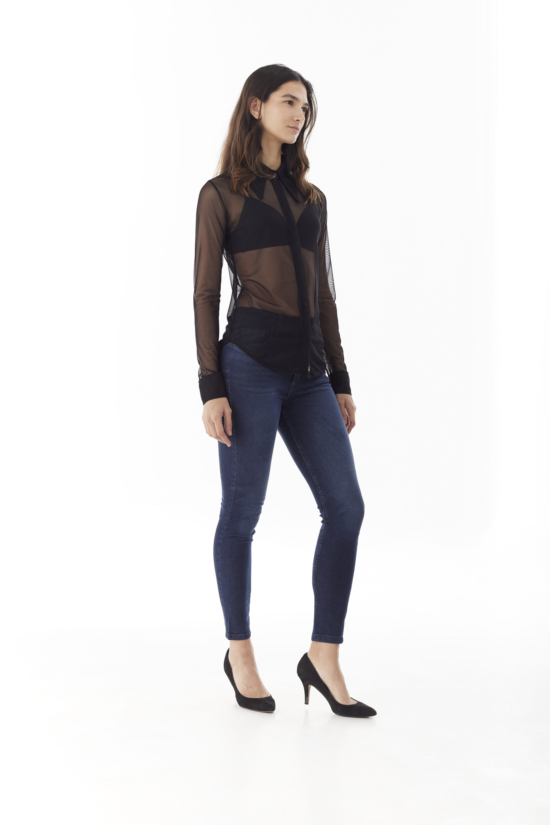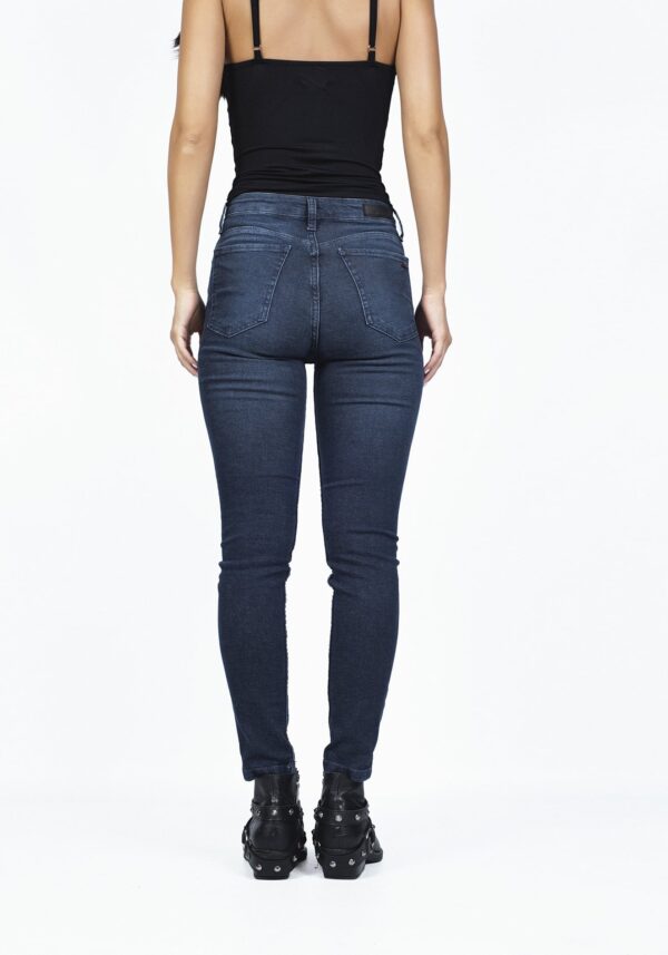 Lavado color azul oscuro gastado con localizado, pinzas en el trasero y canesú curvo con efecto push-up.