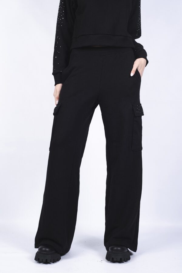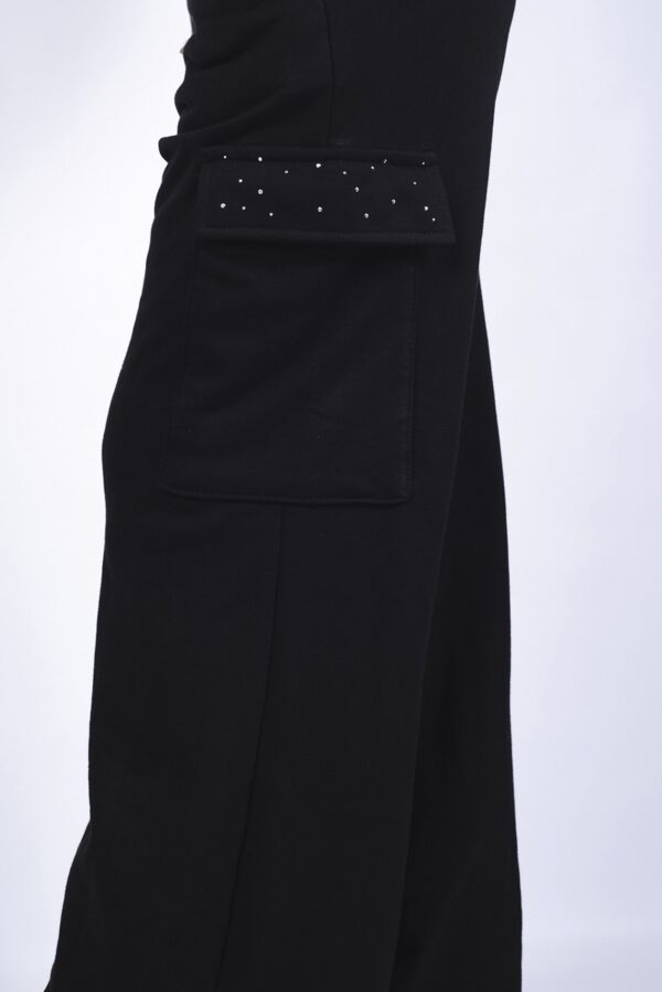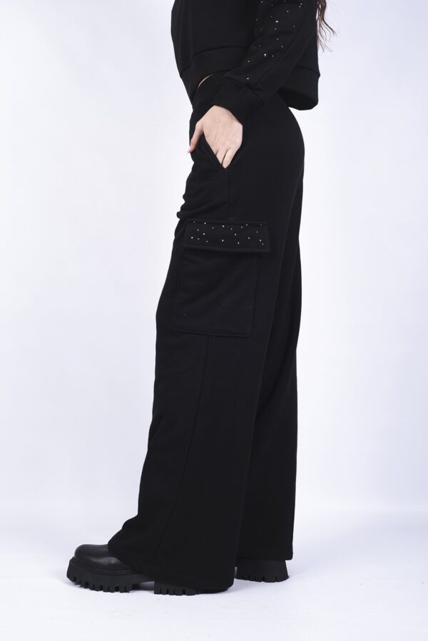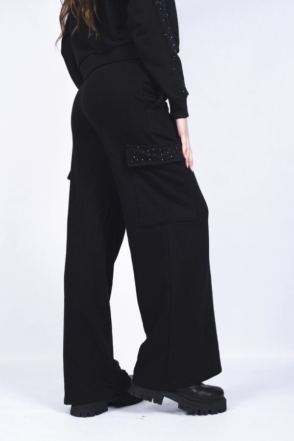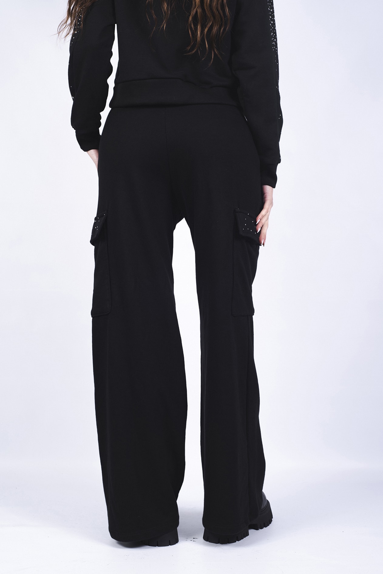 El detalle protagonista sin duda es el transfer de tachas color plata que tiene sobre los bolsillos cargo de los costados.