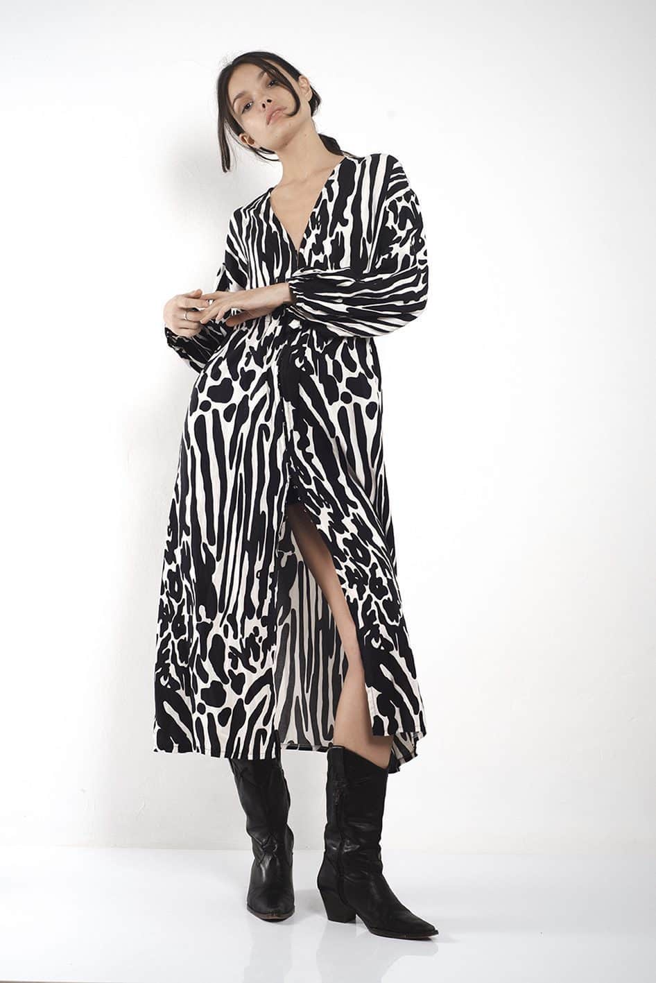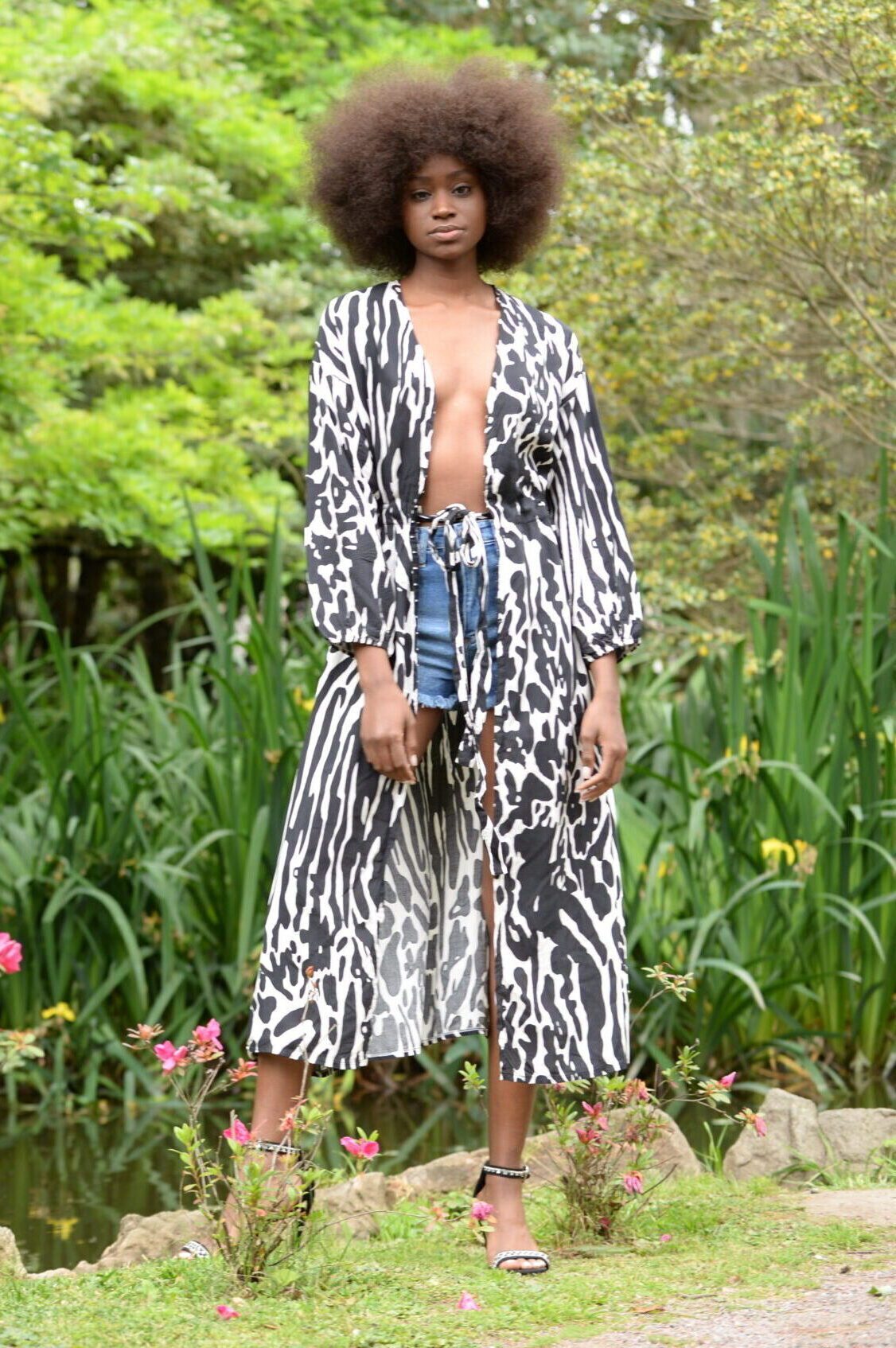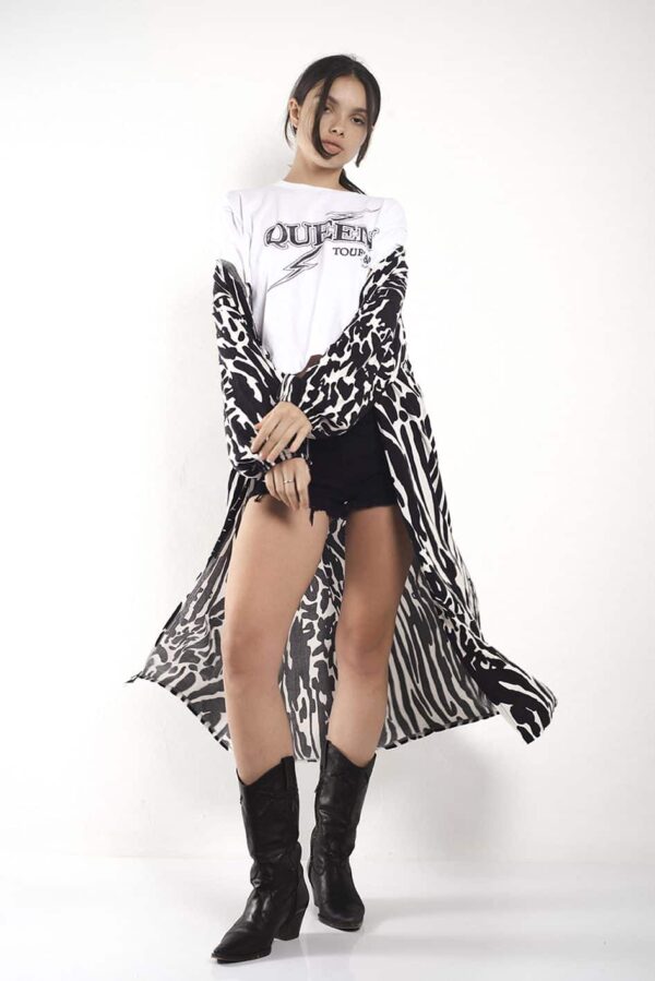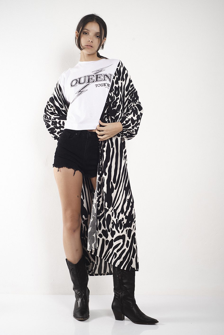 Kimono oversize con mangas 3/4, confeccionado en fibrana estampada con diseño animal print