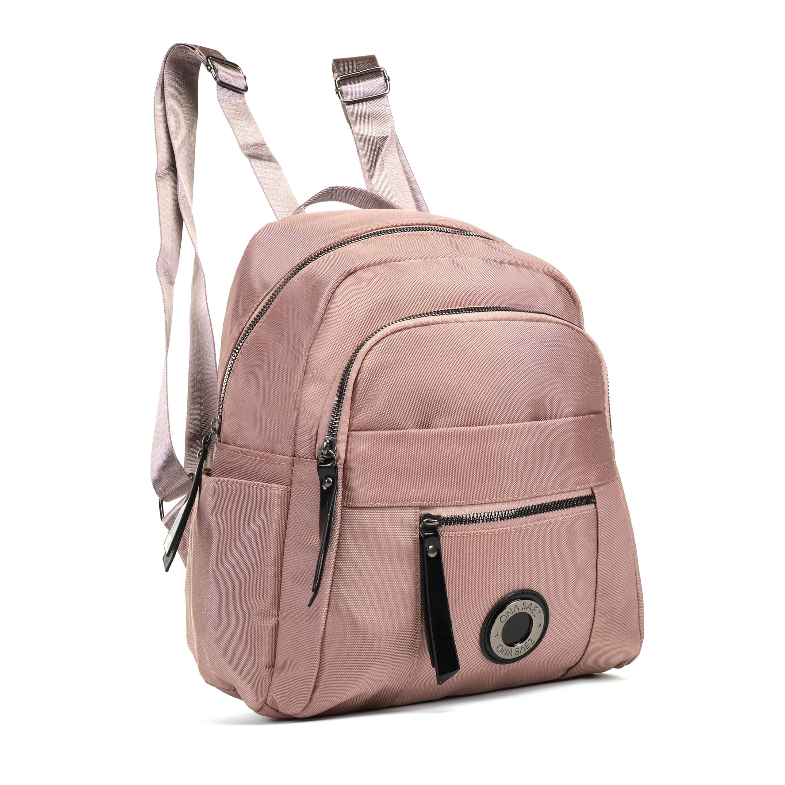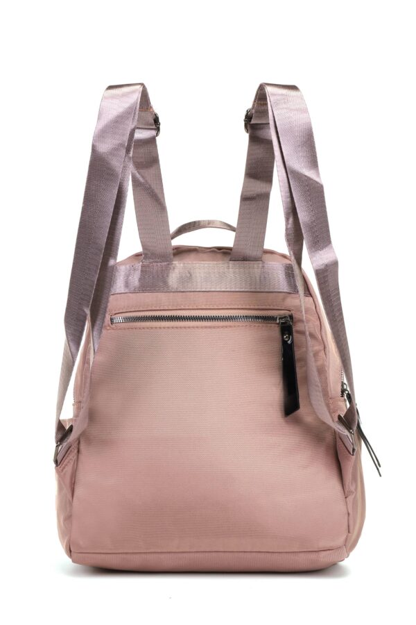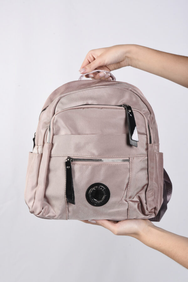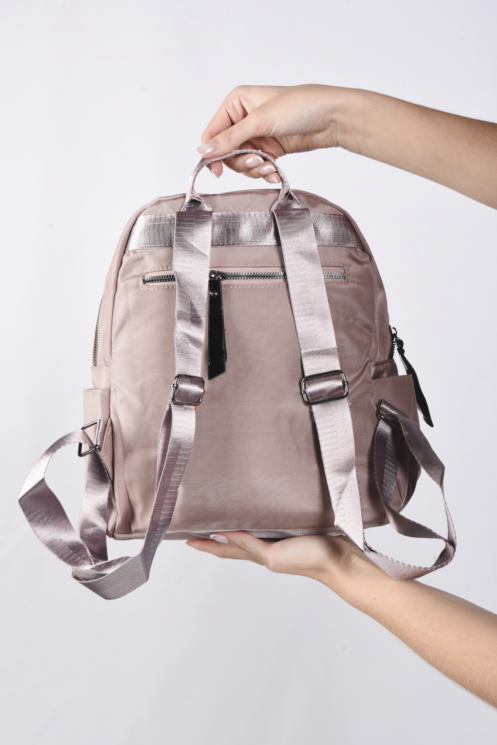 Mochila confeccionada en nylon 100% color rosa, con logo de marca al frente, ideal para quienes buscan un accesorio versátil para el día a día.