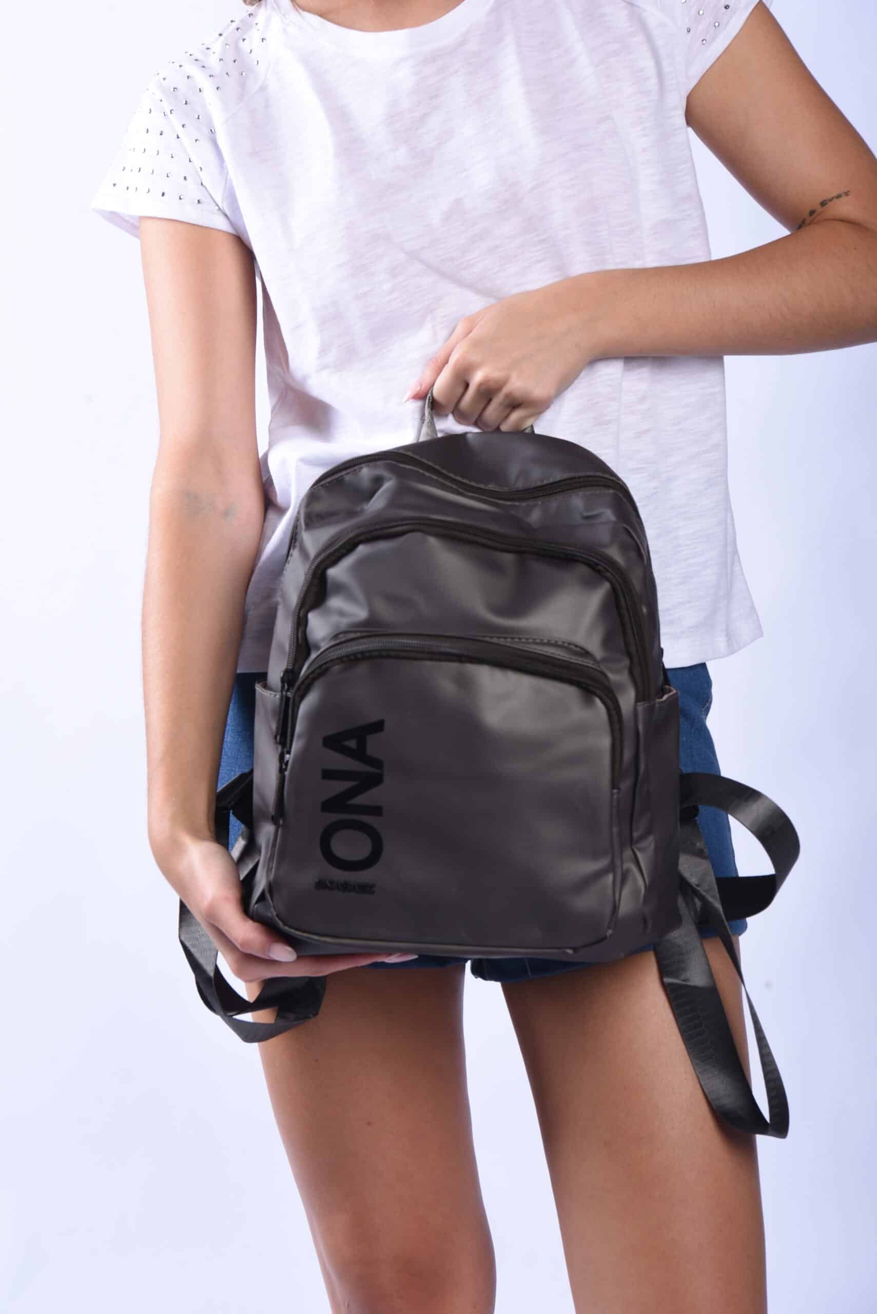 Mochila confeccionada en poliéster con acabado engomado color verde oliva, lo que le otorga una apariencia mate y una mayor resistencia al agua.