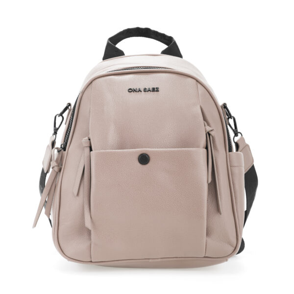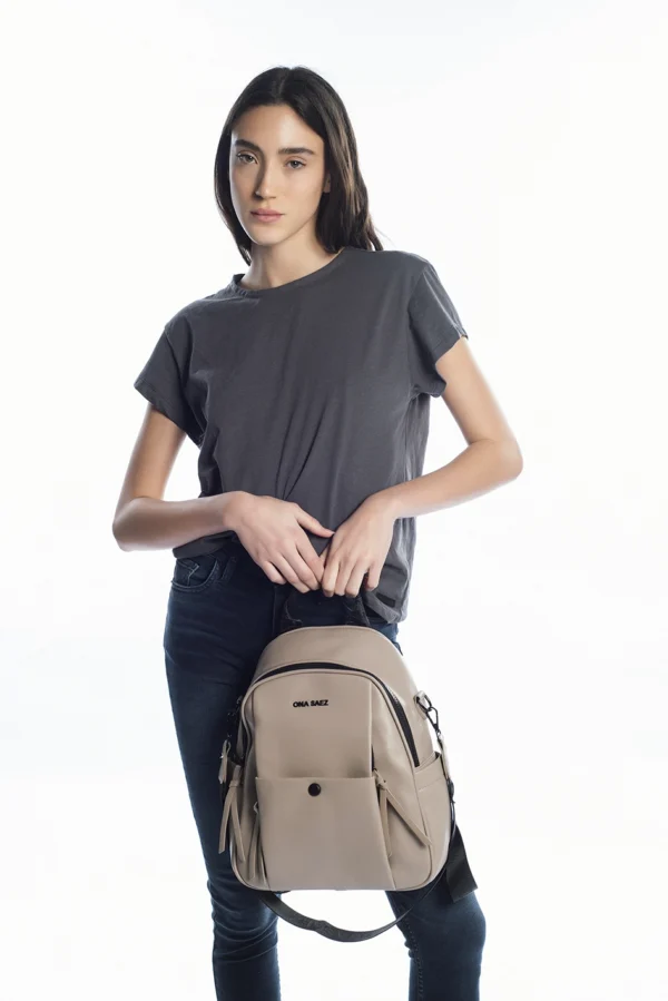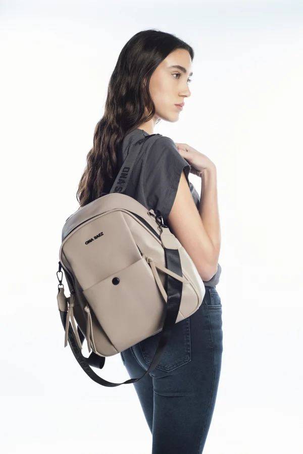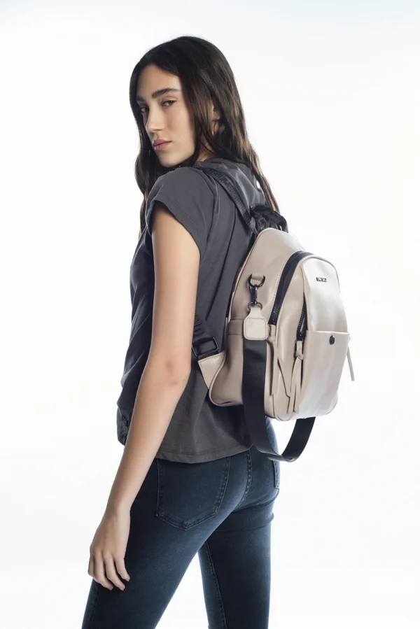 Mochila confeccionada en simil cuero (pu) color arena, combina líneas minimalistas con máxima funcionalidad. El bolsillo delantero de solapa con cierre imantado aporta un guiño de sofisticación, mientras que el compartimento interior con cremallera y los dos bolsillos laterales mantienen todo en su sitio.