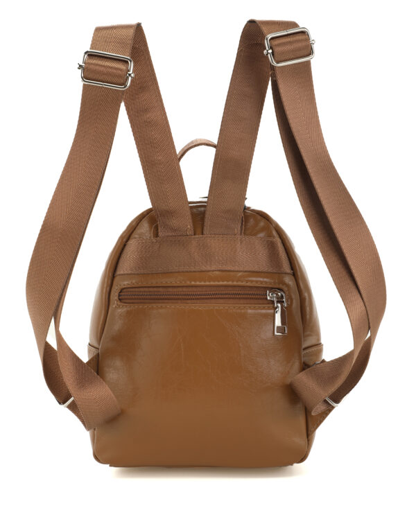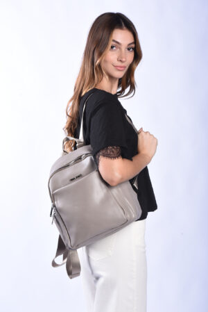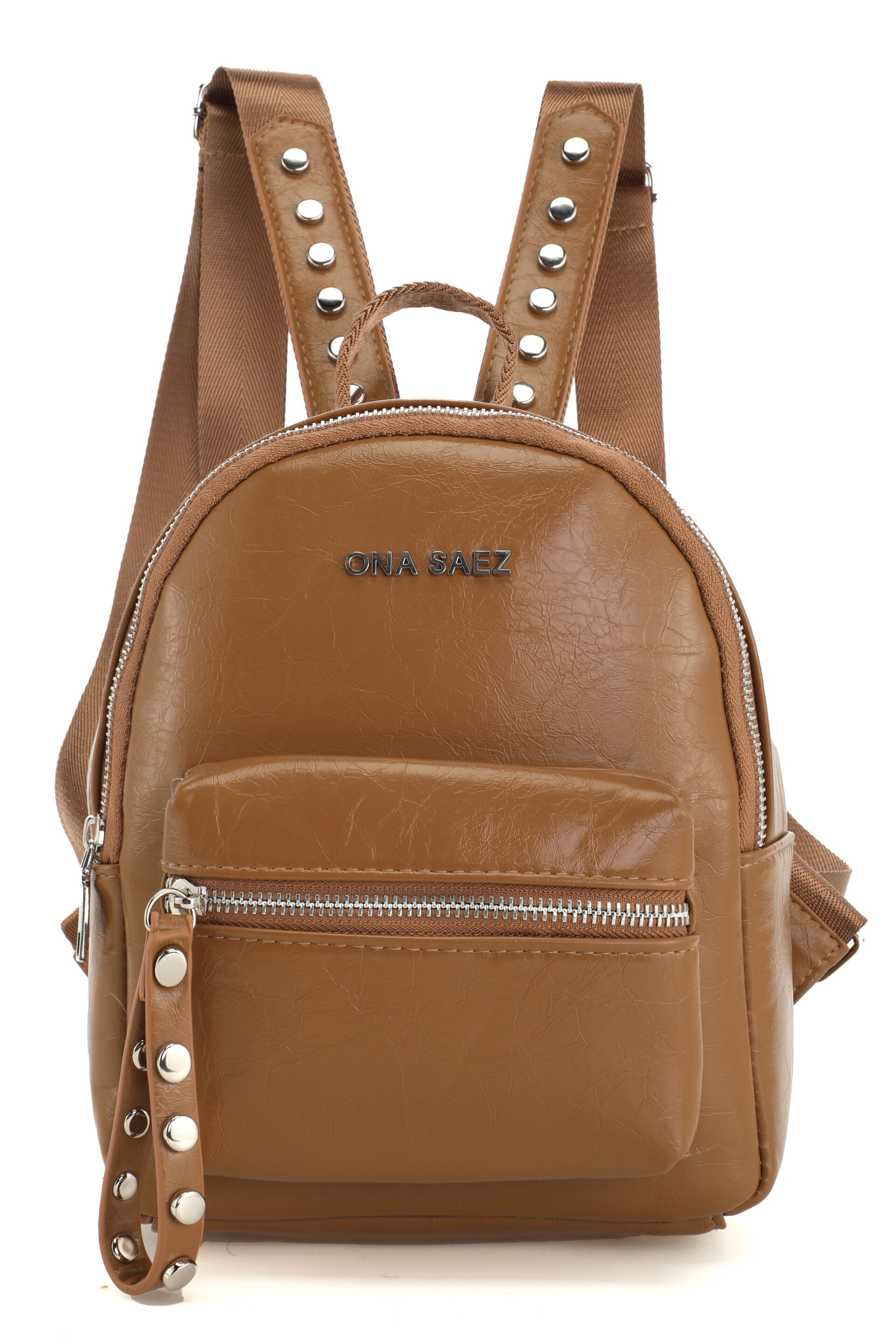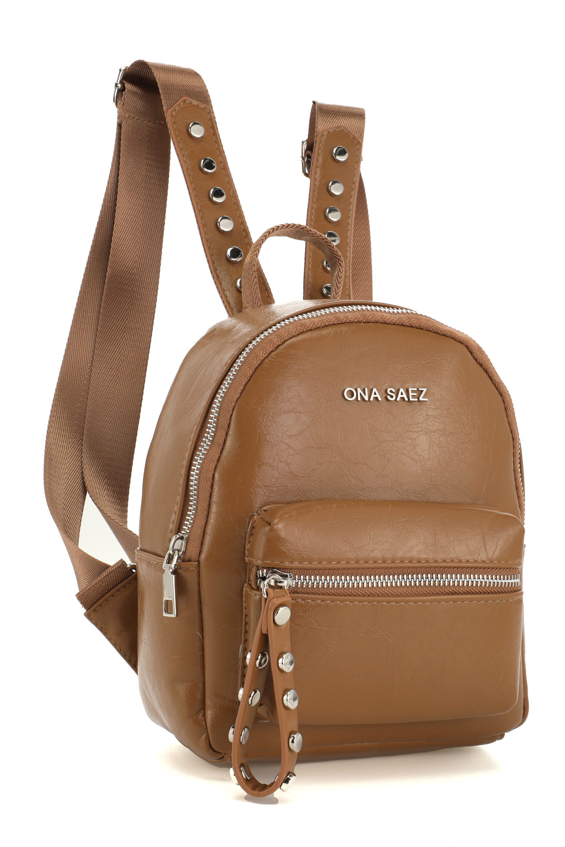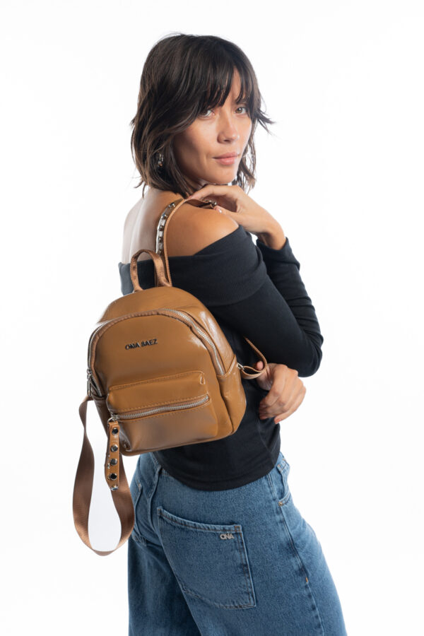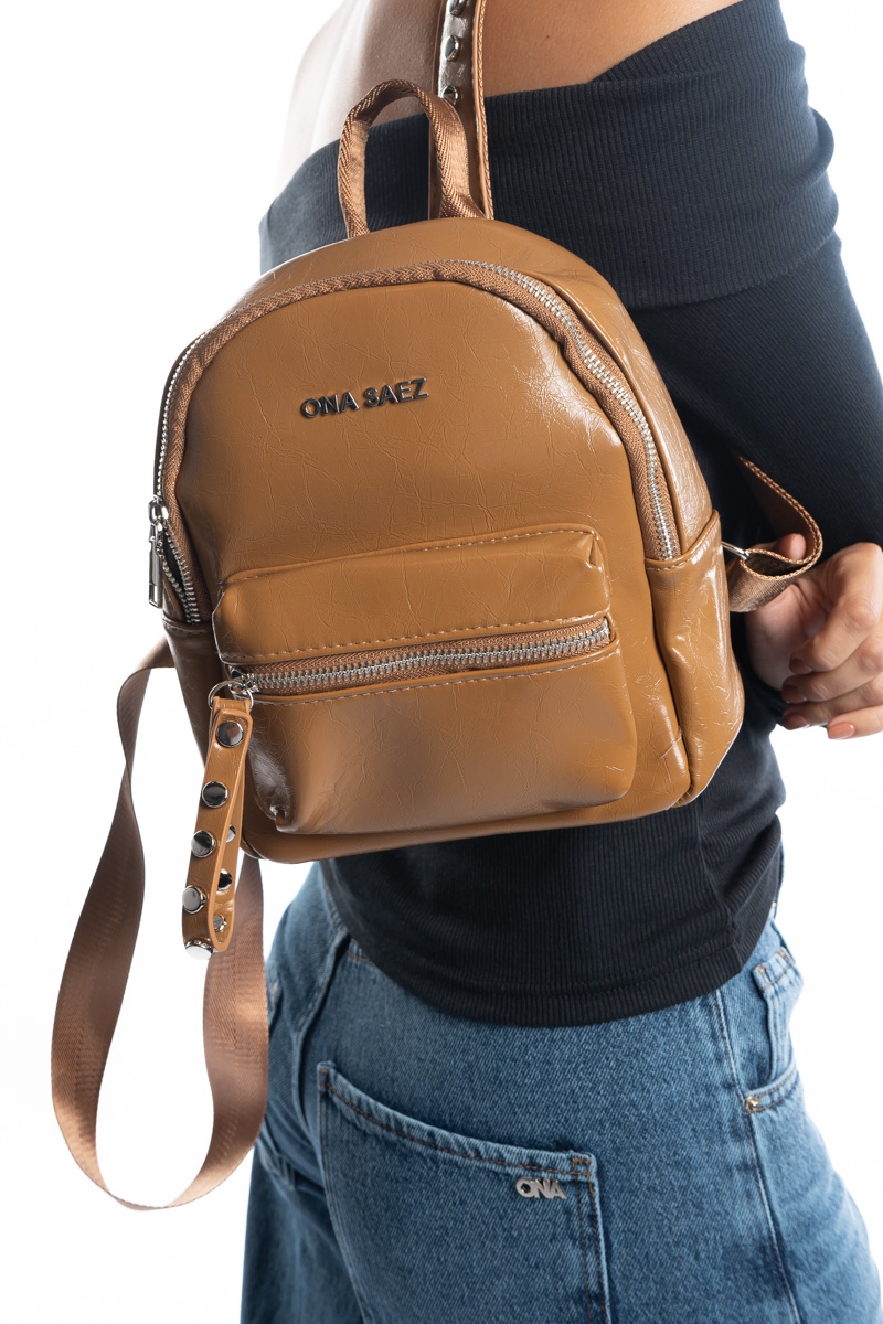 Mochila confeccionada en simil cuero (pu) color visón, con aplique metálico con logo de marca en el frente.