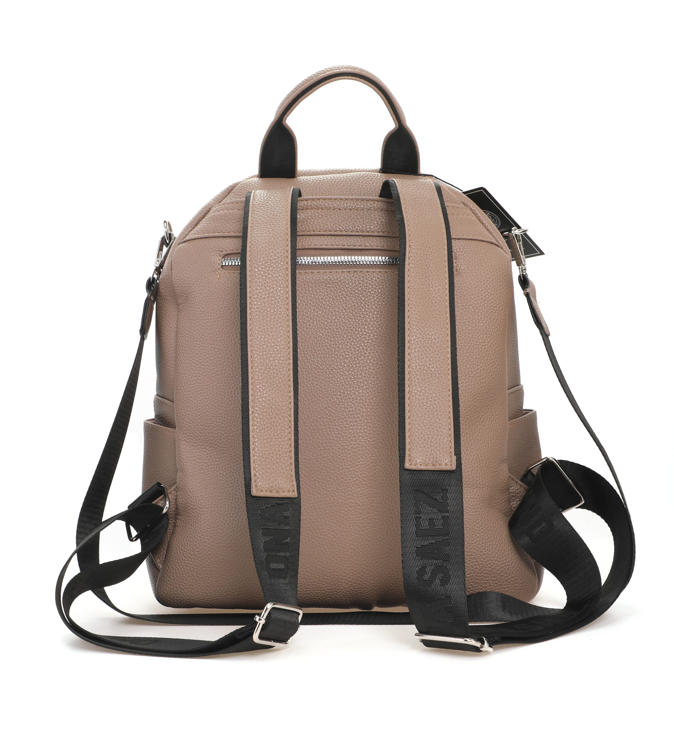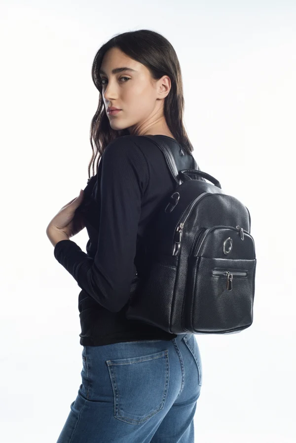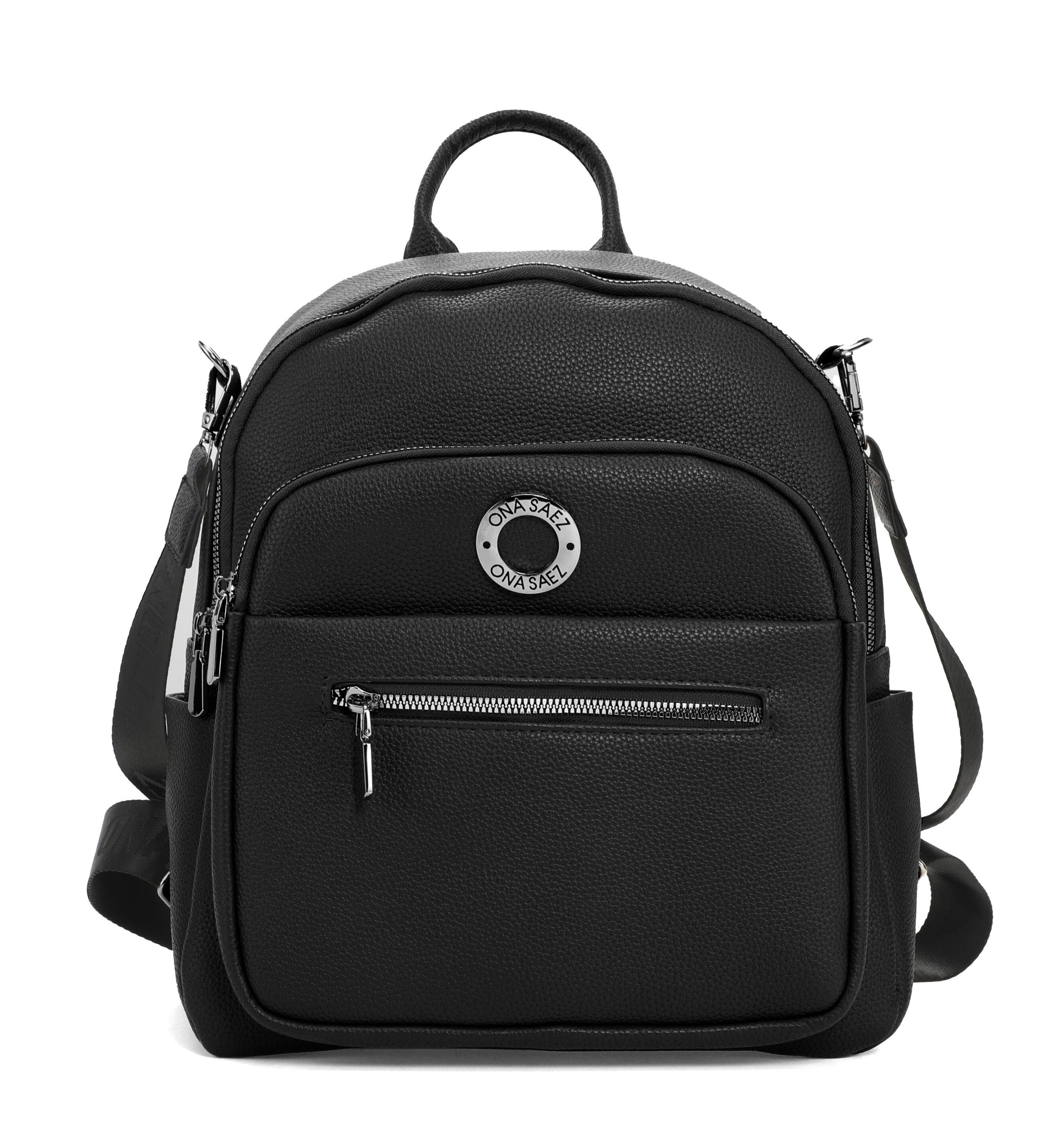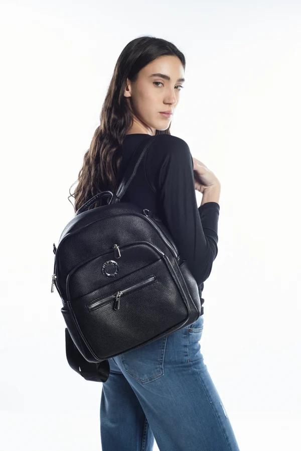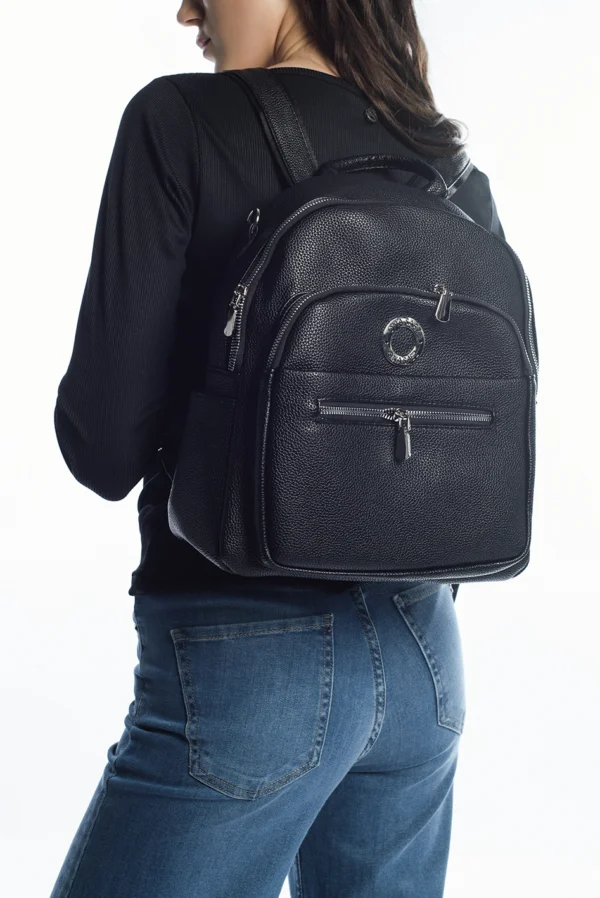 Mochila confeccionada en simil cuero (pu) color negra, con aplique metálico con logo de marca en el frente.