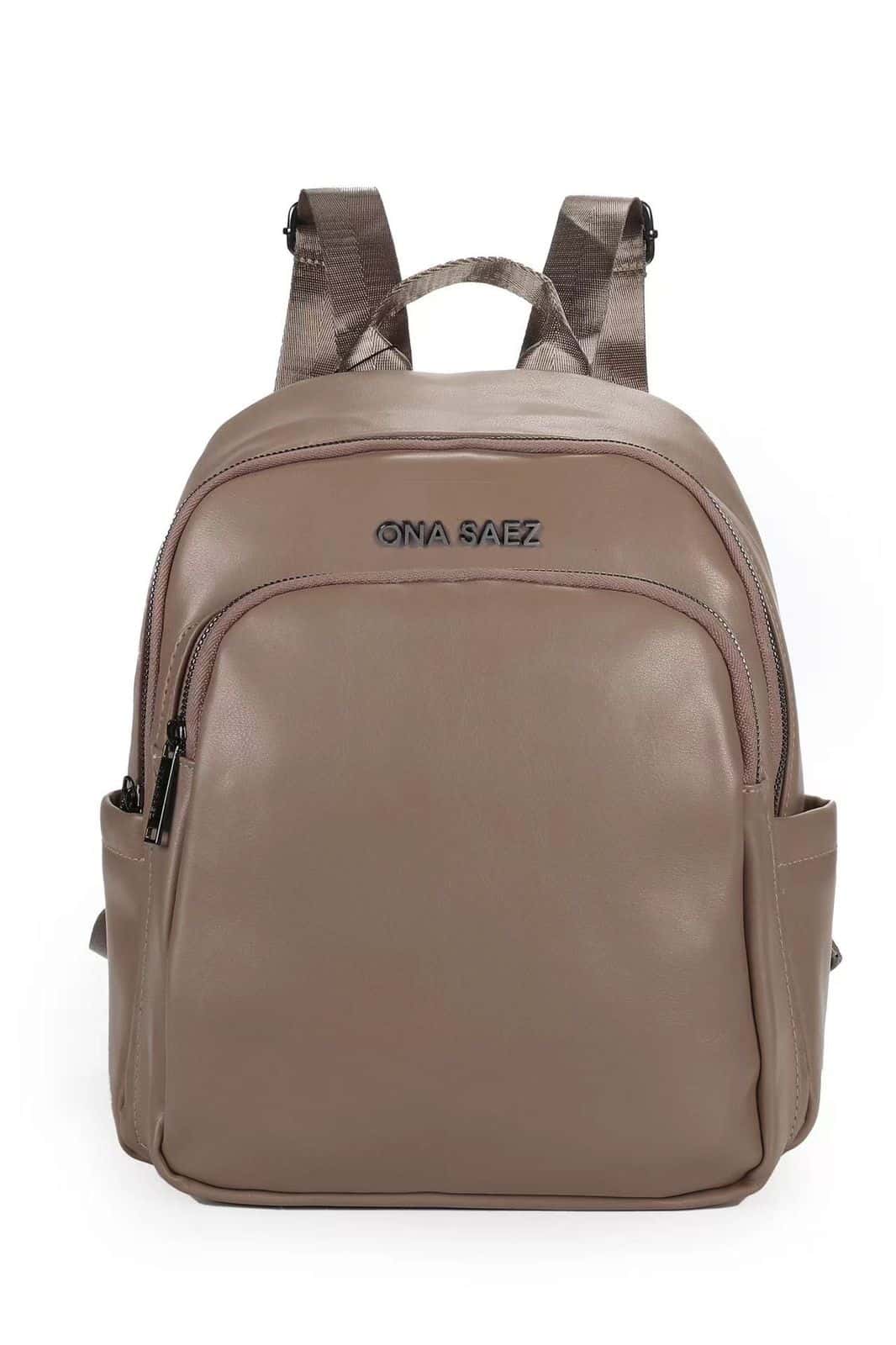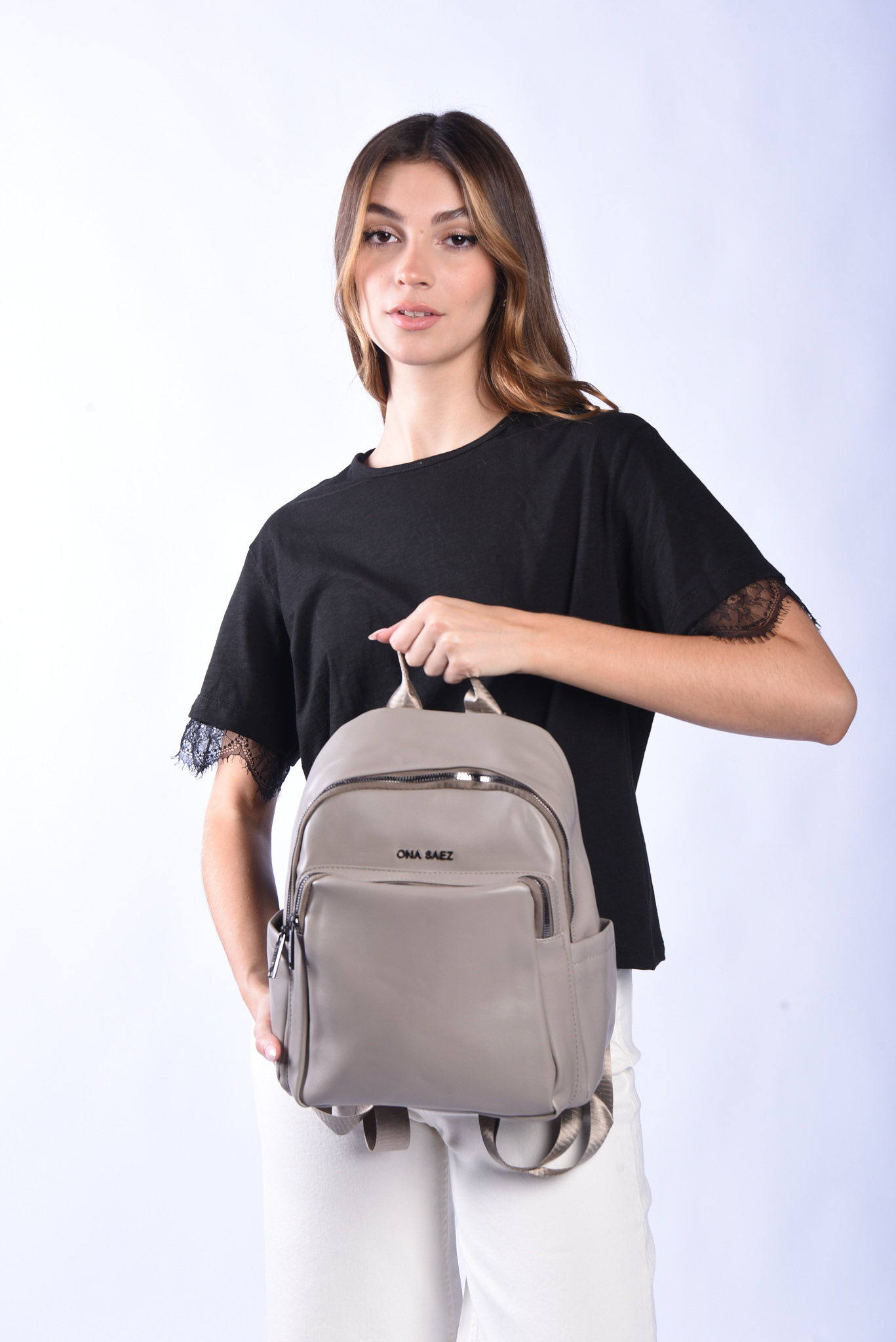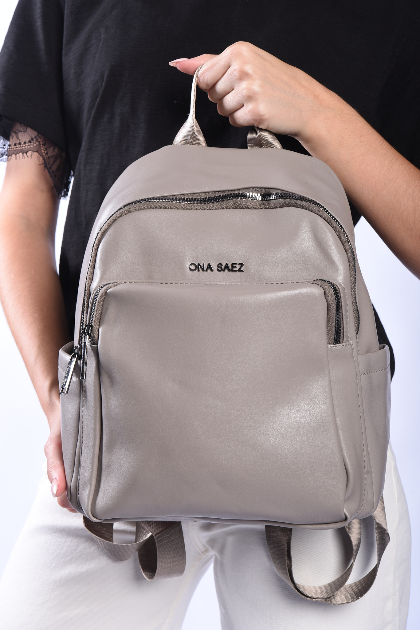 Mochila confeccionada en simil cuero (pu) color arena, con logo de marca grabado en el frente.