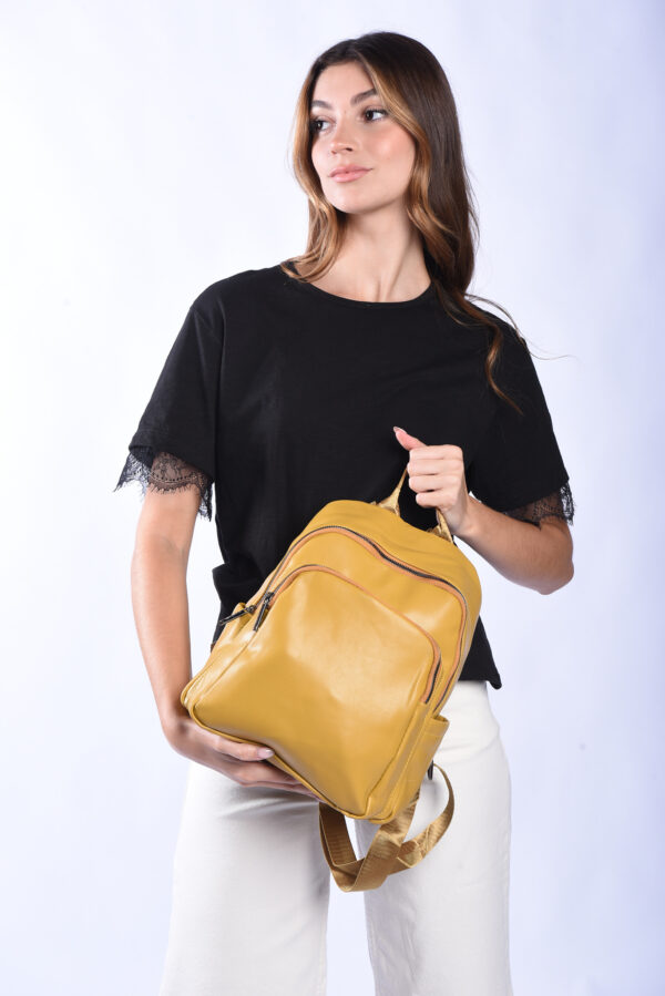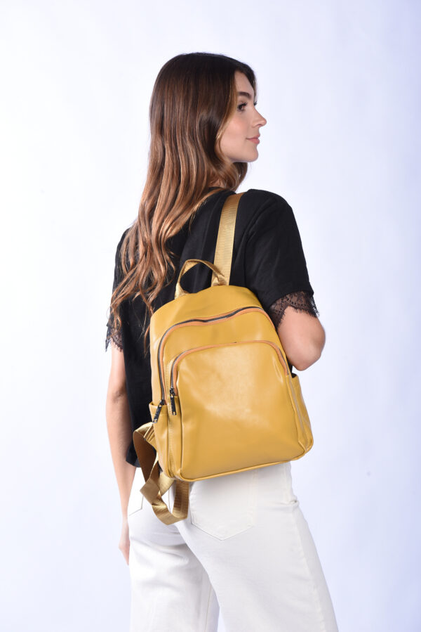 Mochila confeccionada en simil cuero (pu) color arena, con logo de marca grabado en el frente.
