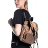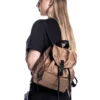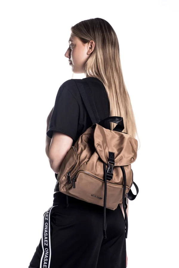 Mochila confeccionada en nylon 100% color suela, con logo de marca al frente.