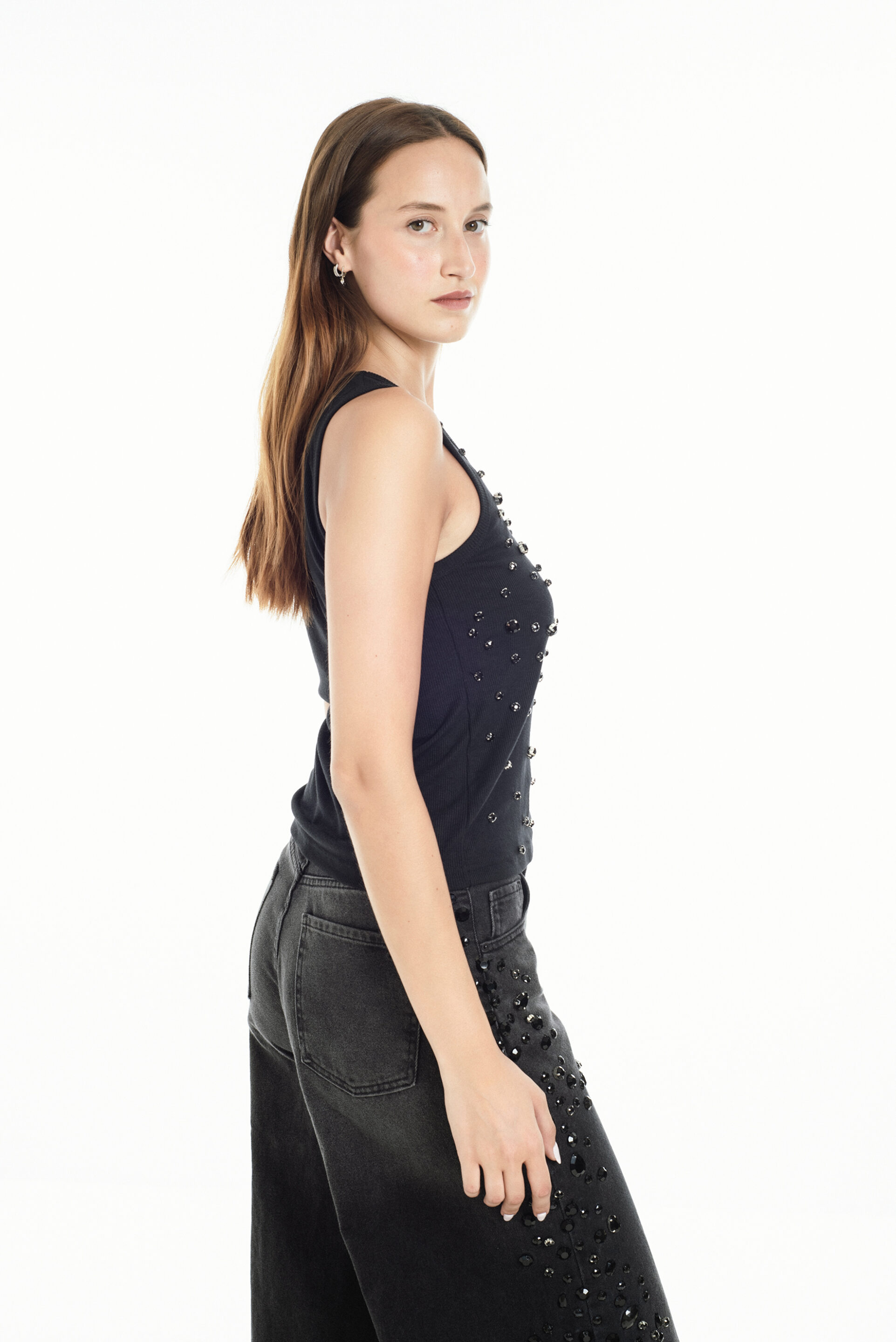 Presenta un trabajo artesanal de piedras a tono engarzadas, aplicadas a mano y distribuidas en todo el frente, que aportan textura, brillo y un look sofisticado.