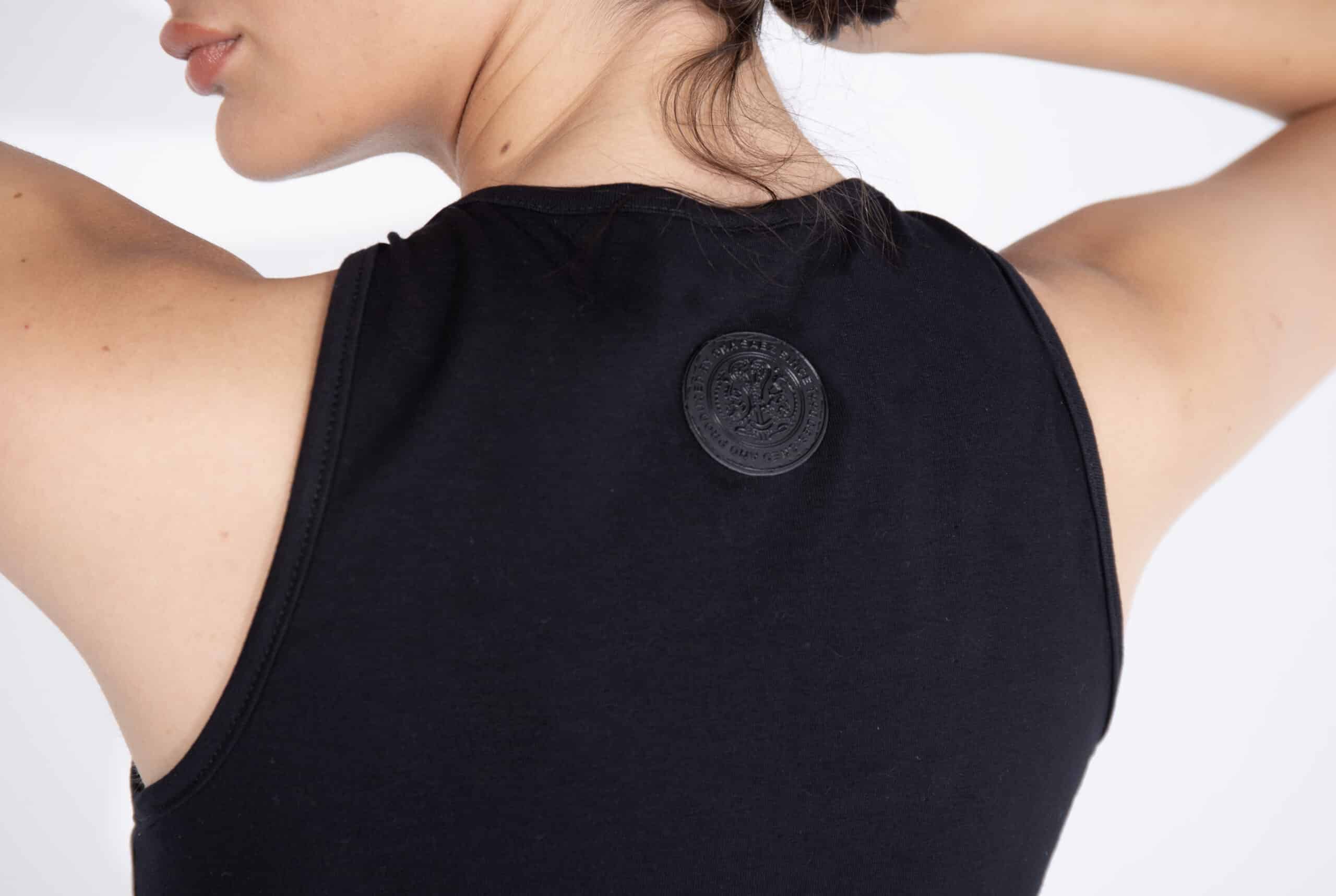 Largo modular por debajo de la cintura, con etiqueta de goma circular con logo de marca en relieve.