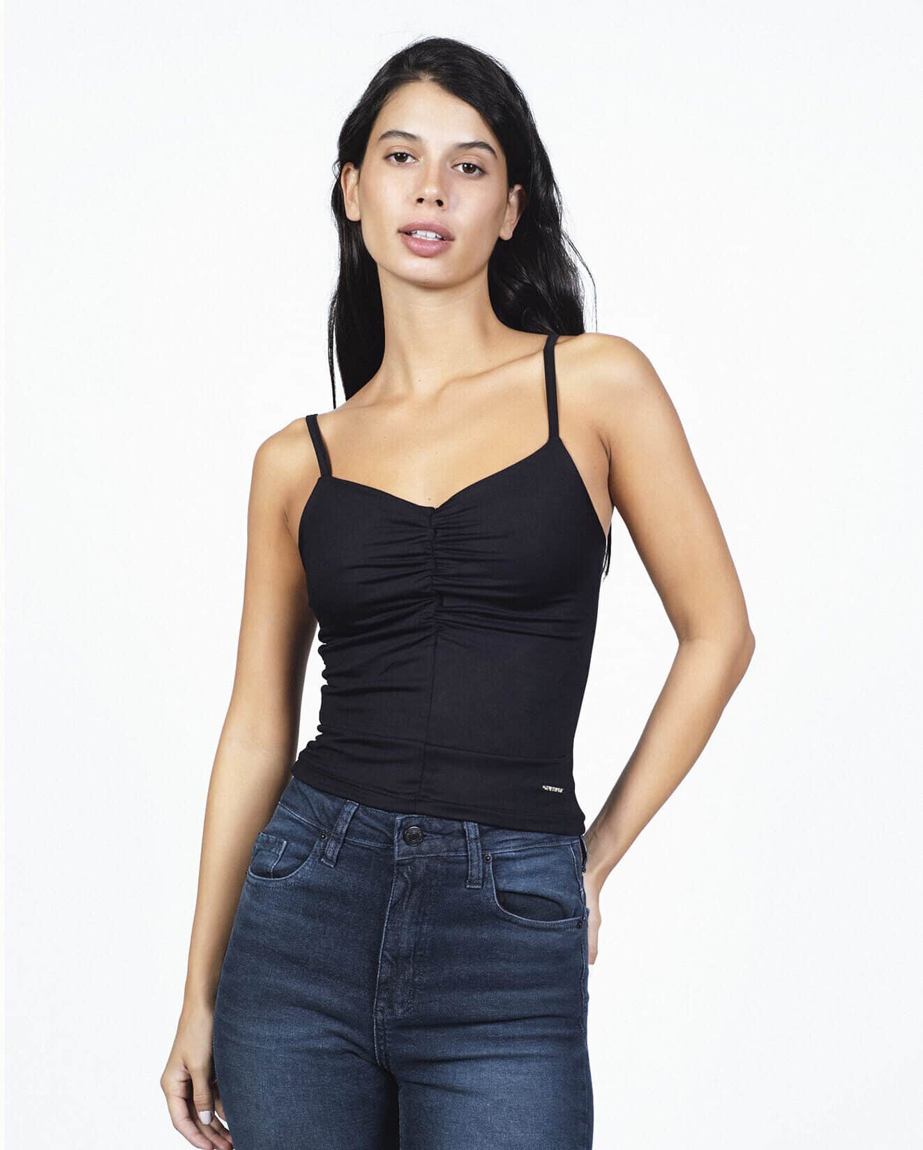 Musculosa escote en v confeccionada en microfibra de nylon liviano color negra, con sutil drapeado en el frente.