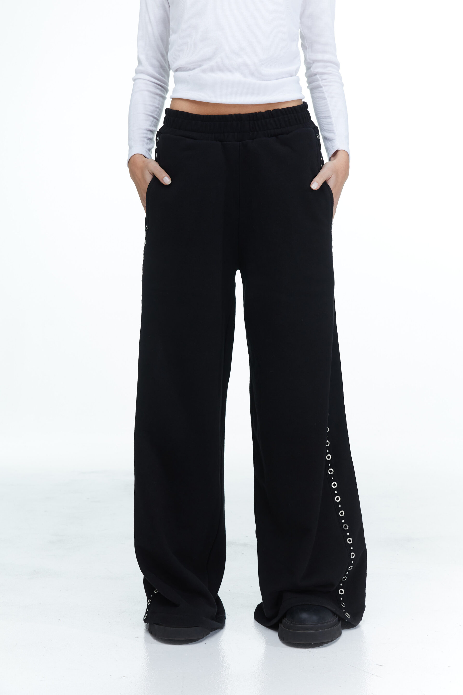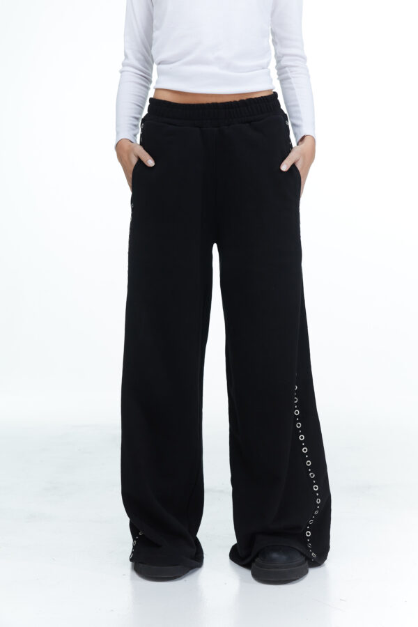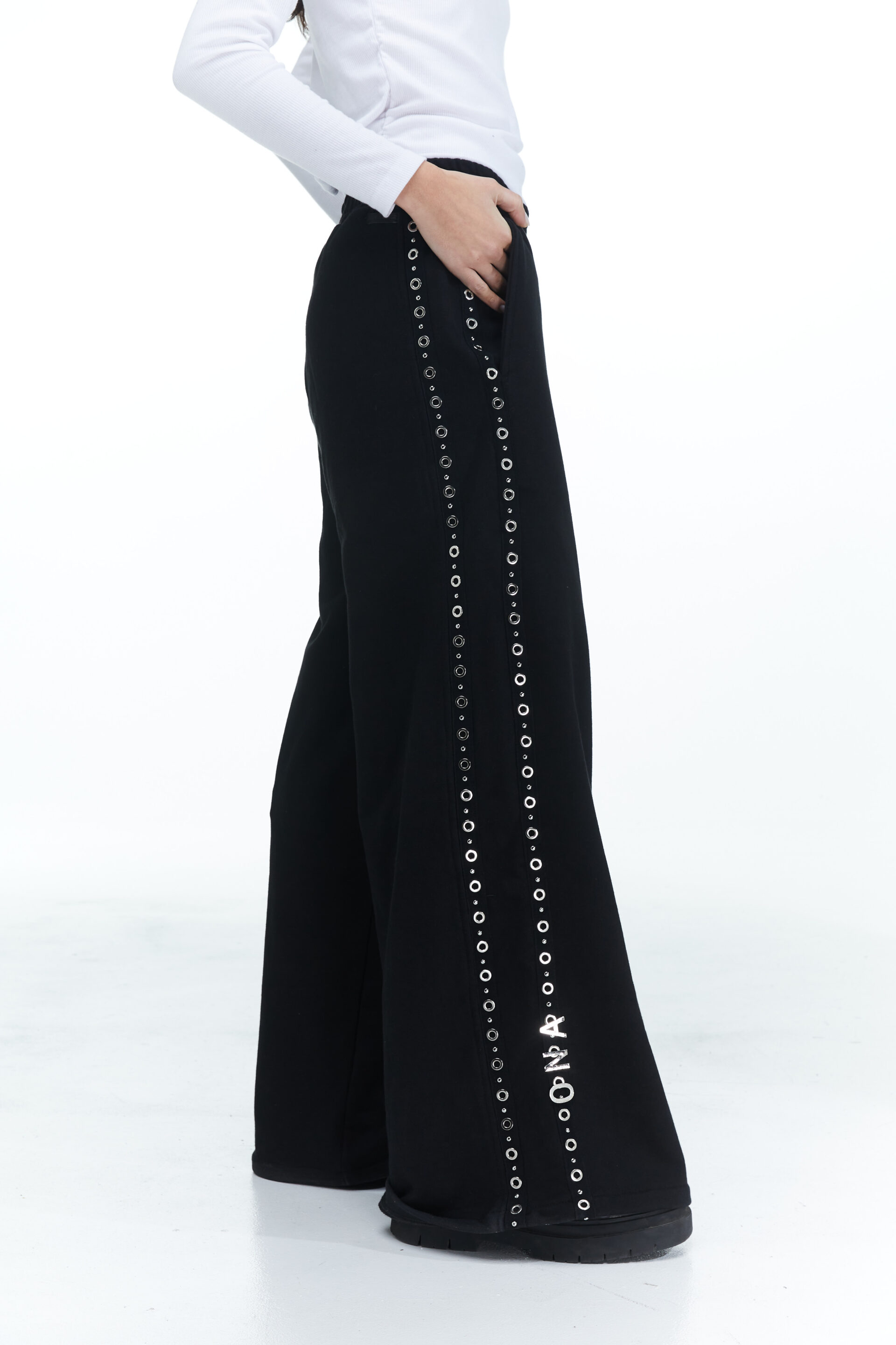 El diseño resalta por una doble guarda lateral con apliques metálicos tipo ojal a lo largo de ambas piernas, y letras ONA en fundición color plata que aportan un toque canchero y distintivo al look.