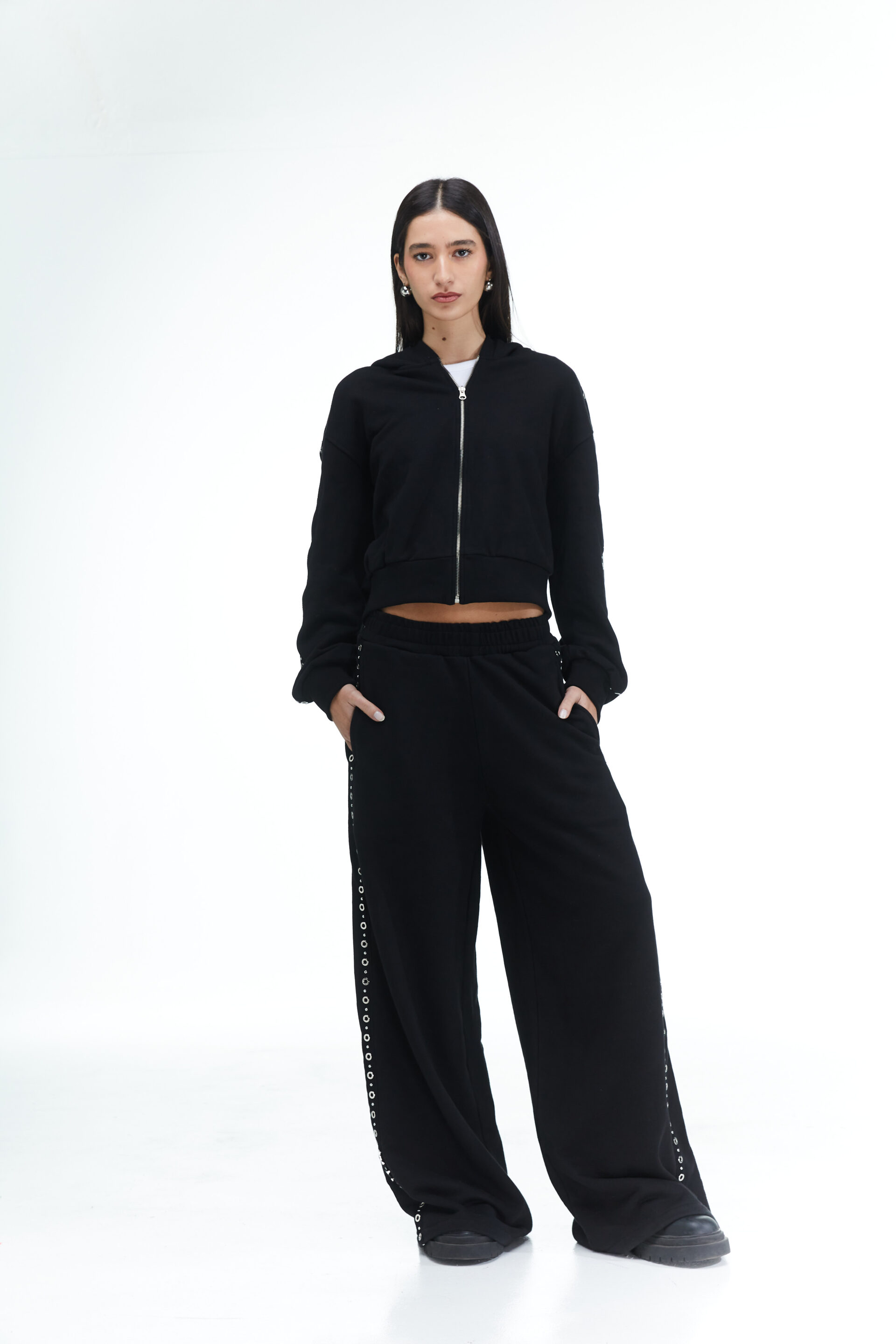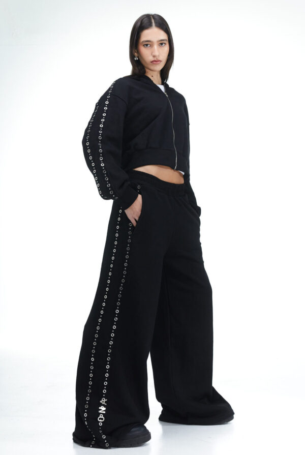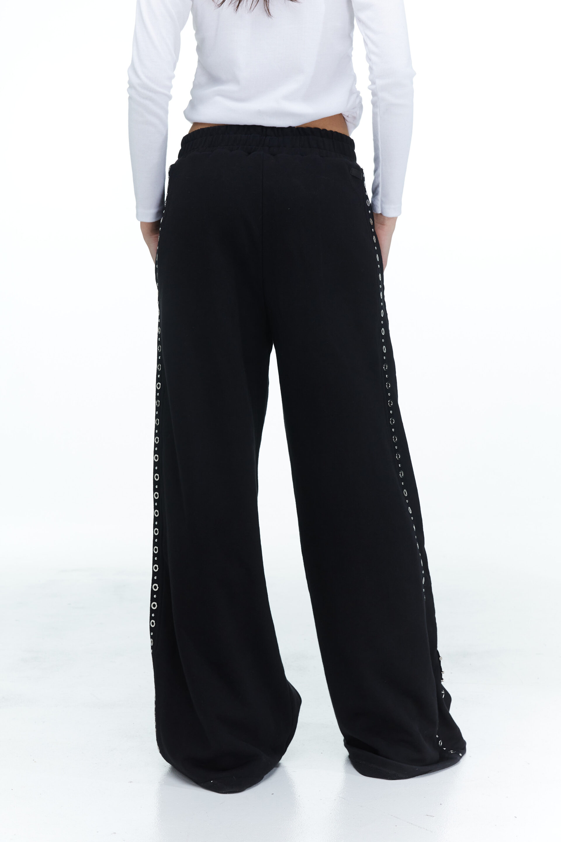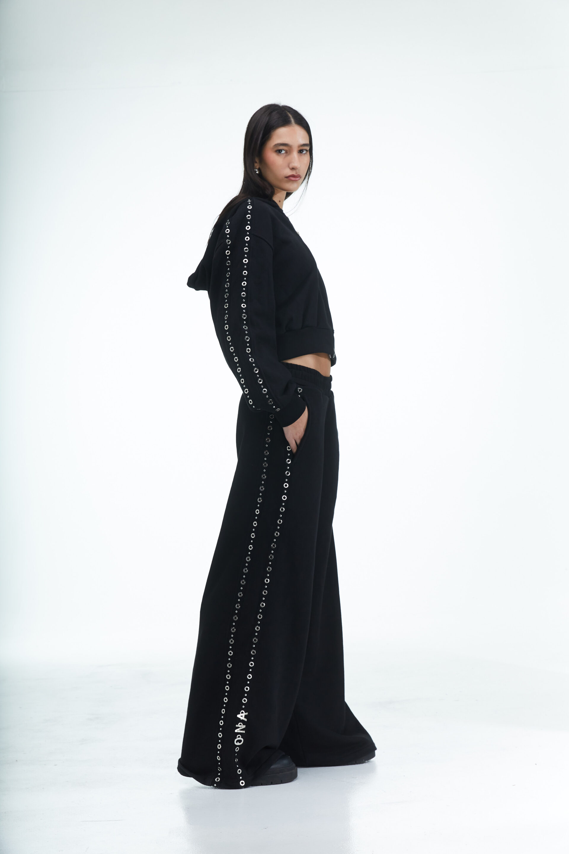 El diseño resalta por una doble guarda lateral con apliques metálicos tipo ojal a lo largo de ambas piernas, y letras ONA en fundición color plata que aportan un toque canchero y distintivo al look.