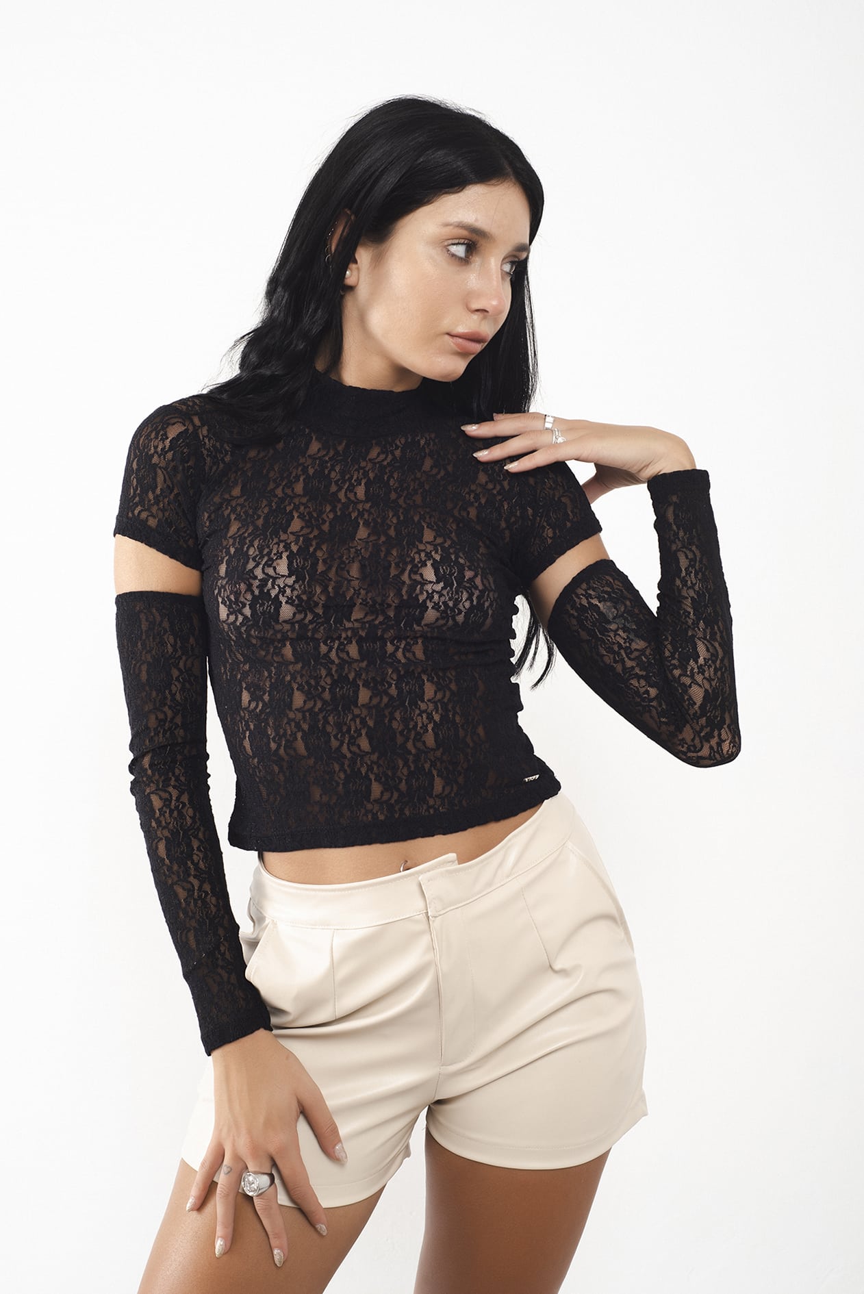 Polera semitransparente manga corta, confeccionada en encaje elastizado color negro.