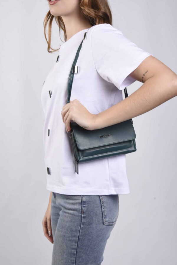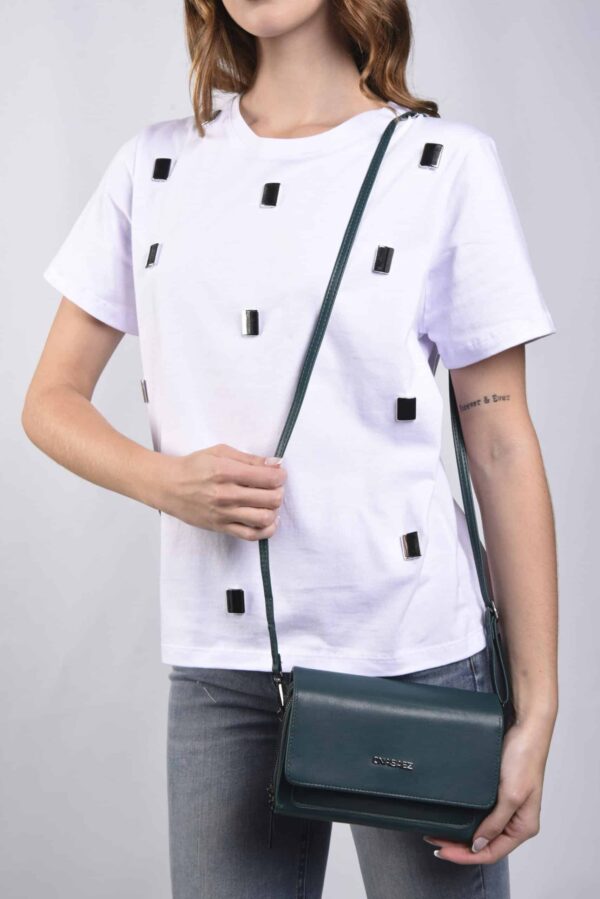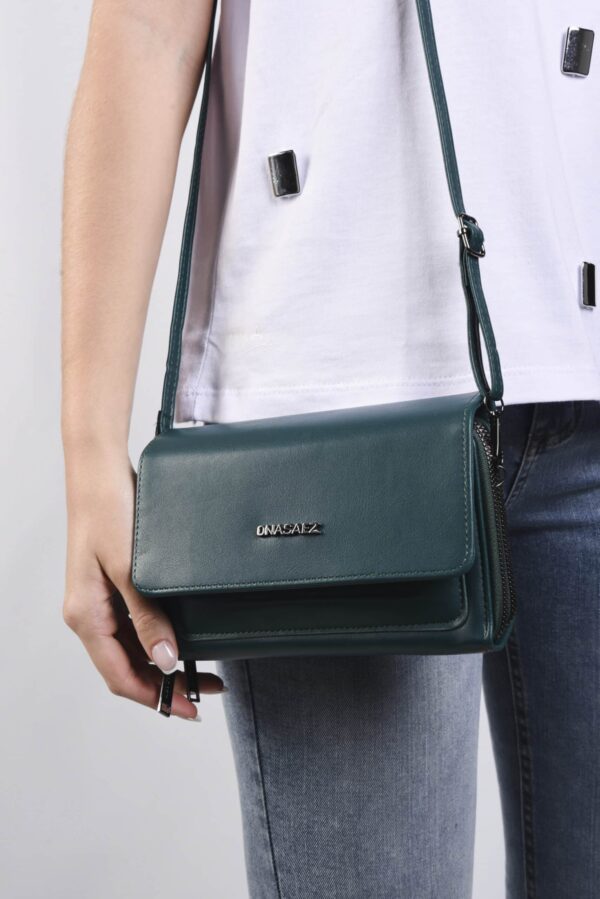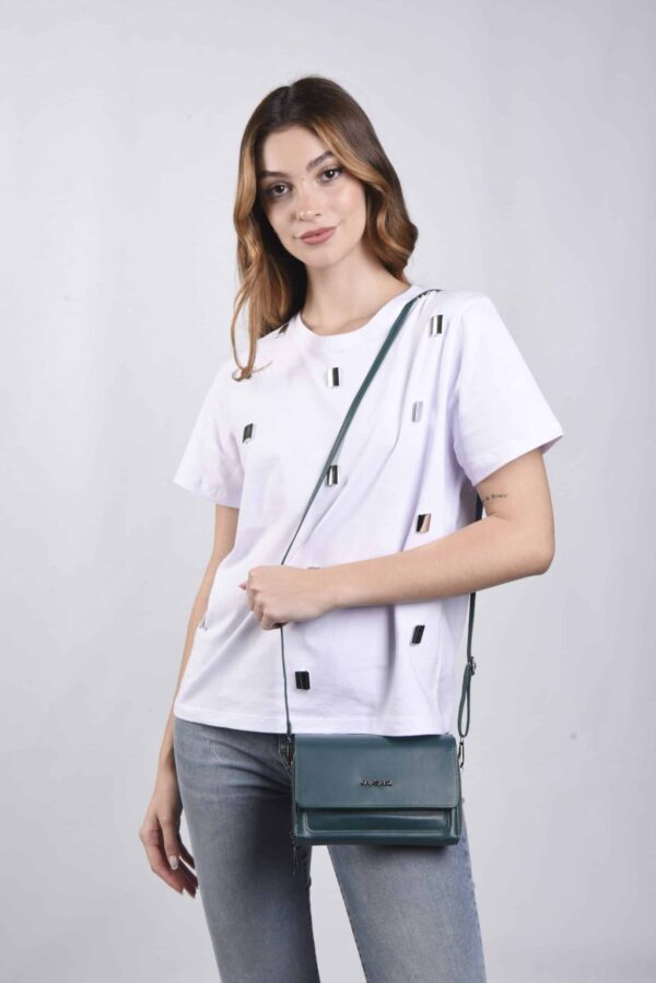 Doble compartimento interno que ofrece un espacio bien organizado para tus pertenencias esenciales, como tu billetera, celular y maquillaje. su tapa frontal asegura tus objetos con un sistema de cierre magnético, que mantiene un estilo limpio y sofisticado.