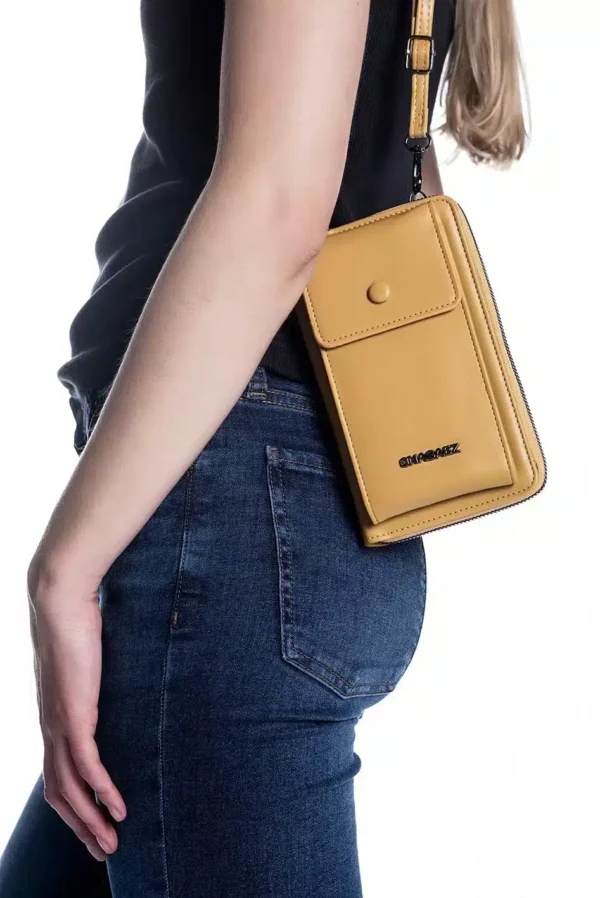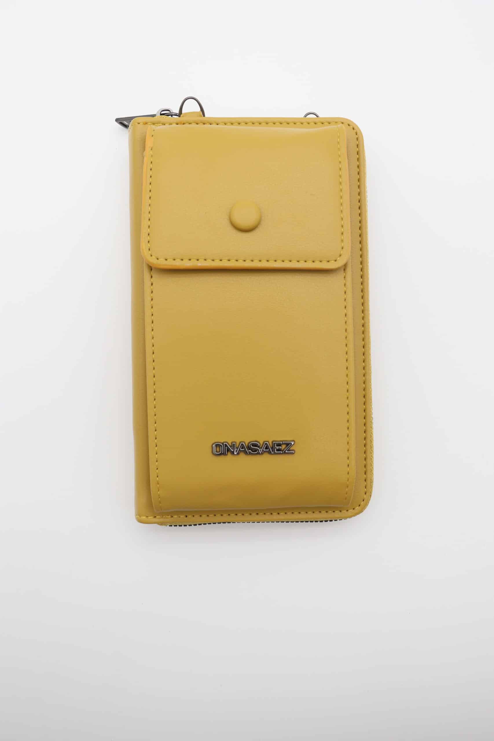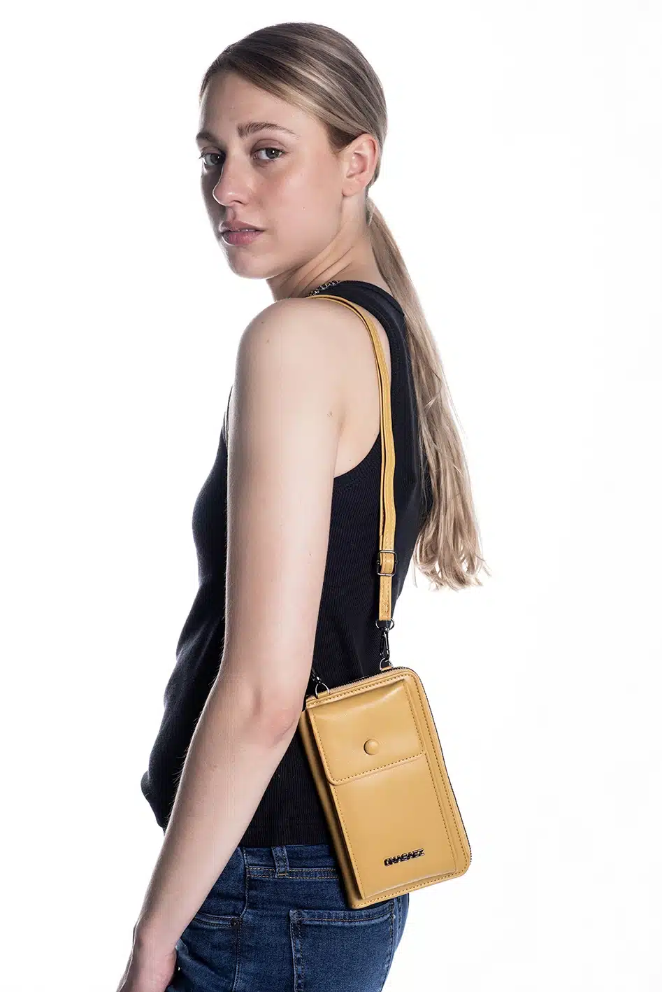 Porta celular confeccionado en pu (simil cuero) color maiz, con logo de marca en el frente.