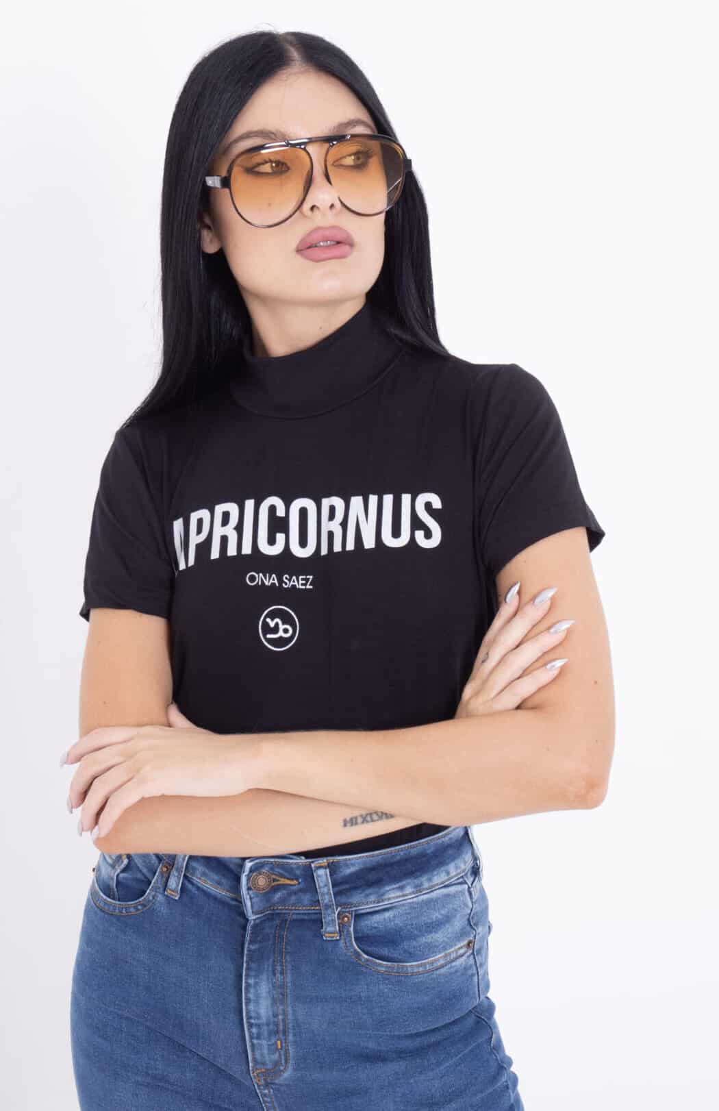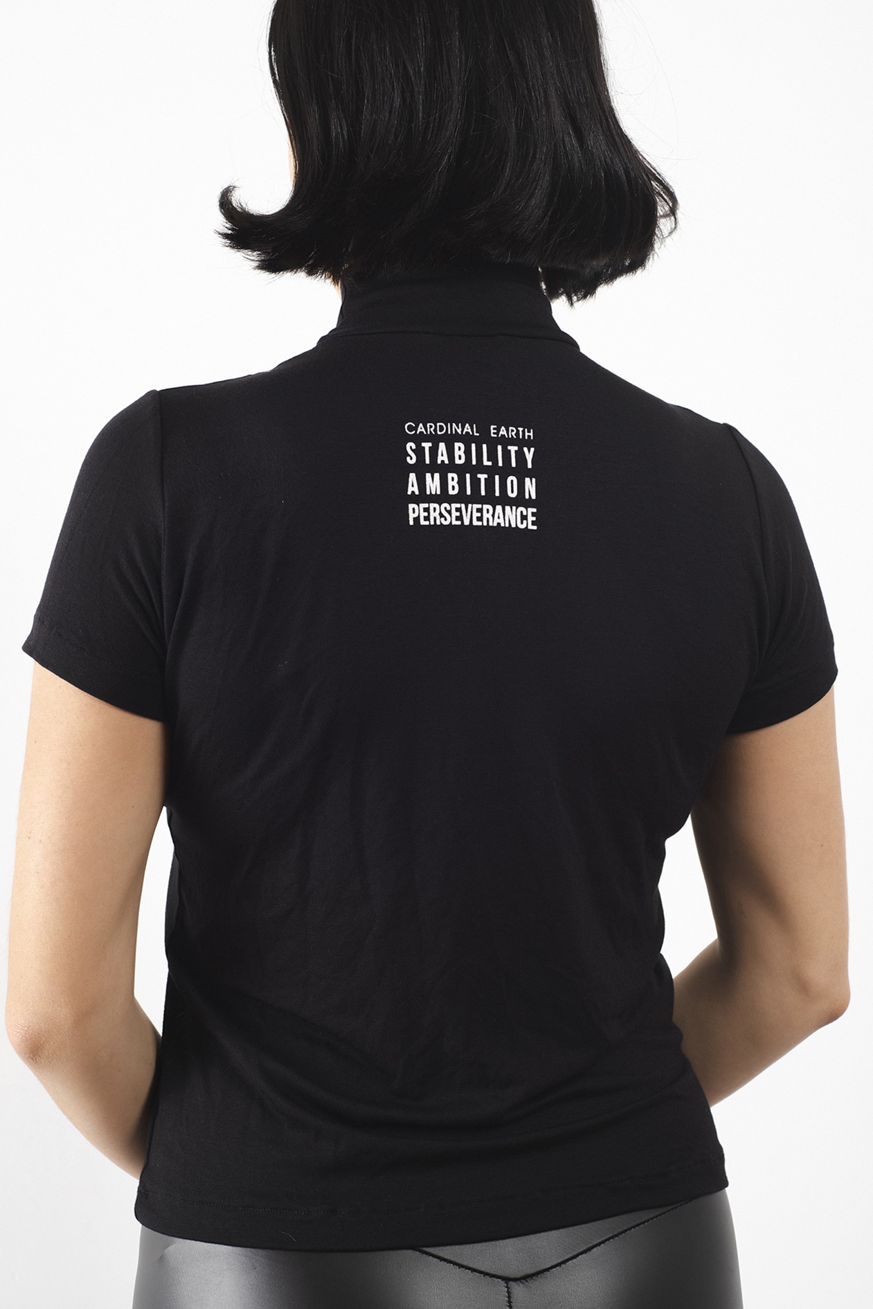 Remera con cuello media polera y manga corta, confeccionada en viscosa con lycra.