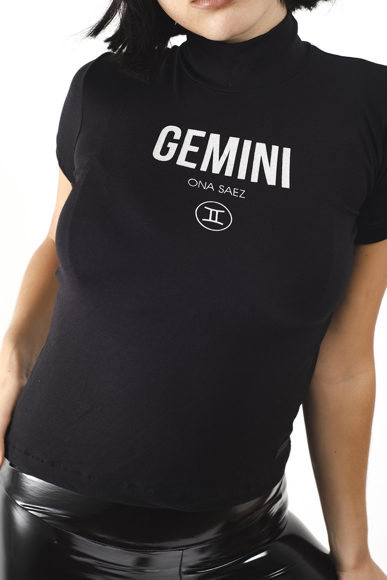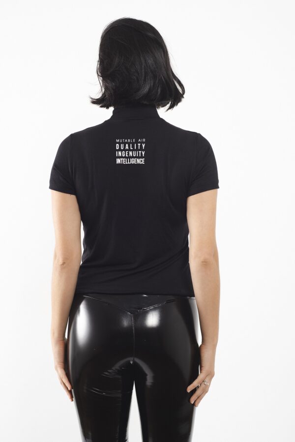 Remera con cuello media polera y manga corta, confeccionada en viscosa con lycra.